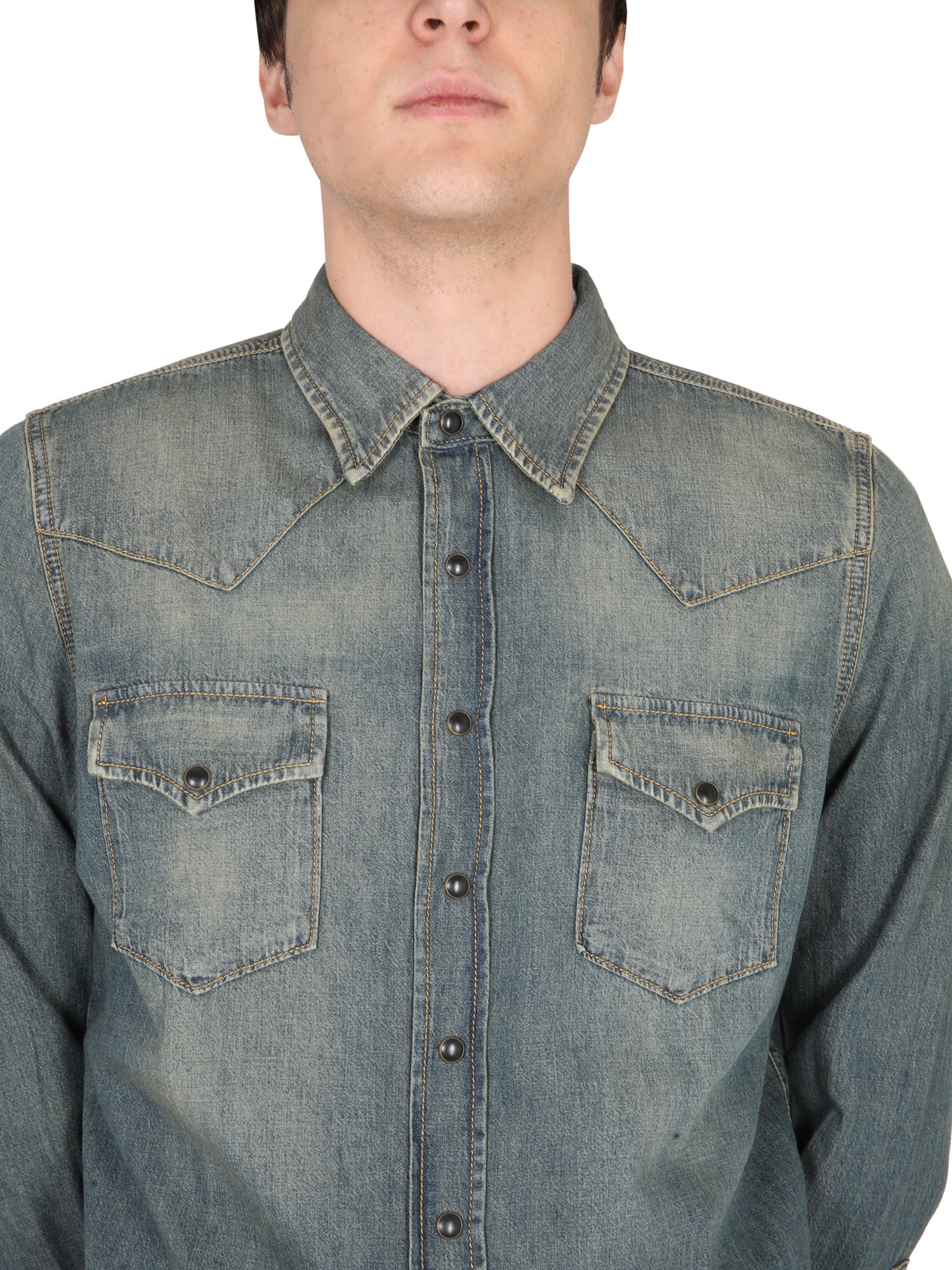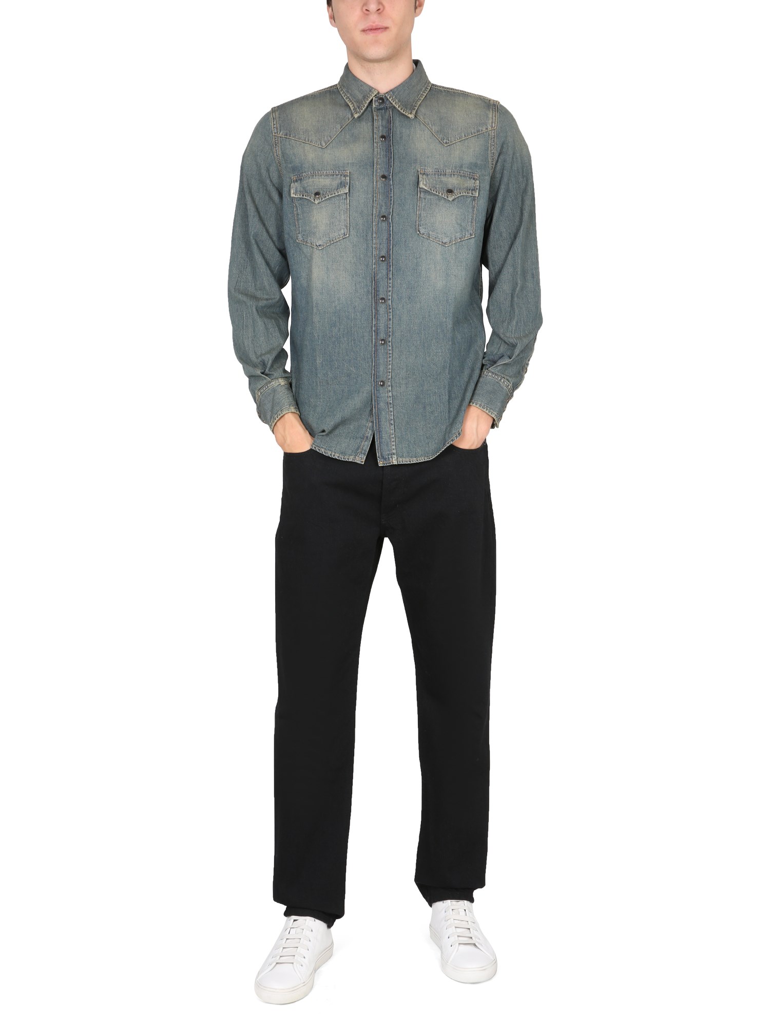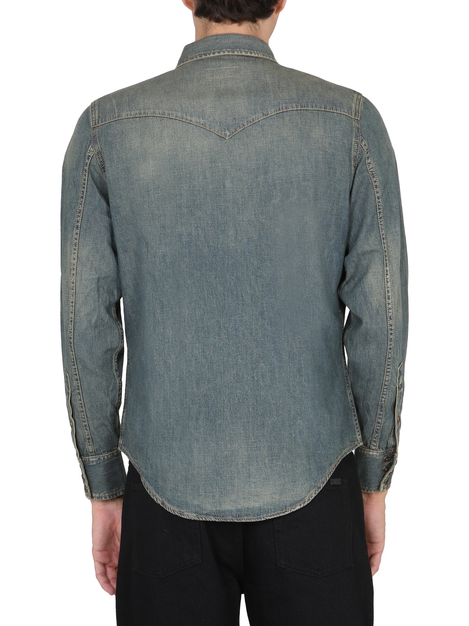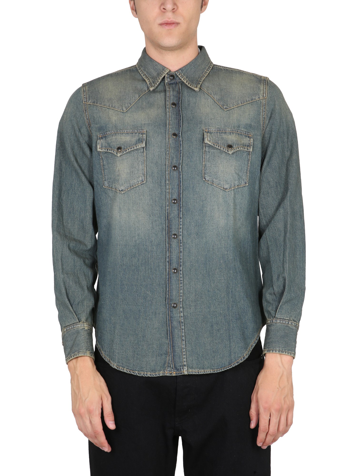 Enjoy the western feel of a denim Western shirt from the house of Saint Laurent. It features a pointed collar, long sleeves with buttoned cuffs, a curved hem, and a front button closure. The shirt has two chest pockets to keep your essentials and it's a great fit for all body types.