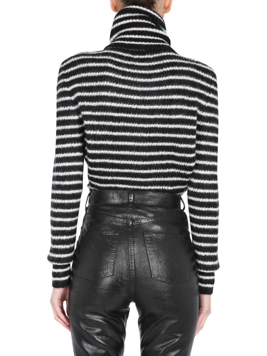 This beautiful Saint Laurent Striped Sweater will keep you toasty all winter long. This sweater looks really stylish and voguish with its polo neck. It features a regular fit, striped pattern and is constructed of a mohair, polyamide, and wool blend that will keep you warm and stylish. To achieve a stylish and trendy style, pair this sweater with jeans, joggers, pants, shorts, and other bottoms.