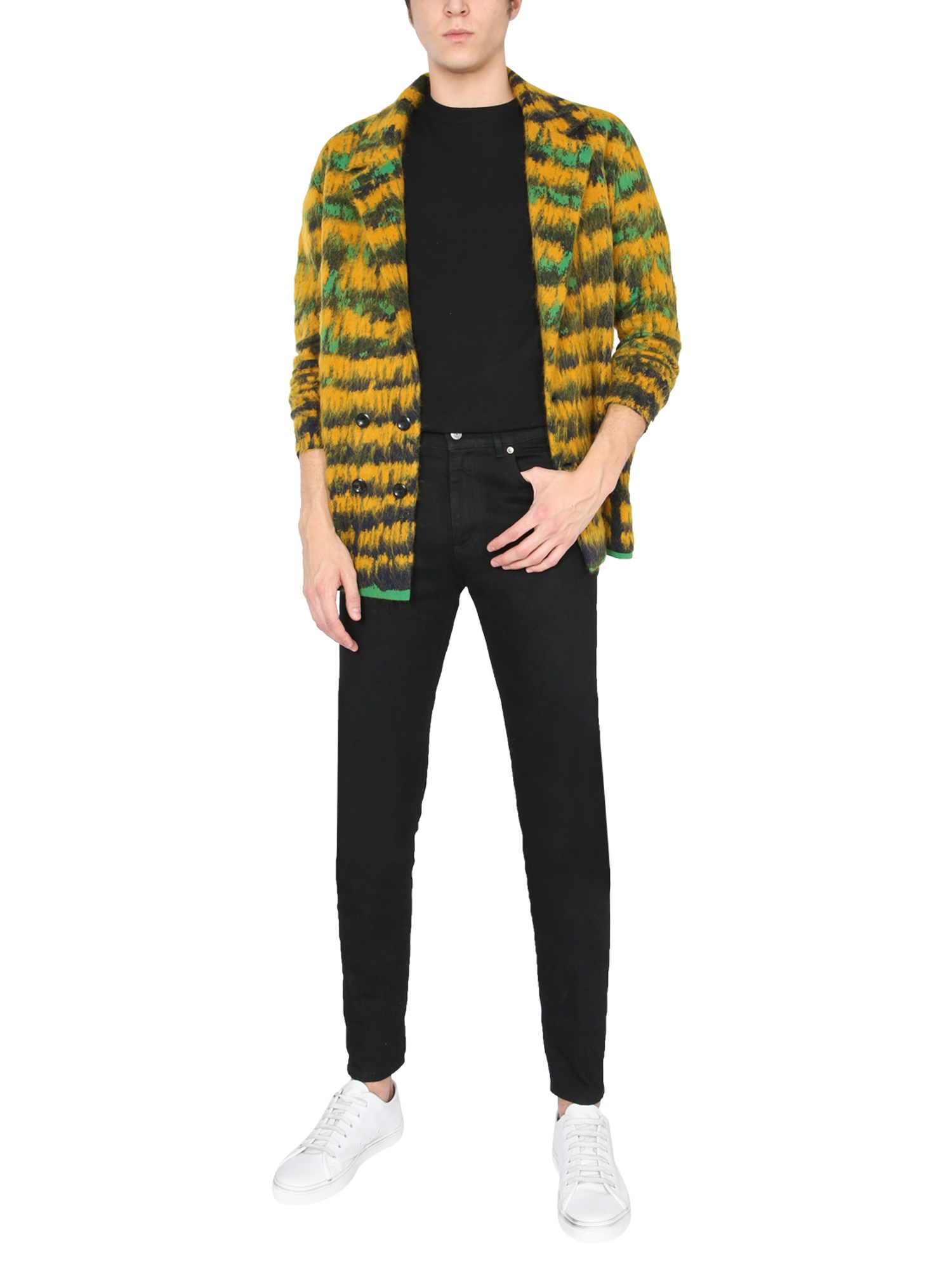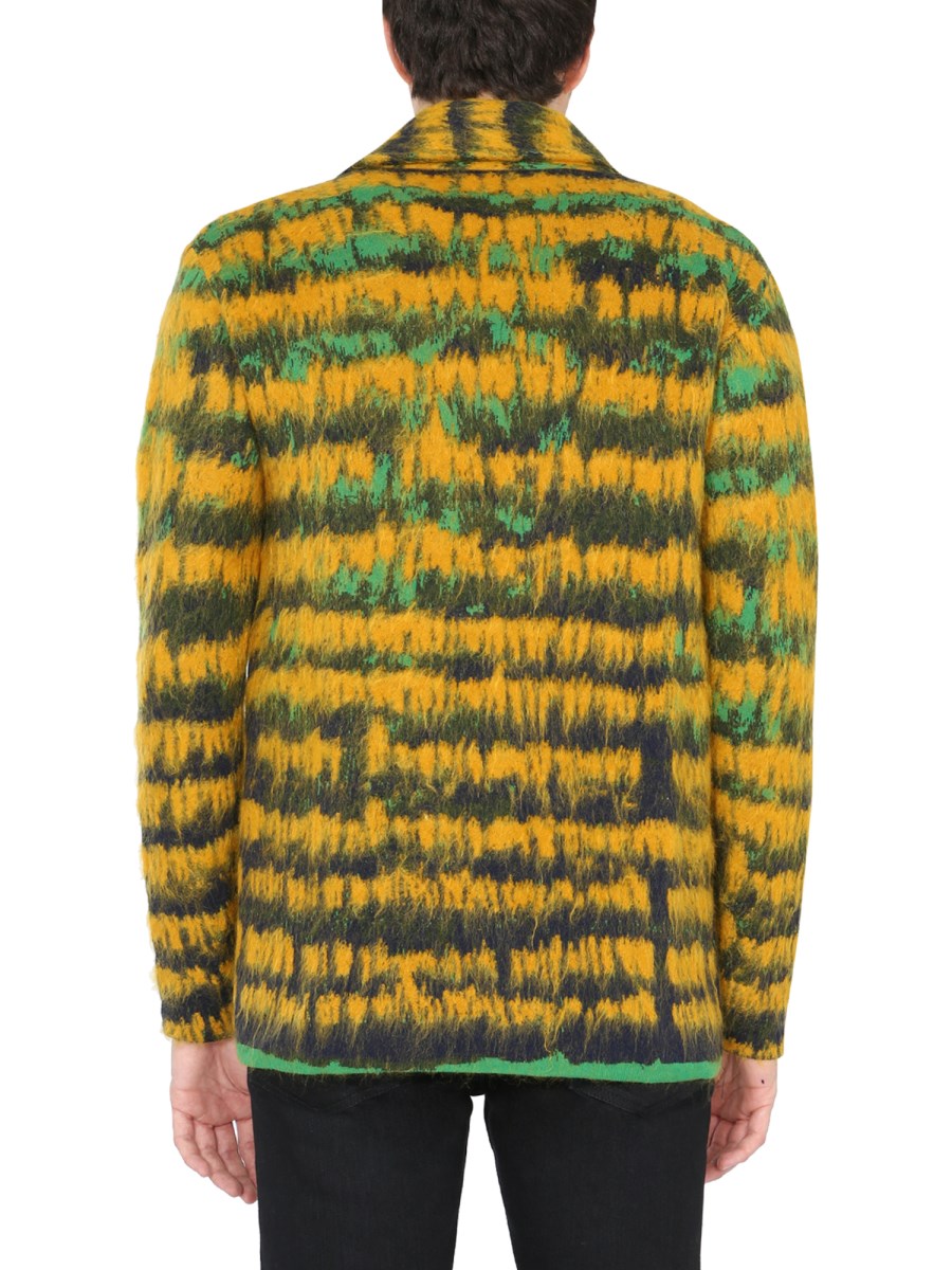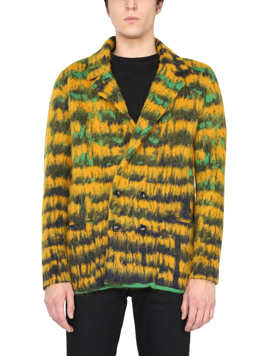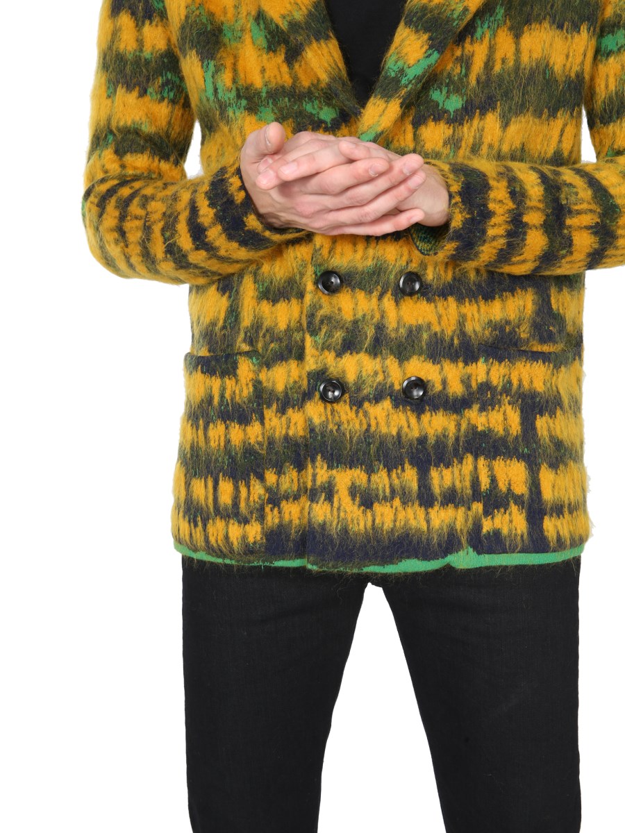 An absolute must-have for any wardrobe, this double-breasted mohair jacquard jacket by Saint Laurent is the perfect addition to any fall or winter wardrobe. A mohair jacquard fabric with a soft touch, this coat is made of 66% cotton, 22% mohair, 10% polyamide, and 2% wool. The long sleeves and button-up front give this jacket a timeless, classic look that will never go out of style.