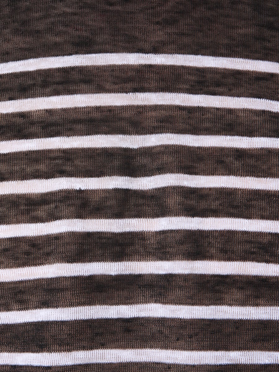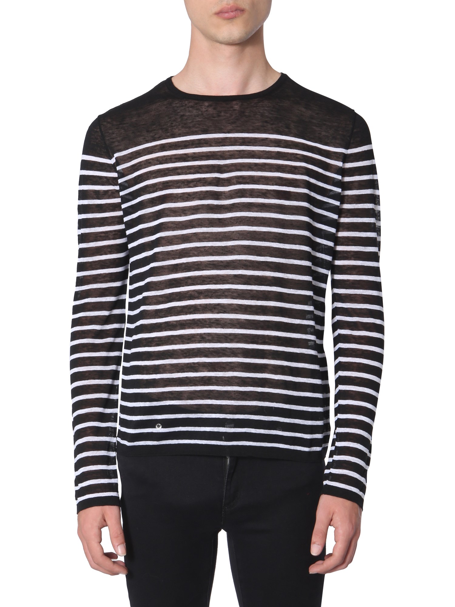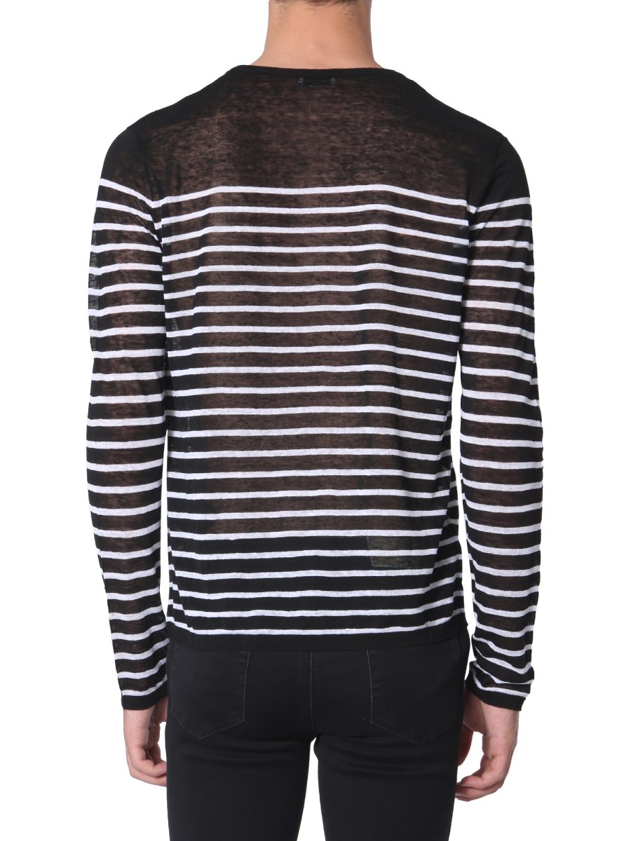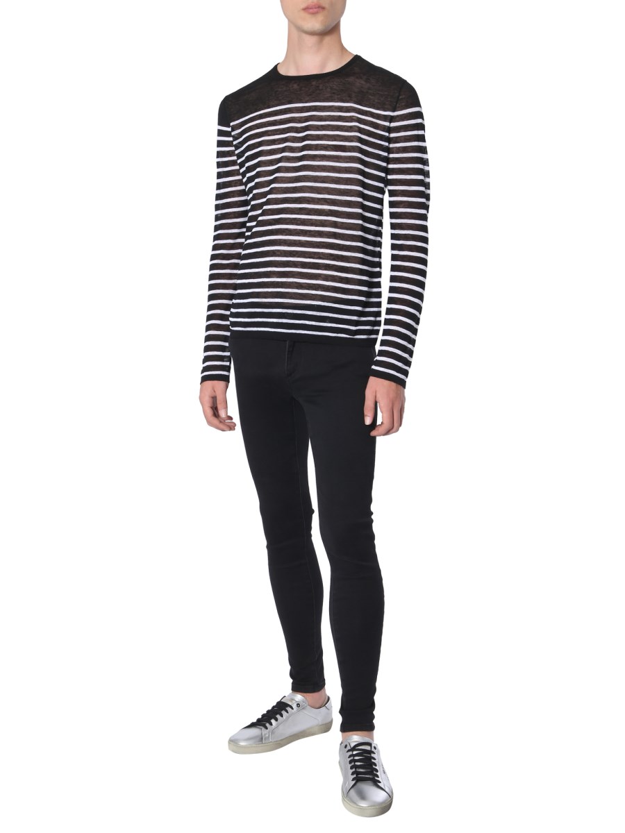 Embrace the ongoing style statement by wearing this striped T-shirt from the house of Saint Laurent. Having a striped pattern on all-over the surface, the T-shirt is well-suited for any casual occasion. It features a round neck with full sleeves that provide it a classic look. It is made from linen and silk that feels soft against your kin.