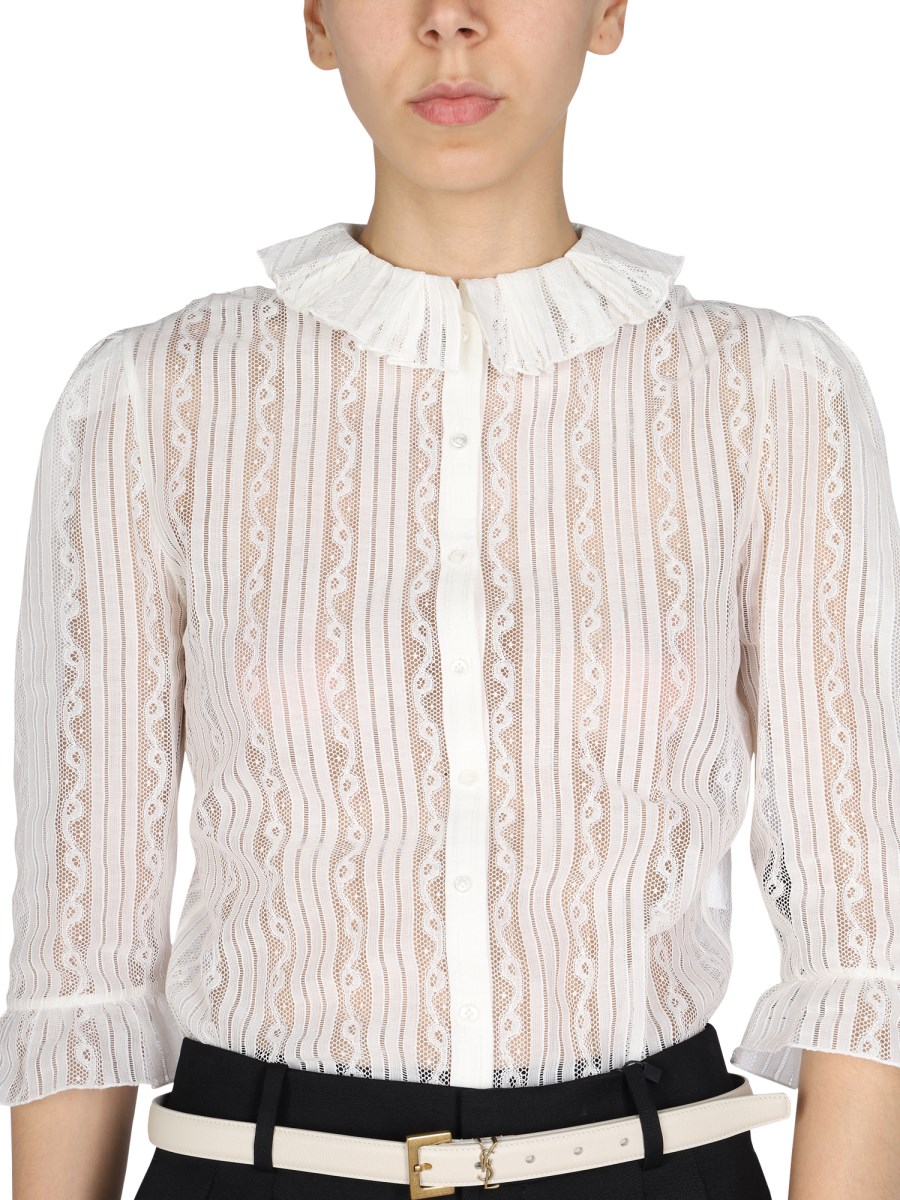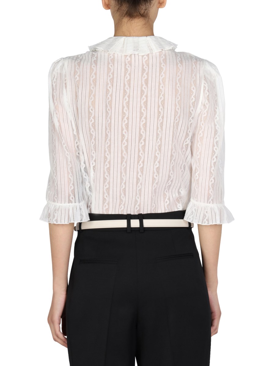 - MANDARIN RUCHING COLLAR - FRONT BUTTON CLOSURE- RUCHING CUFFS - 90% COTTON, 10% POLYAMIDE- MODEL IS 185 CM TALL AND WEARS SIZE 38 FR