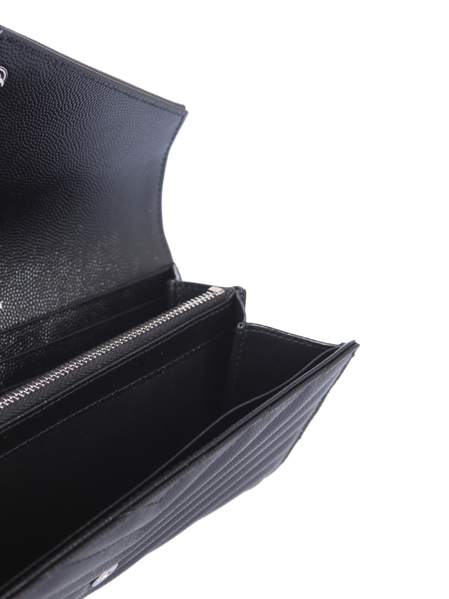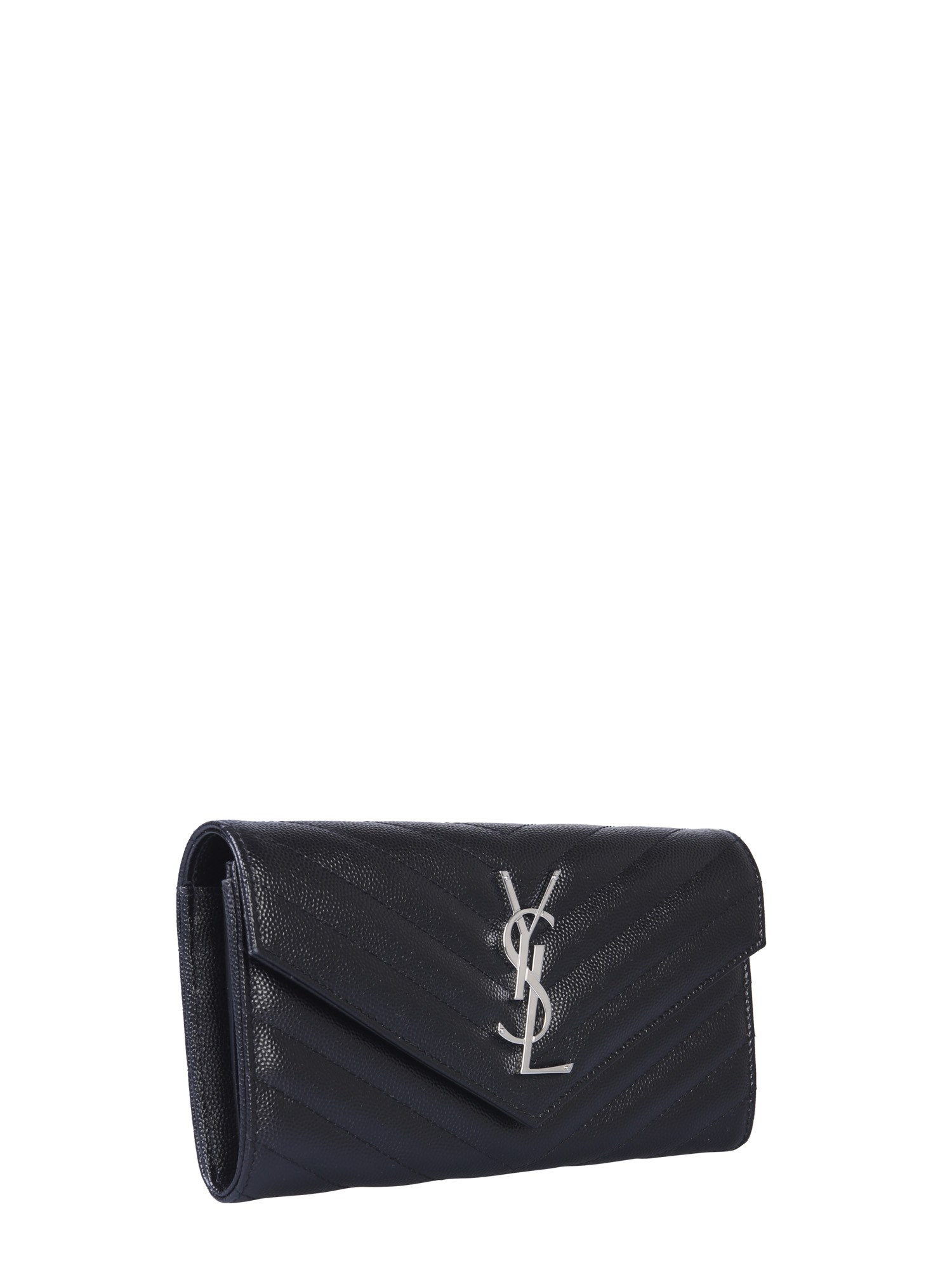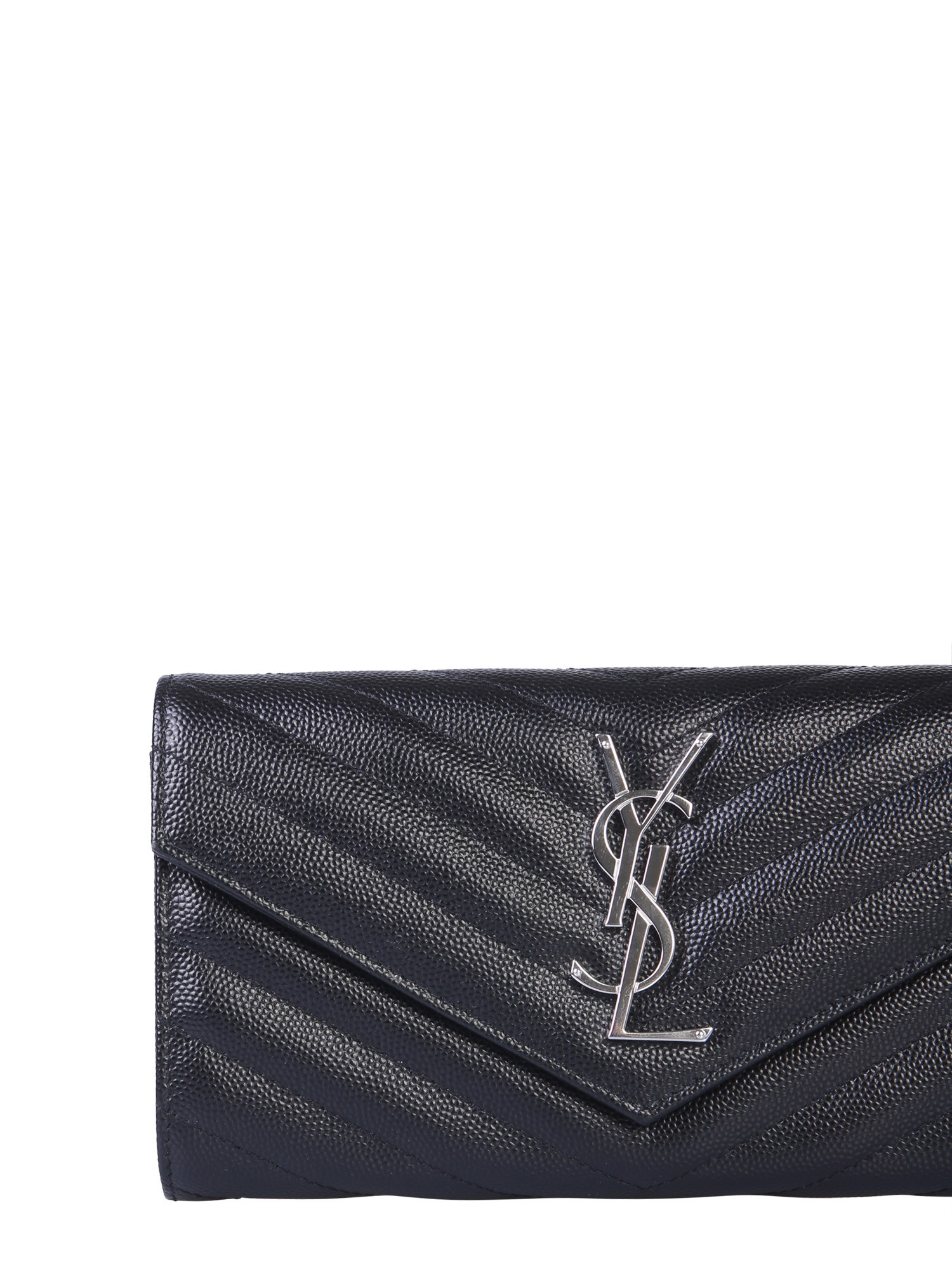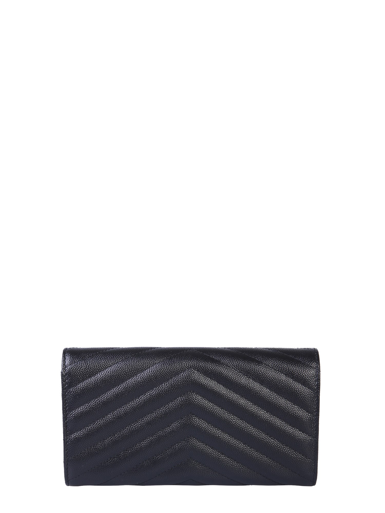 Organize your belongings safely in the monogram wallet from Saint Laurent. This classy and gorgeous wallet is made of 100% leather for smooth texture and easy maintenance. It has an automatic button and flap closure for safety. The bag includes two banknote pockets and two card holders. It has a central zip pocket to store coins.