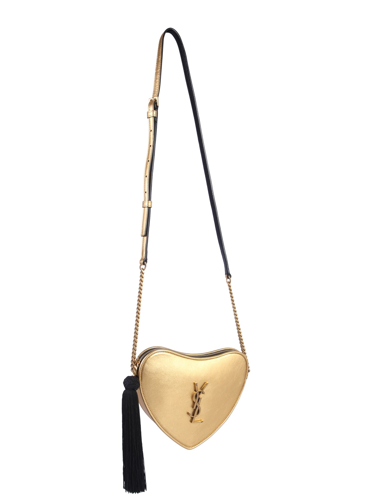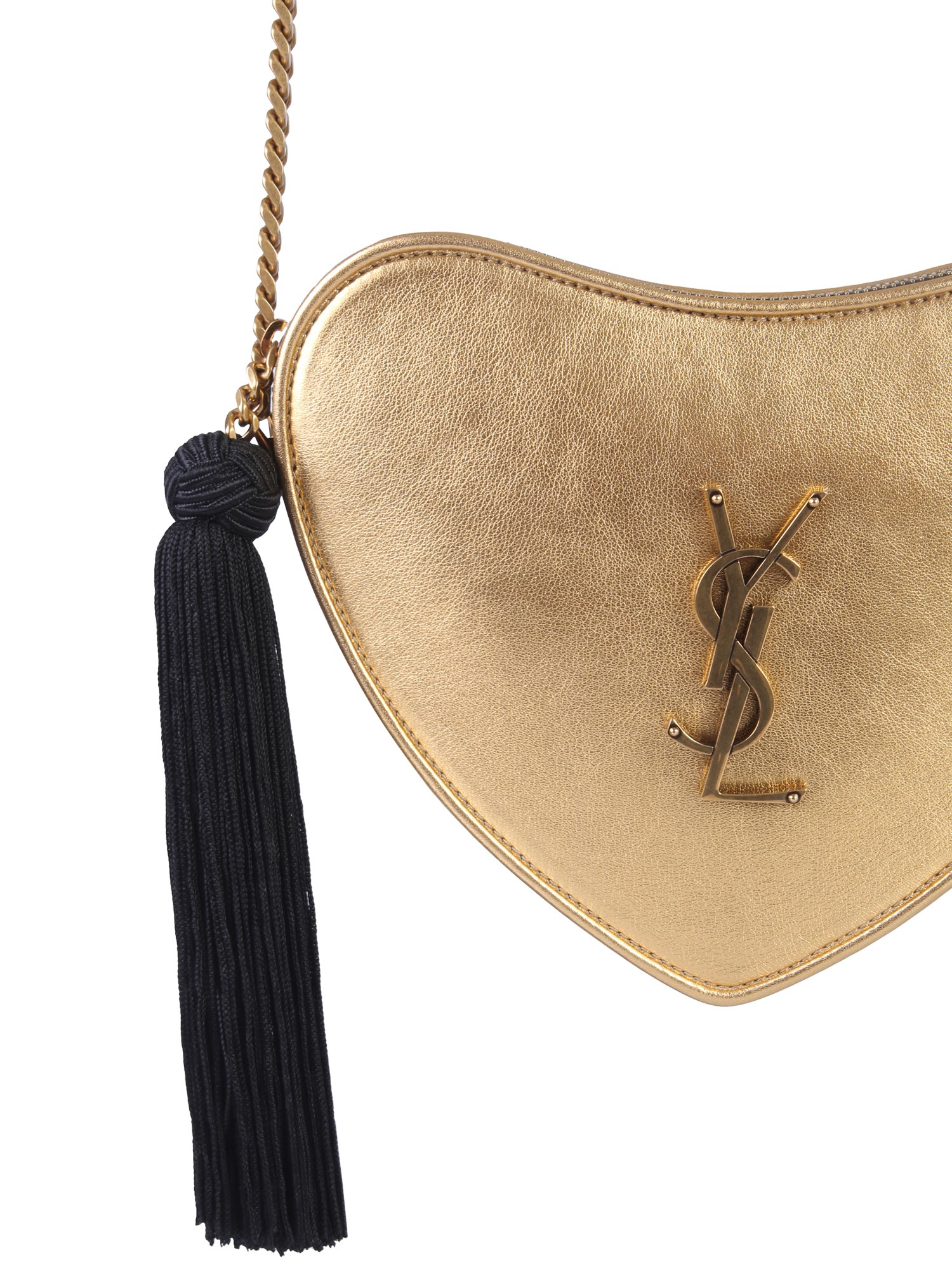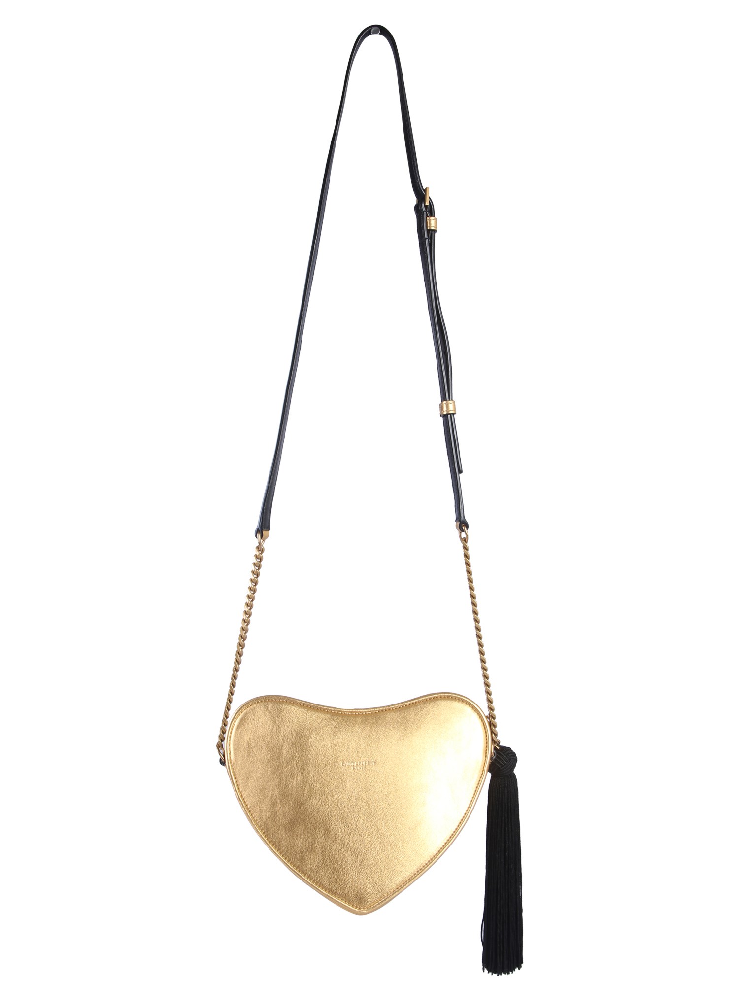 Make an exciting addition to your accessory collection with this heart bag with shoulder strap from Saint Laurent. It is made of calf leather that makes it enduring and gives it a shiny finish. Decorated with metallic initials and a large tassel, this heart-shaped bag looks stylish, attractive and glamorous.