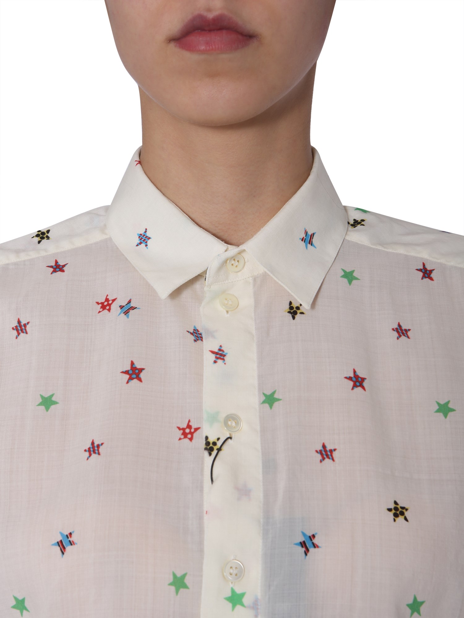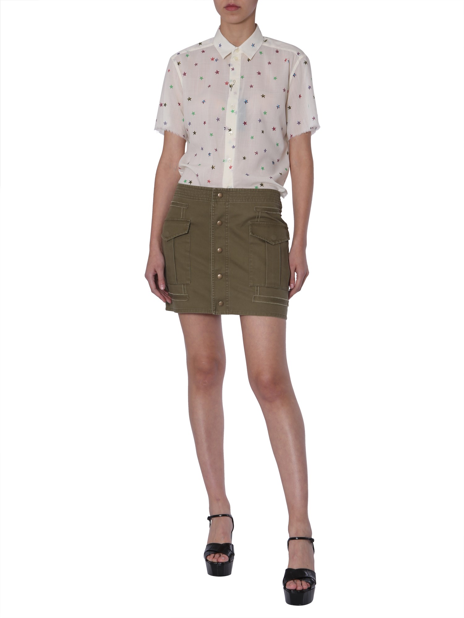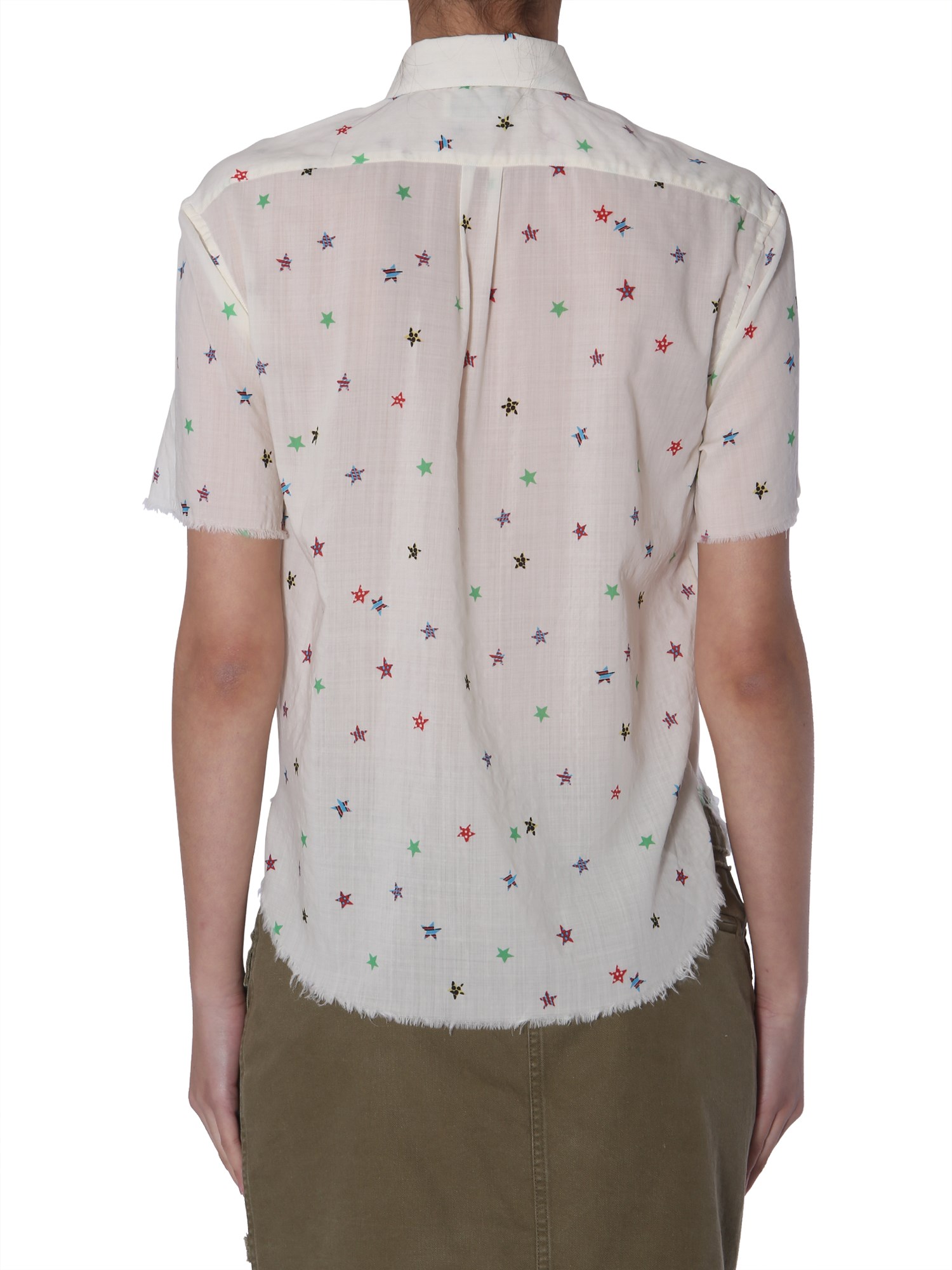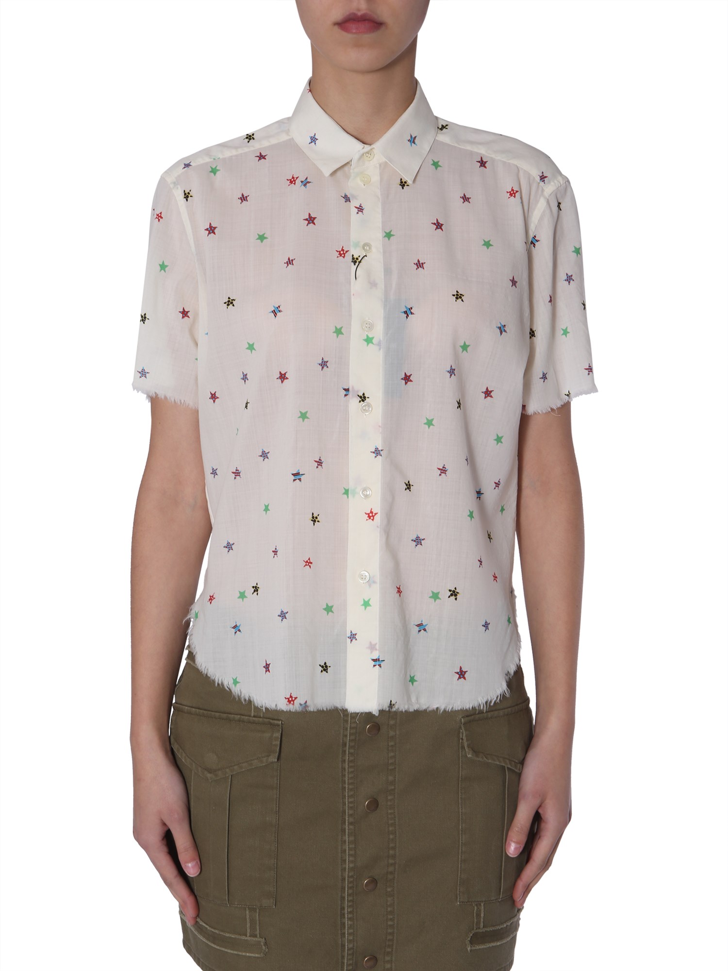 Earn appreciation with a minimal yet stylish look featured by a short sleeved shirt from the house of Saint Laurent. The star print on the shirt gives it a feminine touch. Its frayed rims allows you to pair it with a short skirt and heels. The front closure has buttons for easy fastening whereas a classic collar looks edgy. The shirt is made using wool and feels soft against your skin.