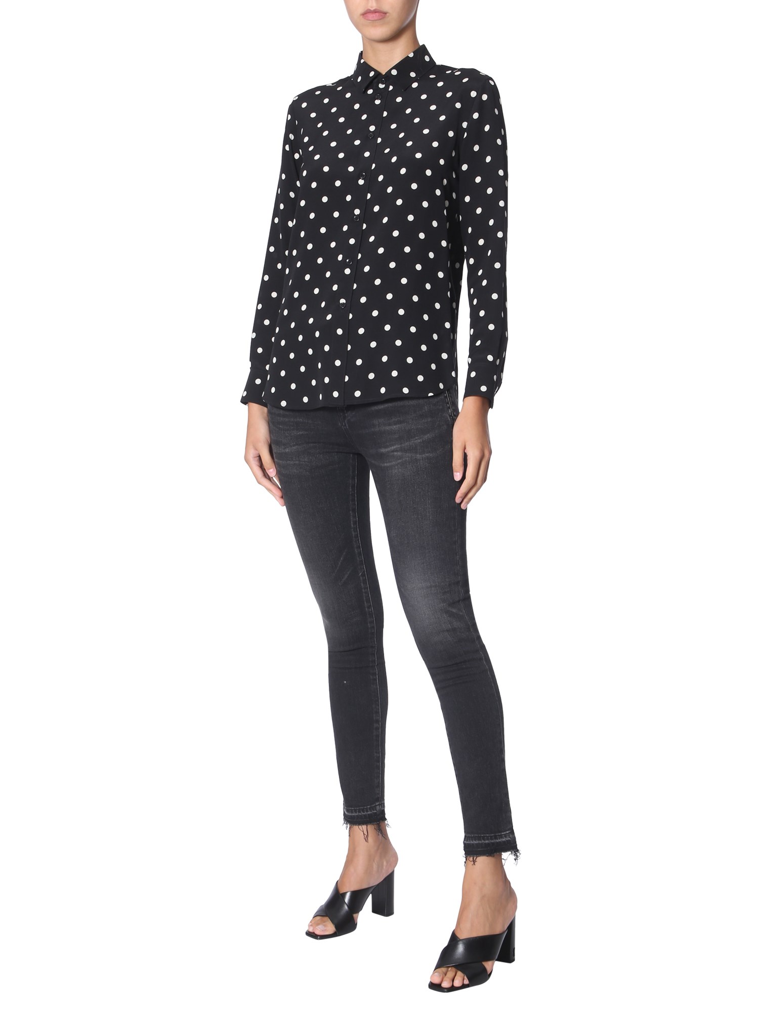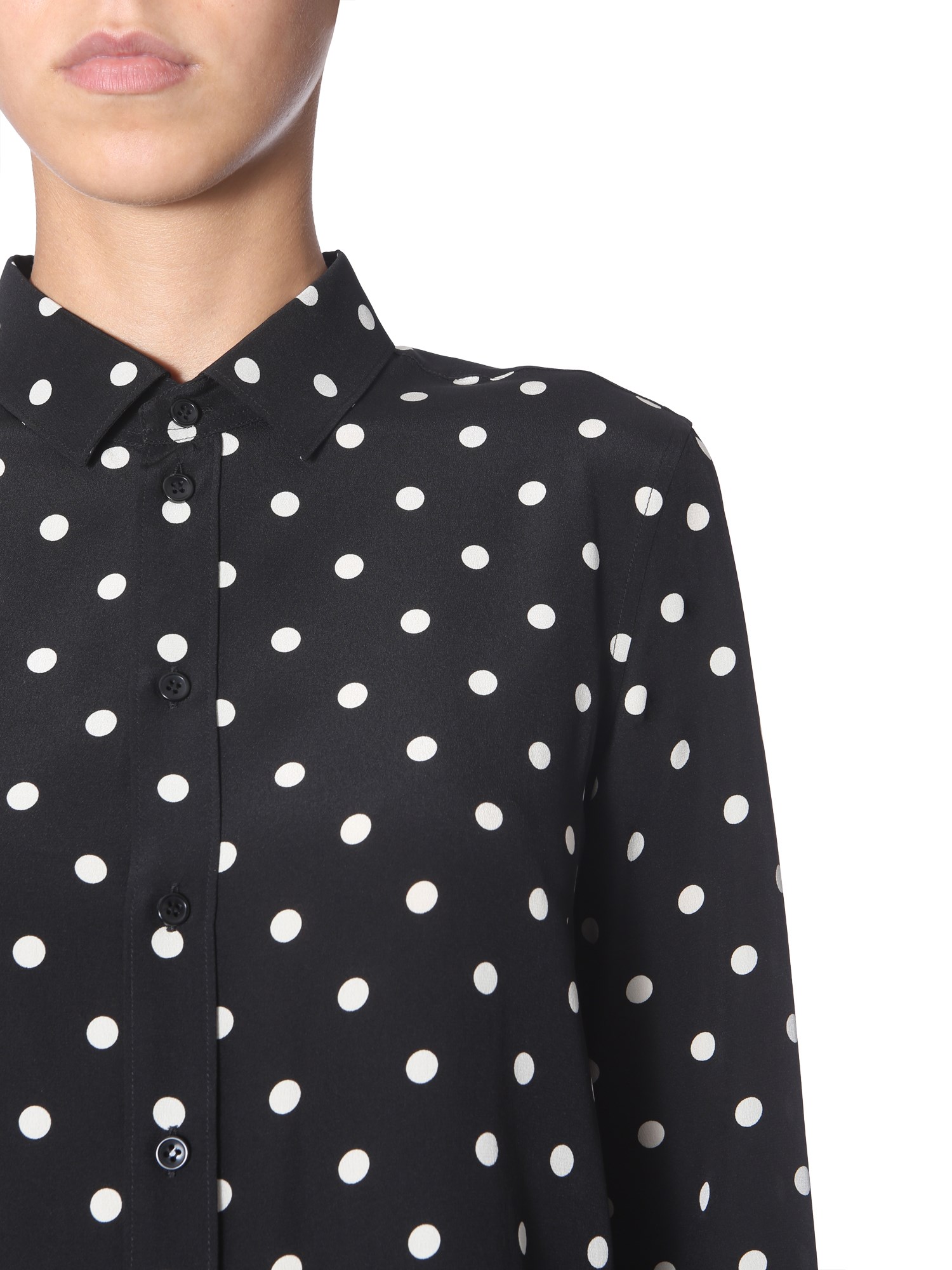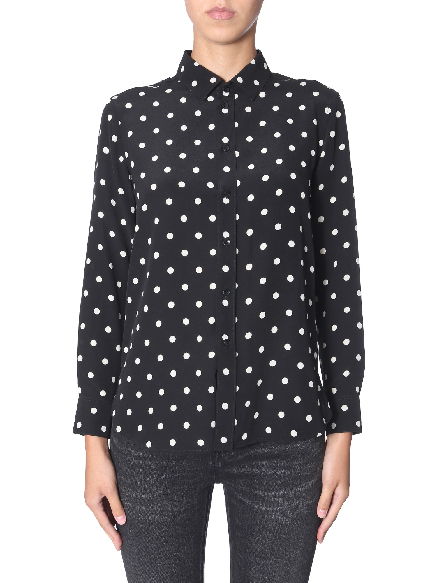 Upgrade your summer wardrobe with this polka dots shirt from Saint Laurent. It is made of 100% pure silk fabric that can be worn for long hours without any irritation. This bold colour beauty has a classic collar with button-down closure. Just put it on with a pair of shorts for an awesome look.