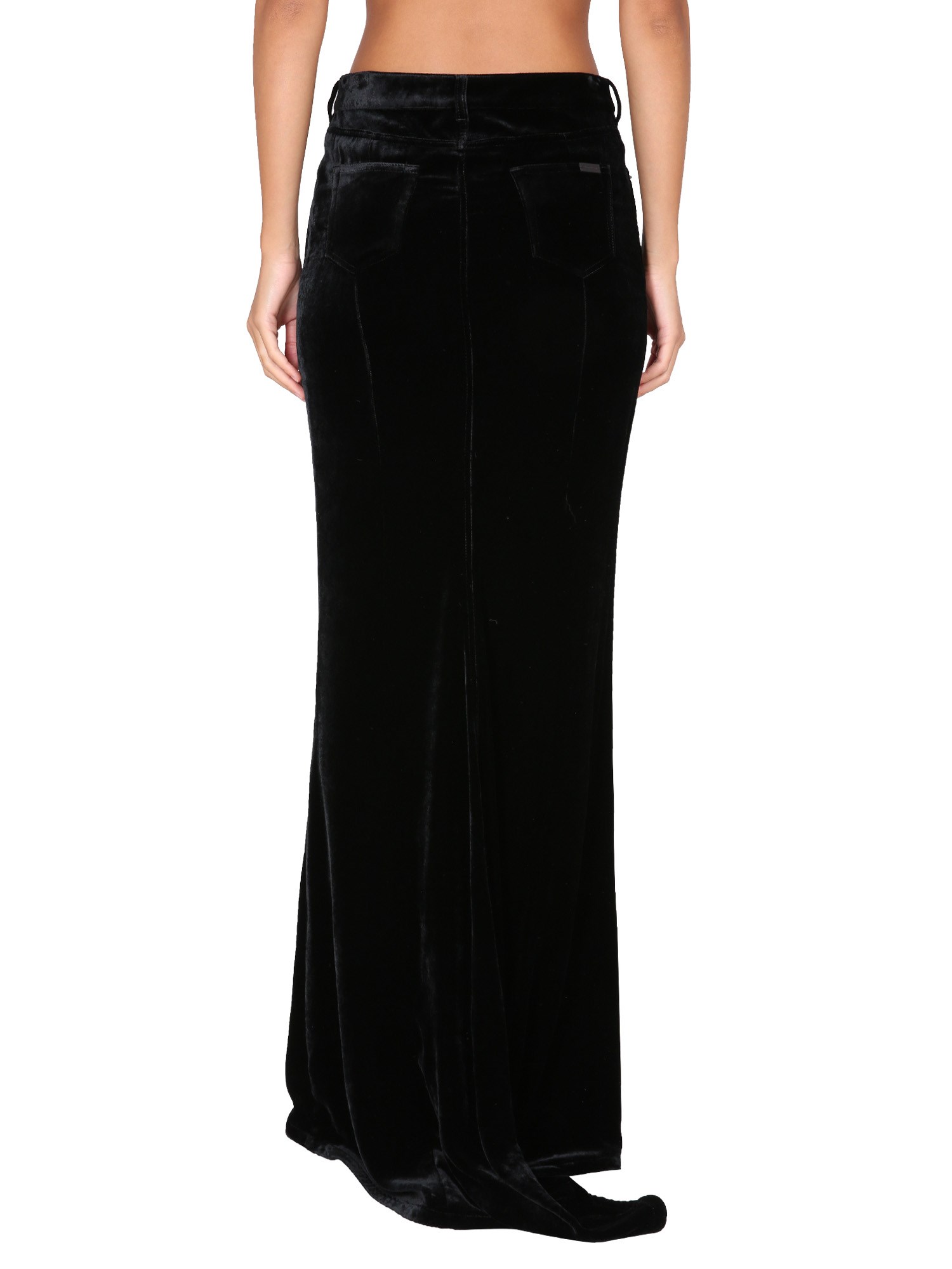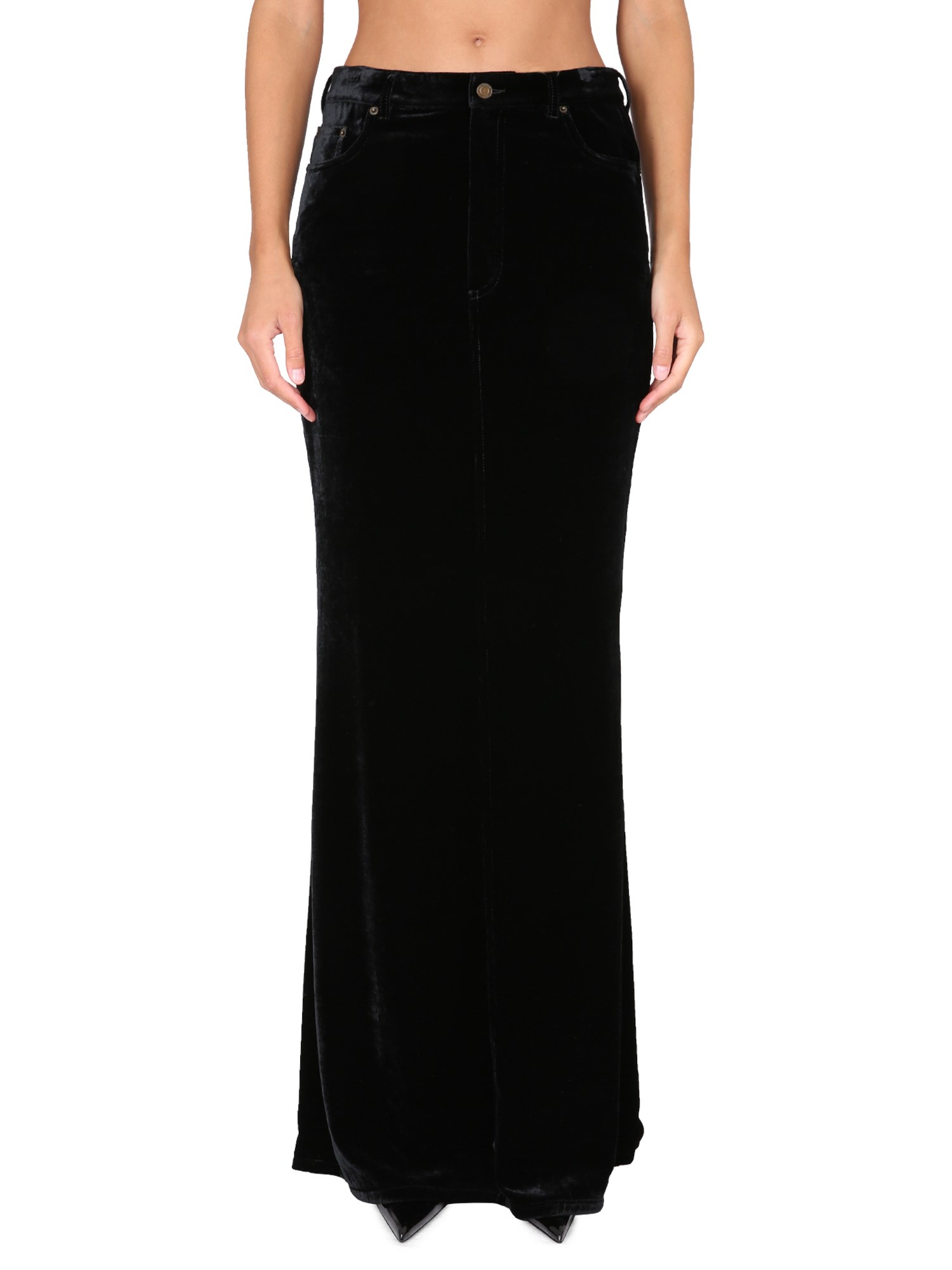 A beautiful and elegant piece of clothing, the sheer long viscose velvet skirt from Saint Laurent is perfect for your special occasion. The shiny zipper and button front closure makes this piece stand out from the crowd. The velvet skirt has a flowy silhouette and is perfect for the office or for a date.