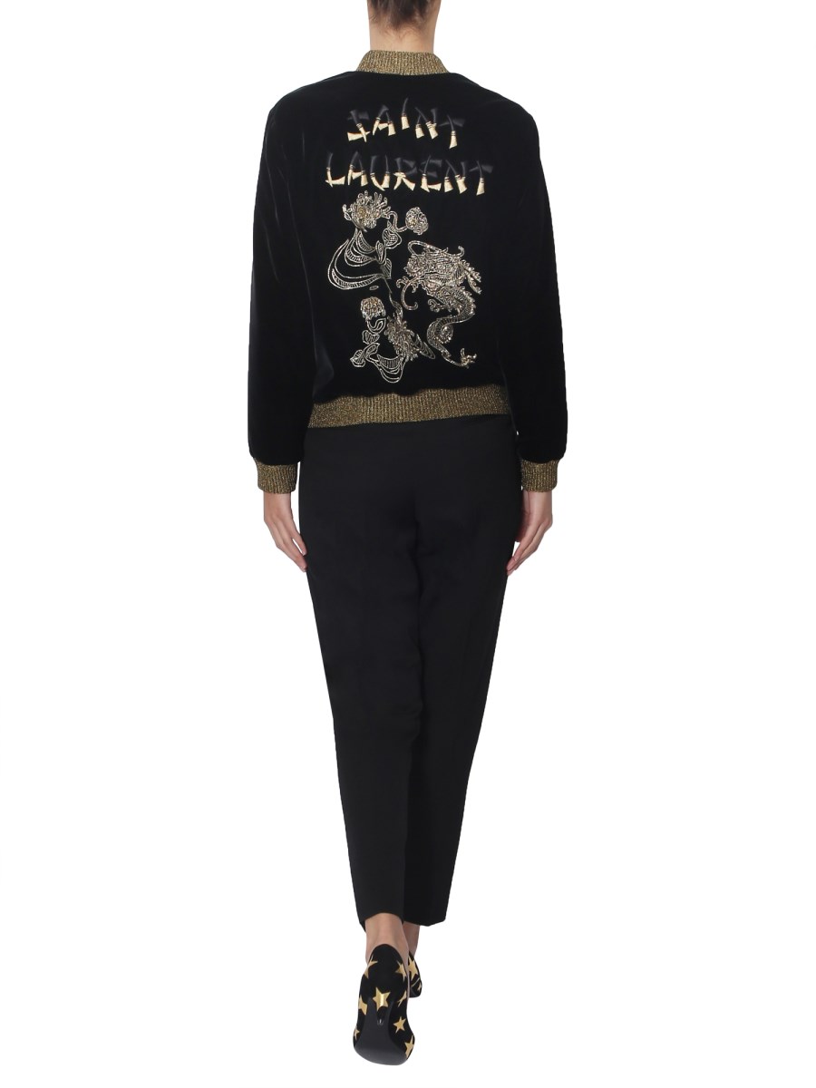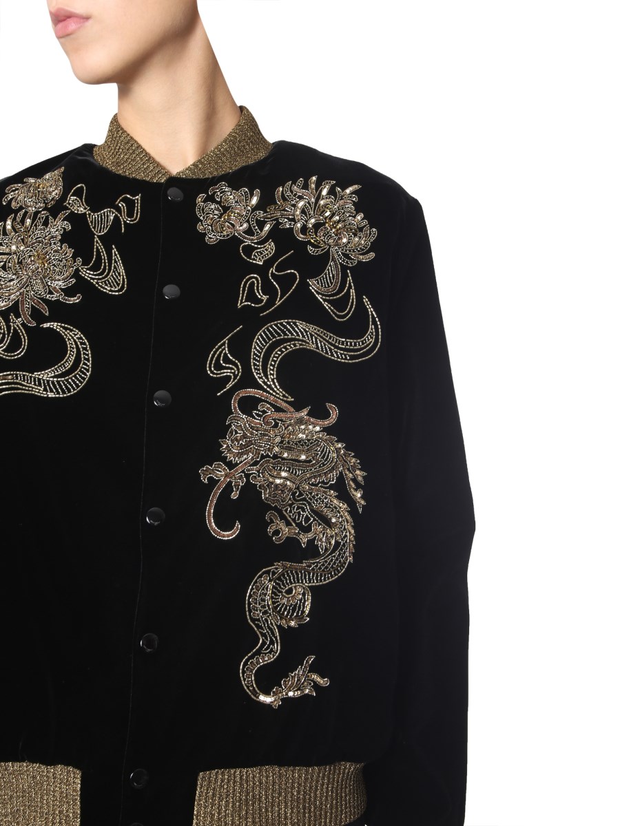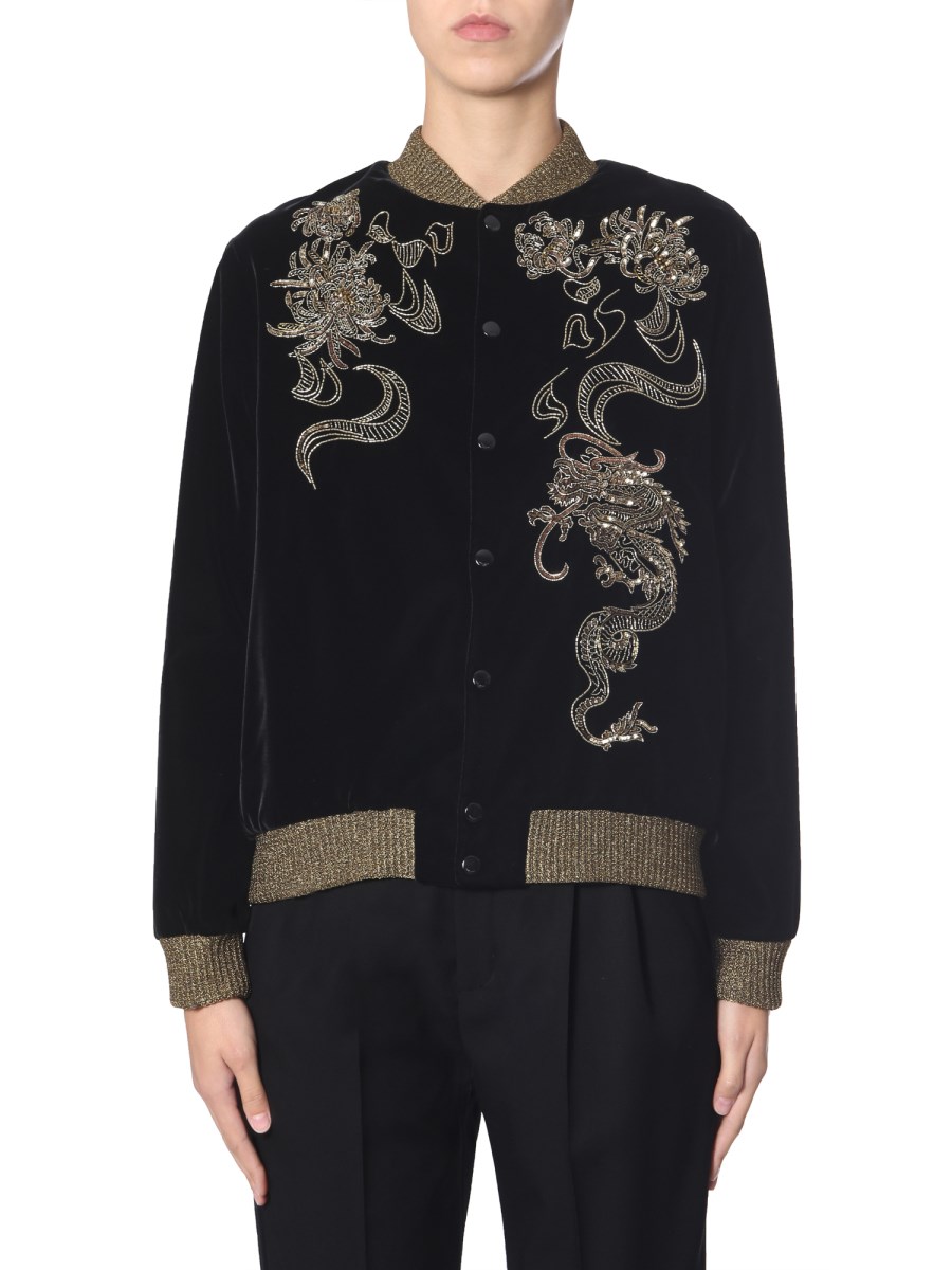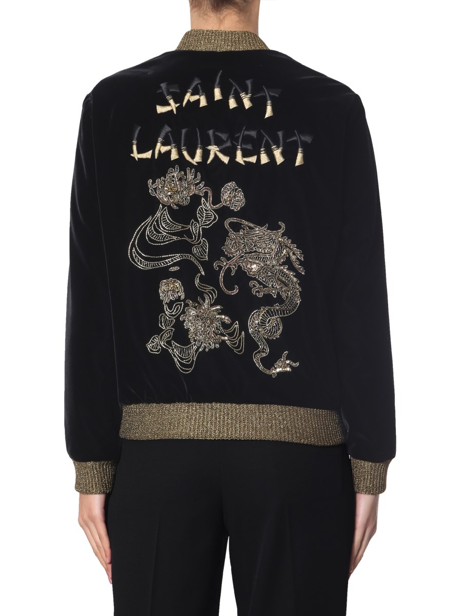 If you like to lock everybody’s eyes on you, then the Varsity velvet bomber by Saint Laurent is the key. This bomber is made with a blend of viscose and cupro that feels soft on the skin and keep you at ease. The button closure at front is designed to keep you covered whenever you go out. The embroidered designed makes this bomber ideal for casual outings.