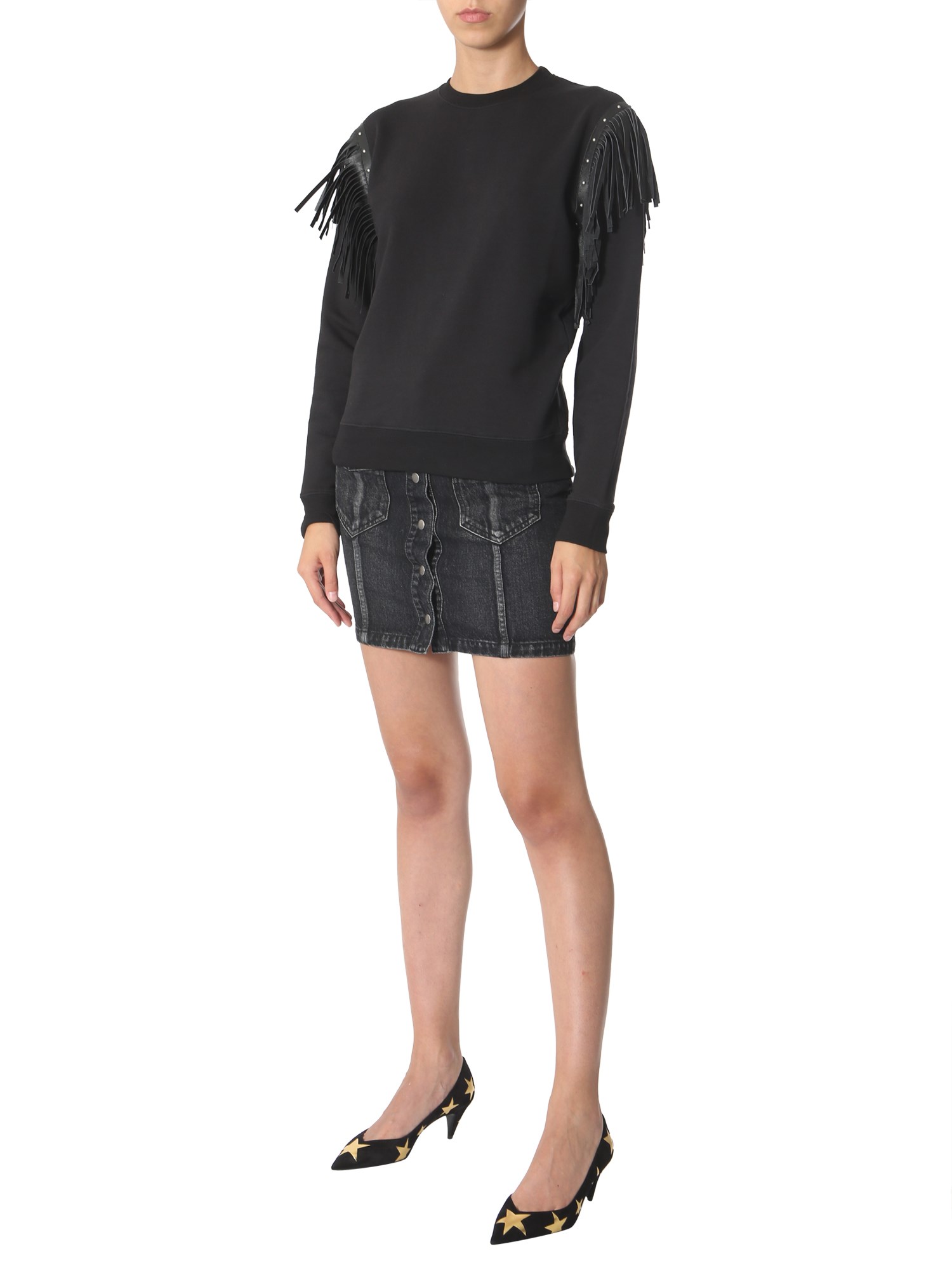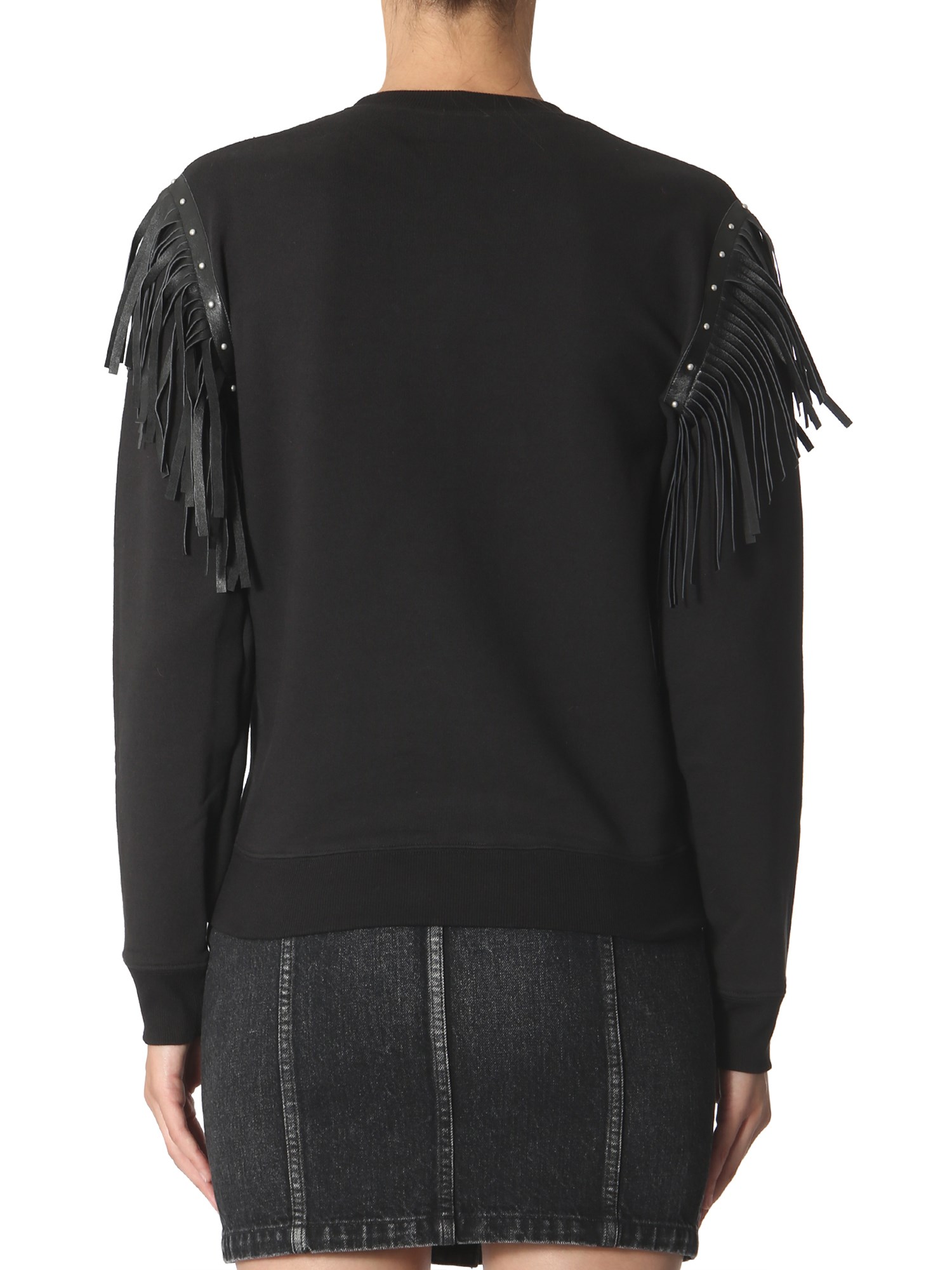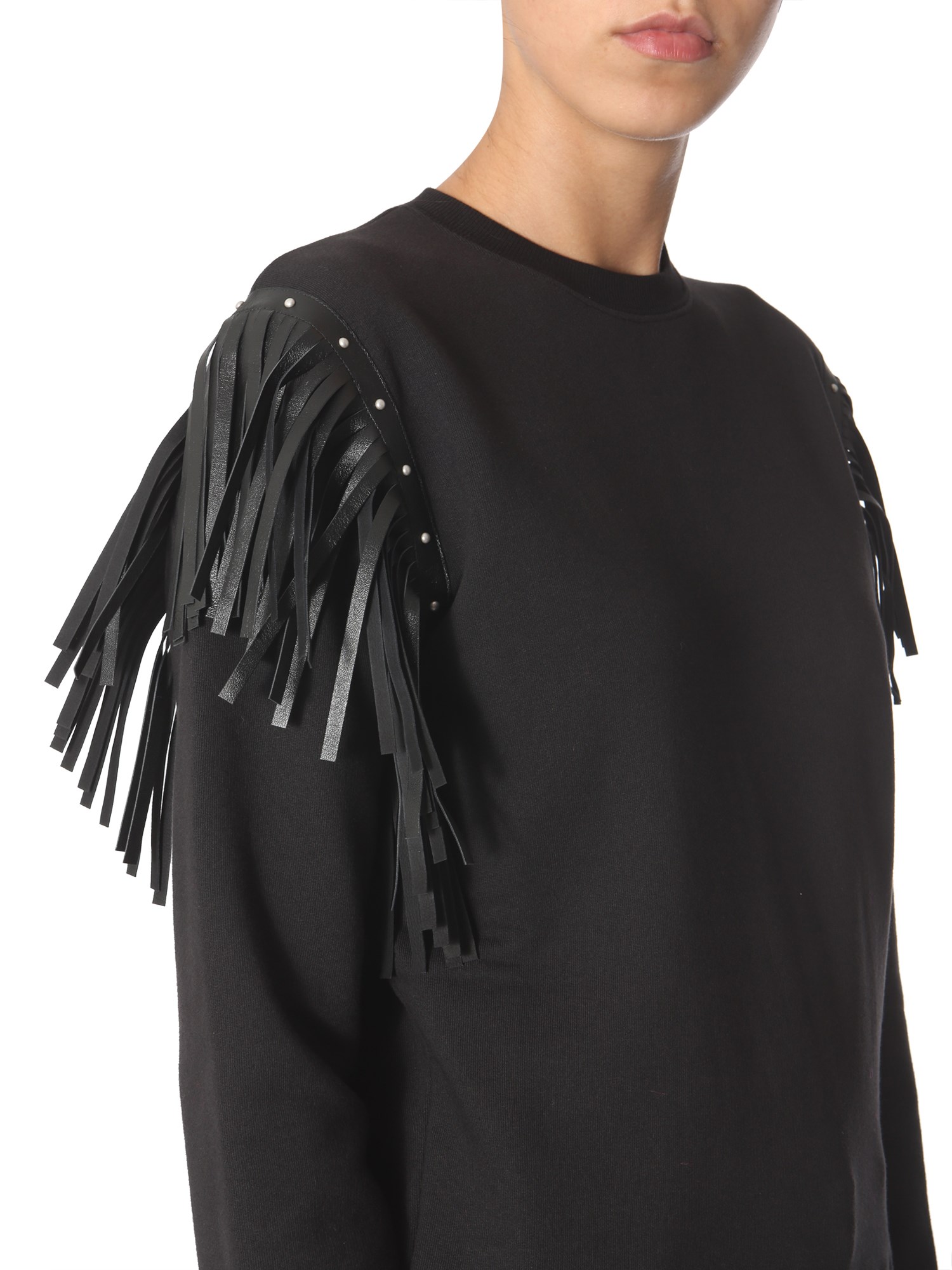 Score high on the fashion meter with this sweatshirt neck from Saint Laurent. The sweatshirt is made from fine quality cotton with brushed interior that will keep you warm throughout the day. The leather fringes on the shoulder provide an attractive and beautiful touch to its design. Club it with a pair of black denim jeans and sneakers for a complete trendy look.