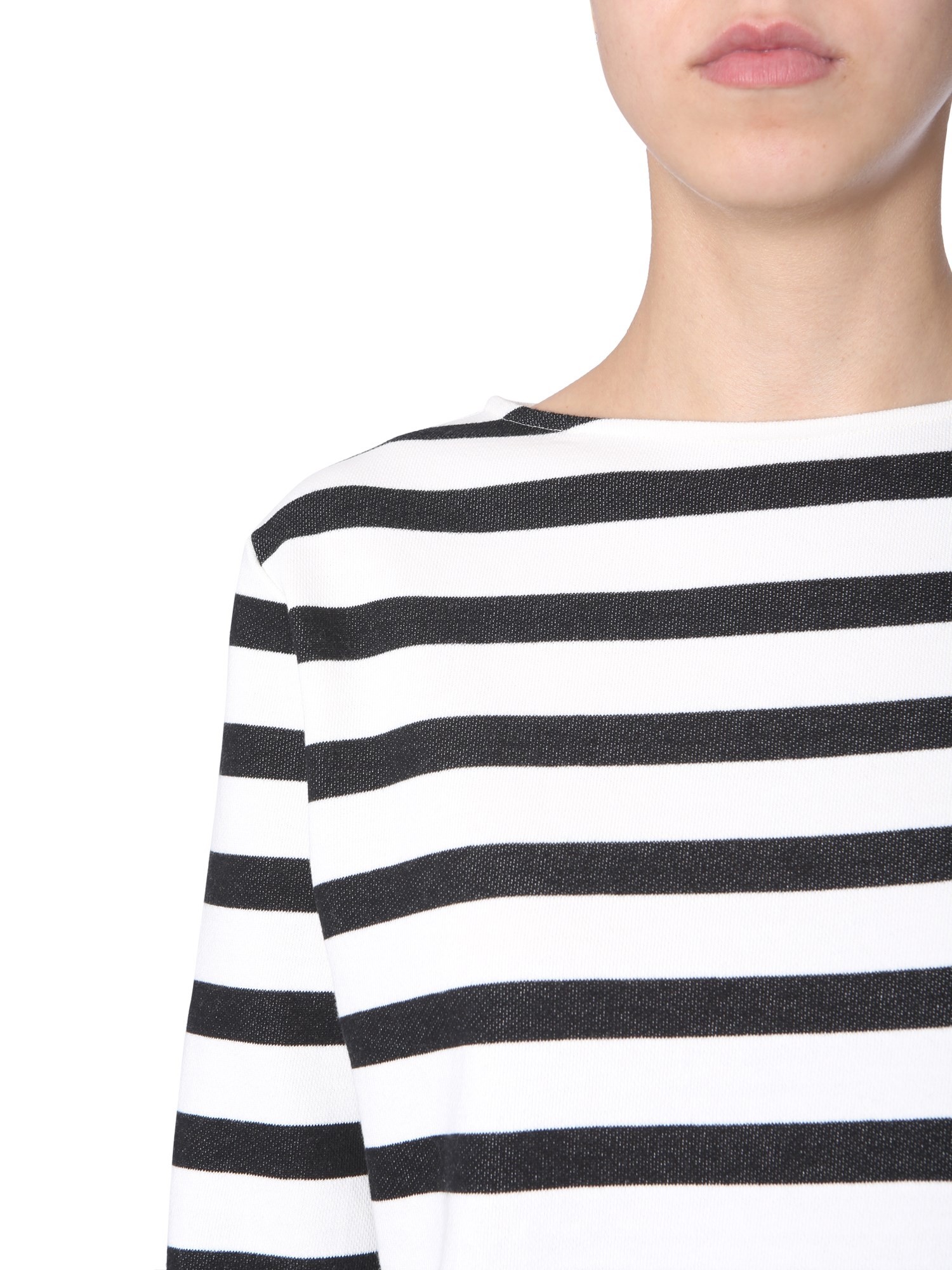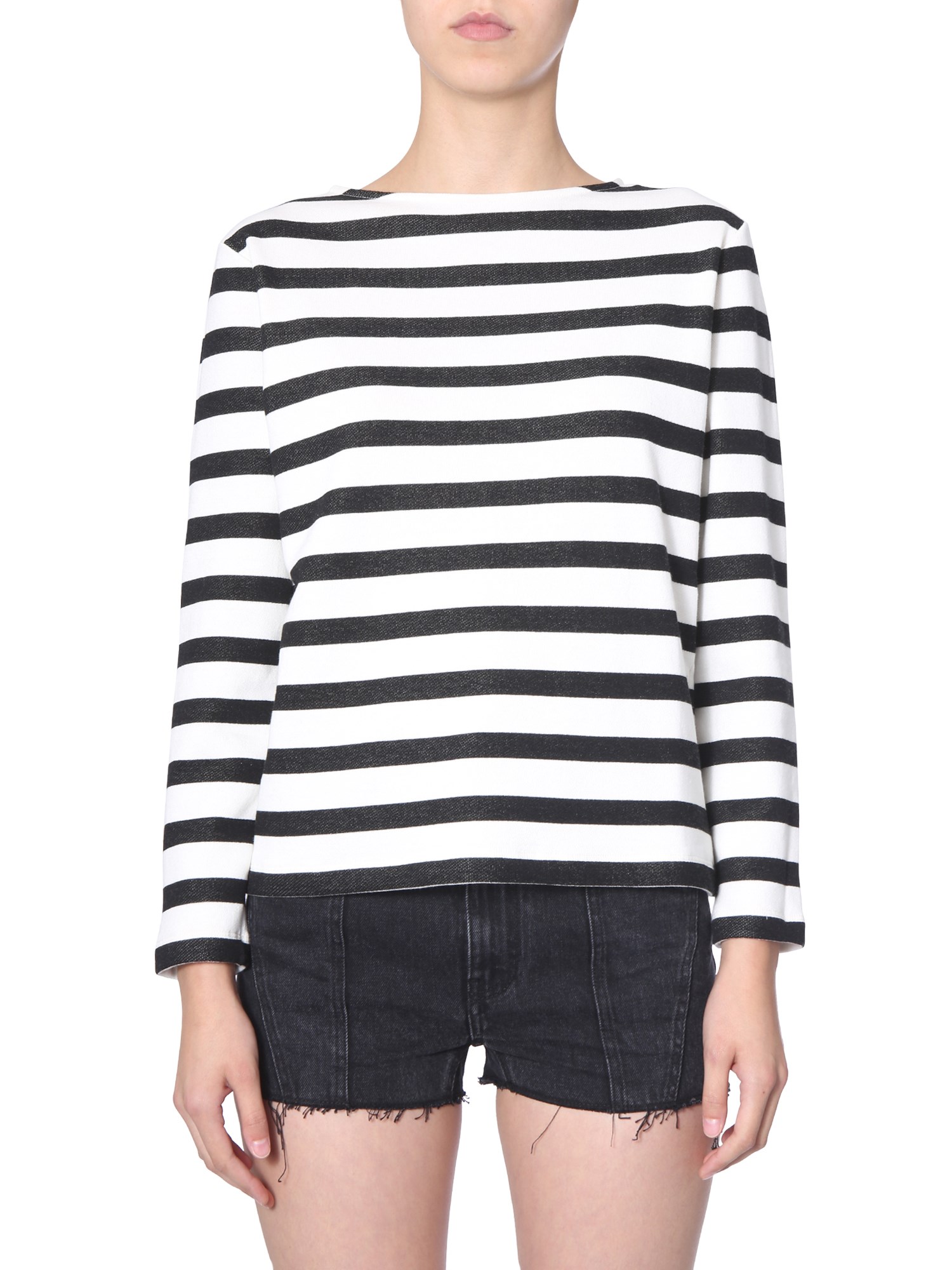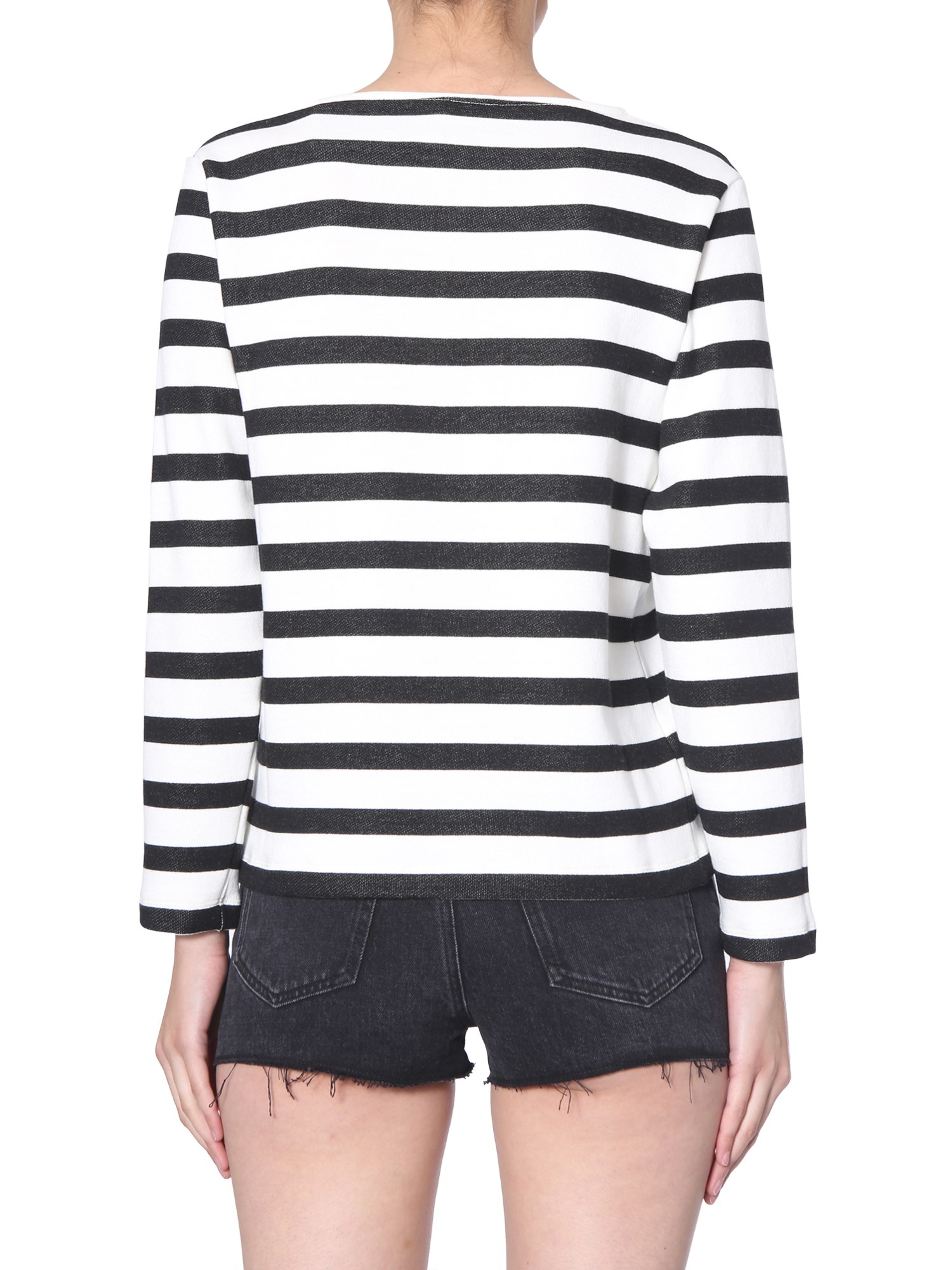 Get appreciated for wearing this striped sweatshirt from the house of Saint Laurent. The sweatshirt is made from durable and lightweight cotton that allows you utmost comfort all day long. With brushed interior, this sweatshirt features a boat neck and full sleeves. This regular-fit T-shirt can be teamed with black denim and sneakers.