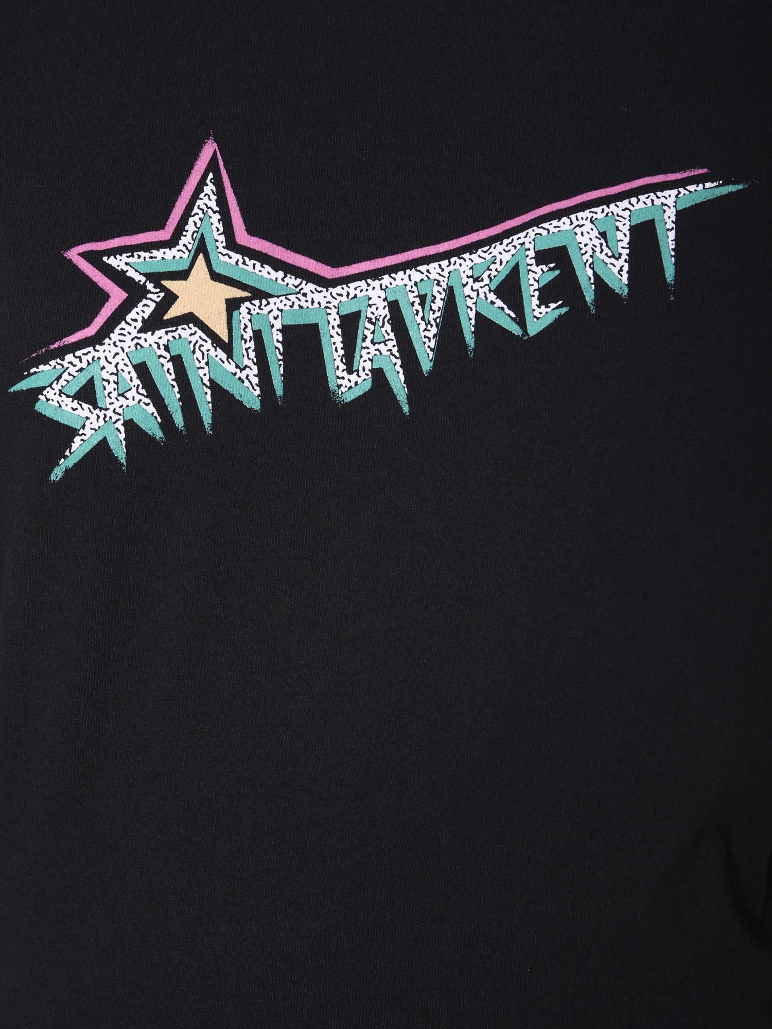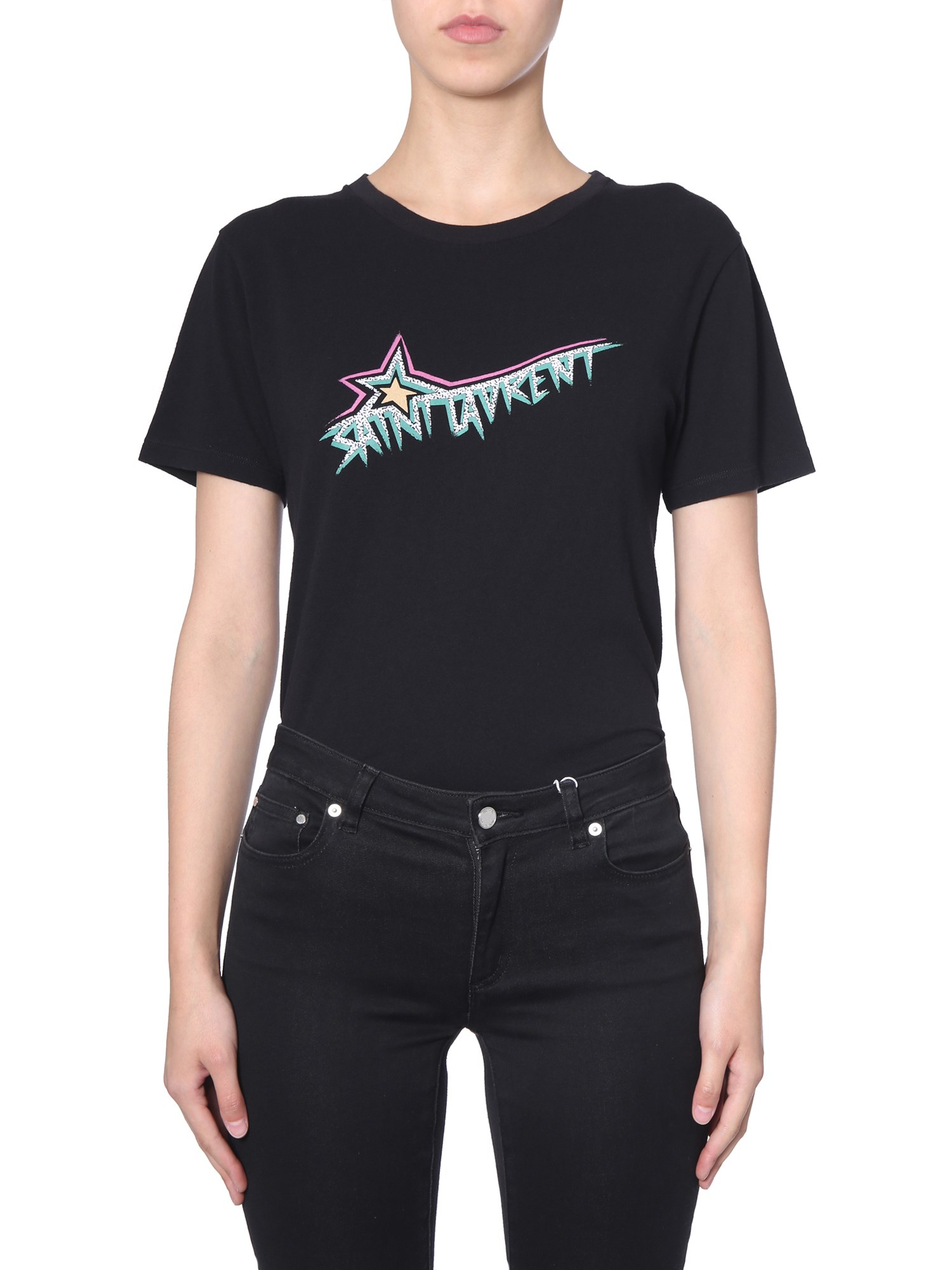 Heading out for a movie night or going on a lunch date, wear this star logo print T-shirt from Saint Laurent. It is fabricated from 100% cotton with brushed interior to remain comfortable all day long. Set with a round neck and short sleeves, this T-shirt is best for the summer season. It comes with a printed front panel to add up to its funky vibe.