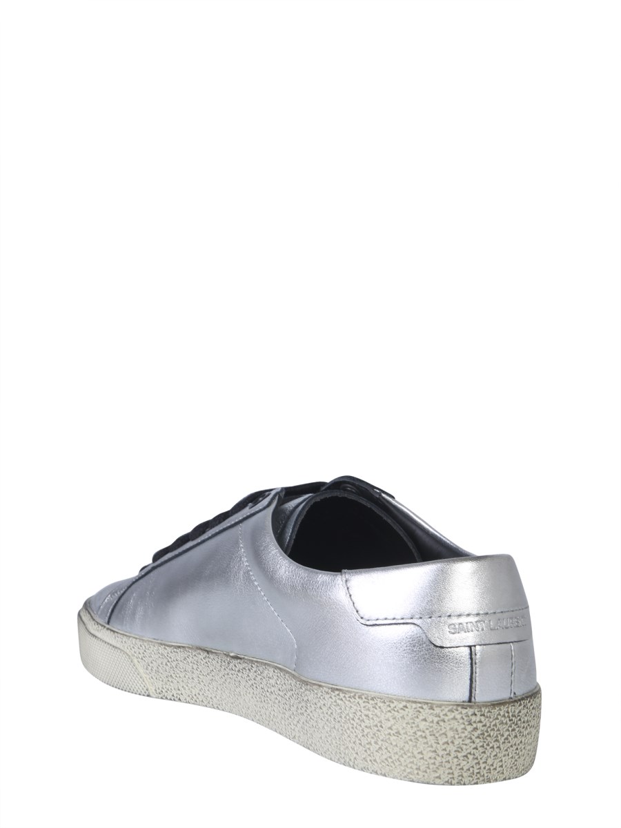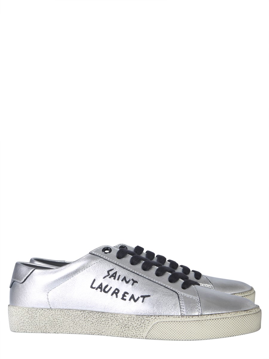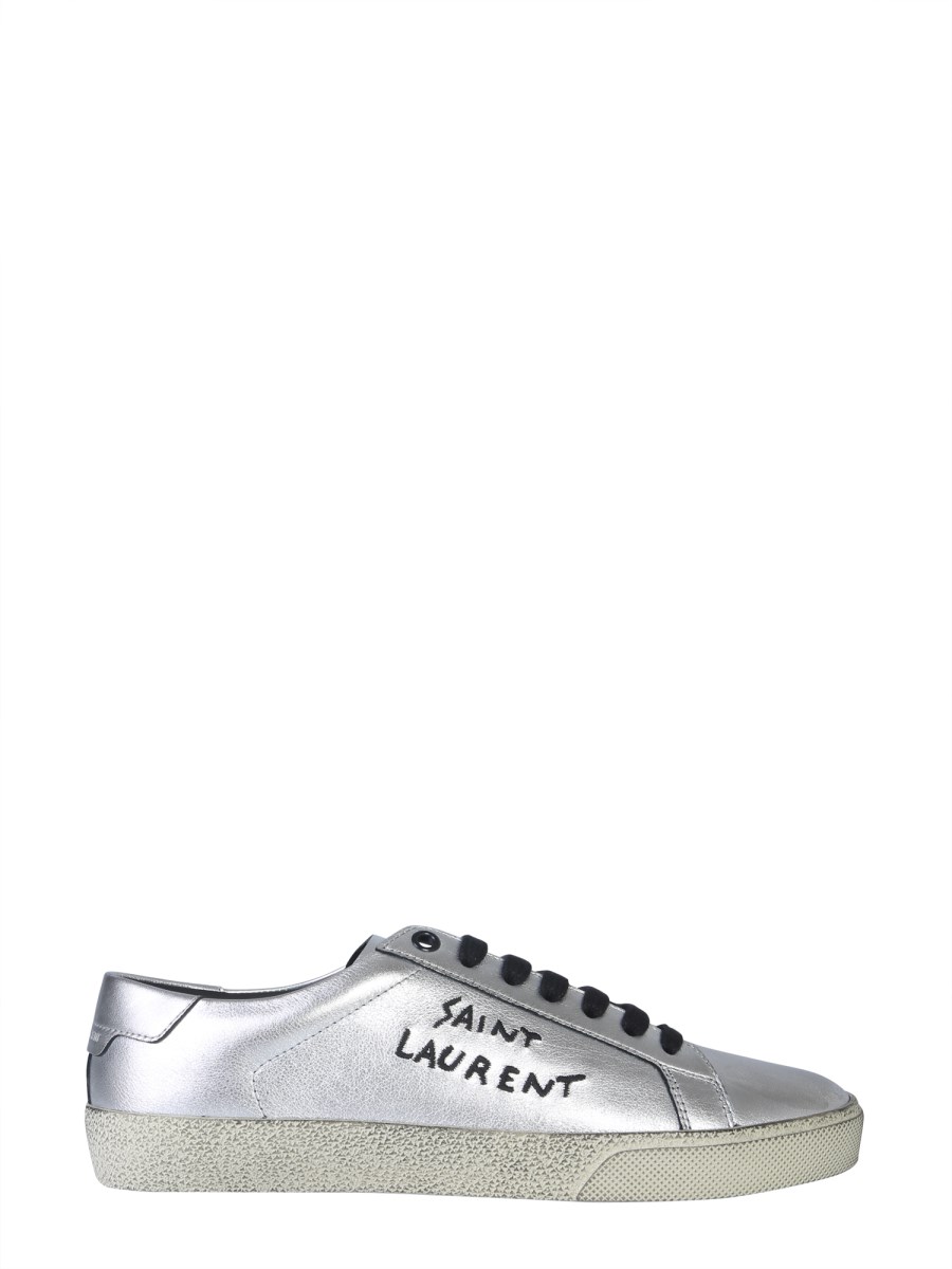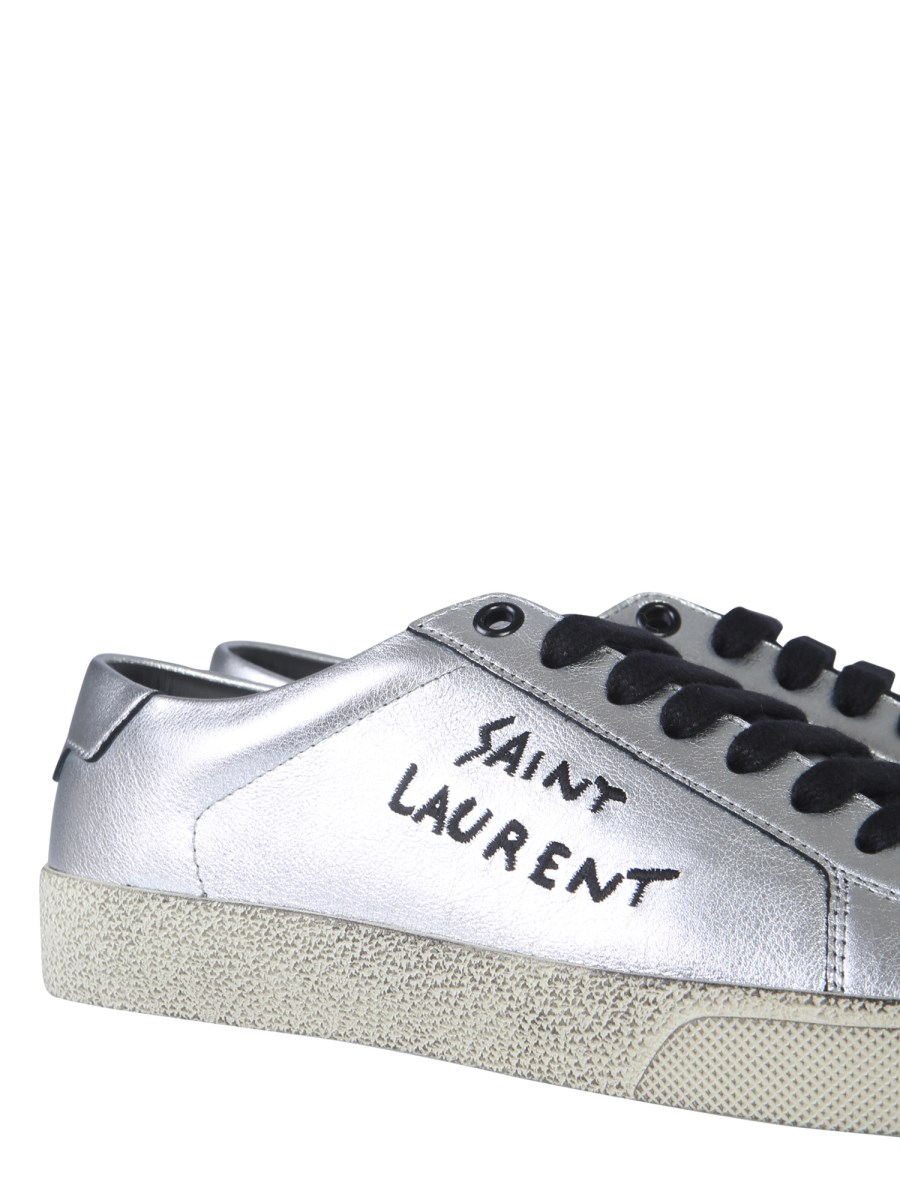 Upgrade your footwear collection with this classic court sneaker from Saint Laurent. The sneakers are made from 100% leather that ensures durability. It features a front lace-up closure for a comfortable fit. The embroidered detailing on the upper part aptly complements its shiny surface. You can wear these sneakers for your casual day out.