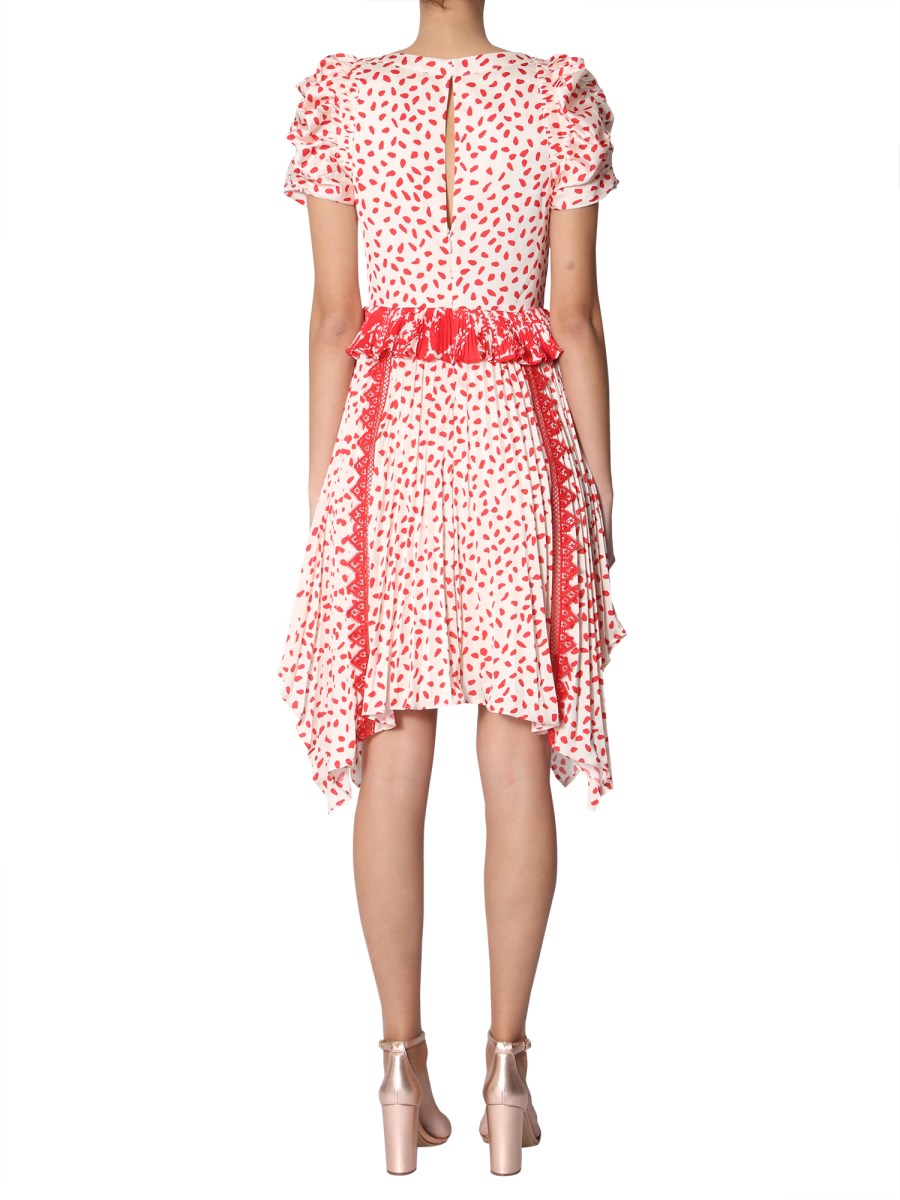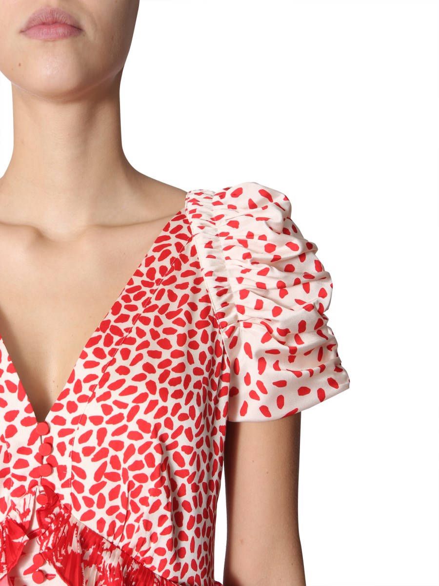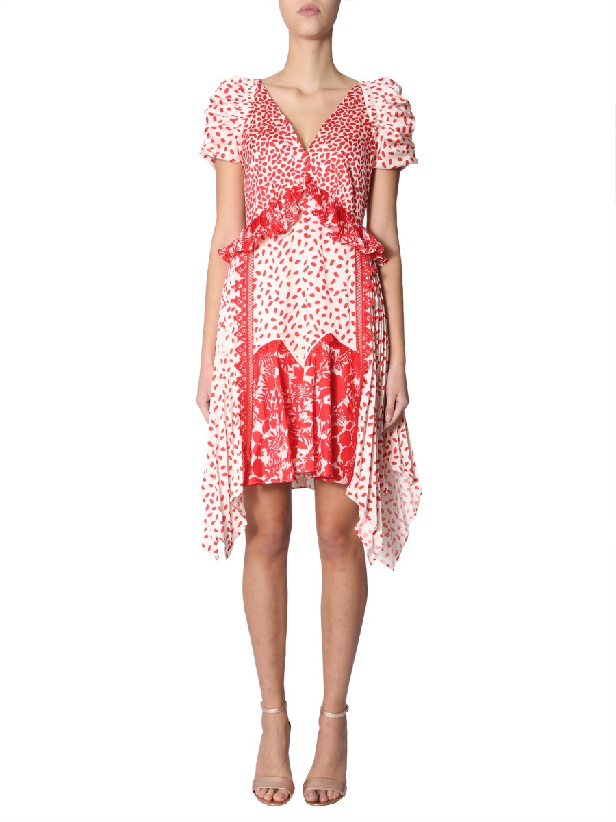 This printed satin dress by Self-Portrait explores and reveals all the sides of you. The dress features a trendy V-neck combined with short balloon sleeves that suggests softness and subtle styling. The drop closing with button and invisible zip on the back ensures a perfect fit.