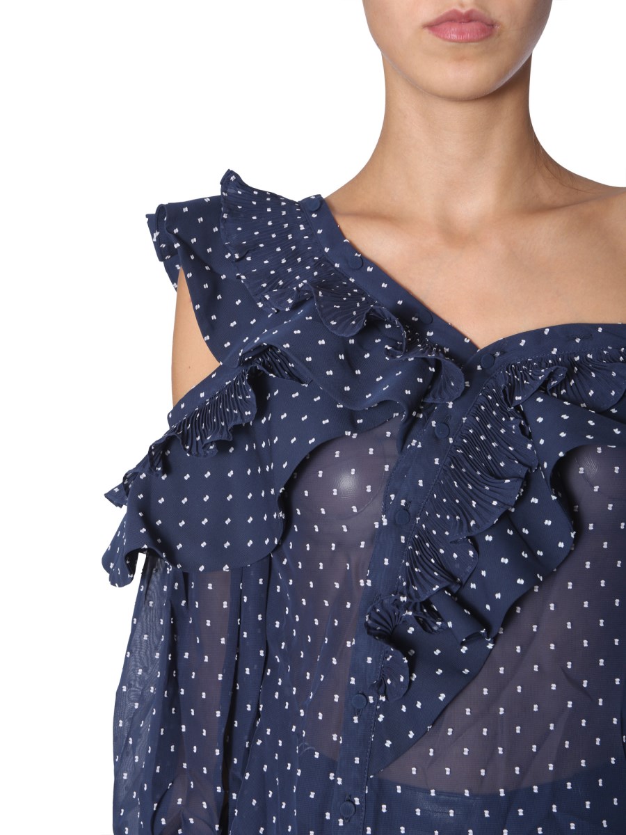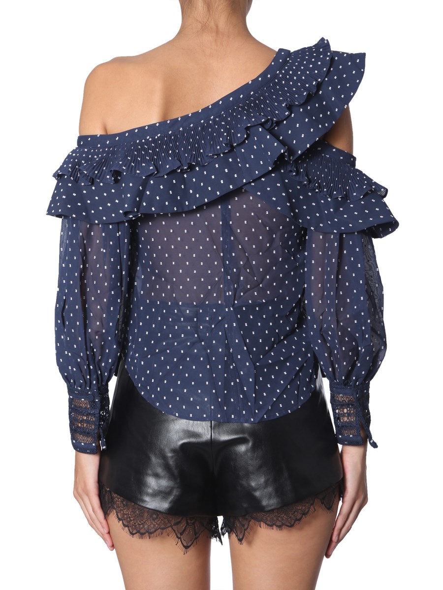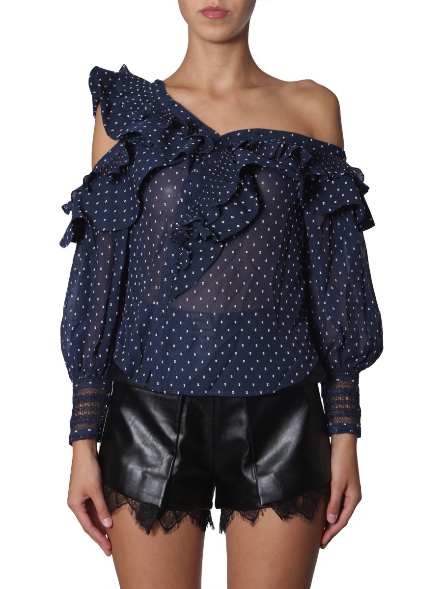 Head out for a girl’s night out in the single shoulder top with volant from Self-Portrait. The top is made of 100% cotton to ensure breathability and comfort. It has a V-neck with buttons that make it look stylish and attractive. You can pair this top with leather shorts and high heels to complete the attire.