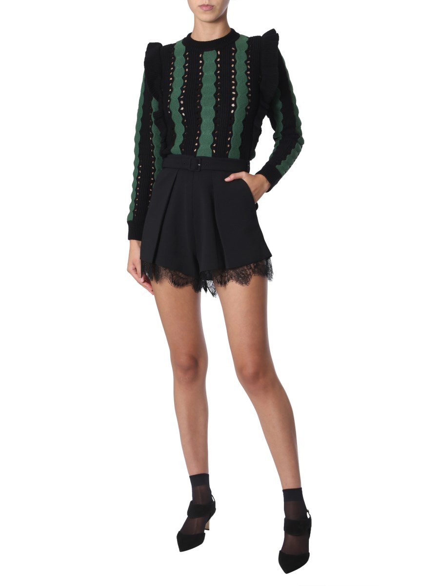 For an amazing summer appropriate look, get these crêpe shorts from Self-Portrait. These polyester shorts offer easy sweat wicking. The adjustable and removable belt gives a fitted closure. They have lace trims at the bottom that enhance their stylish appeal. Whether you style them with a basic tee or a classy top, you will get all the compliments.