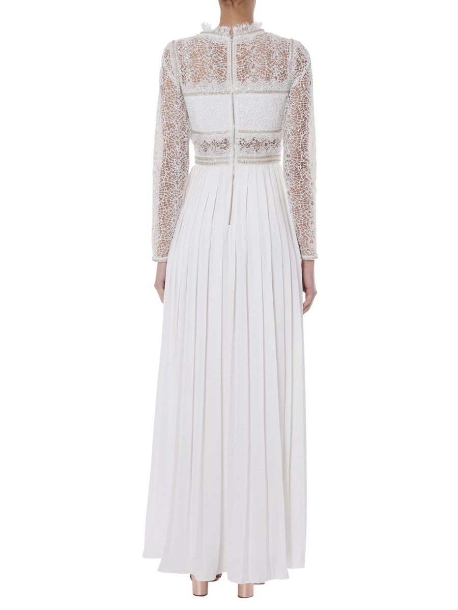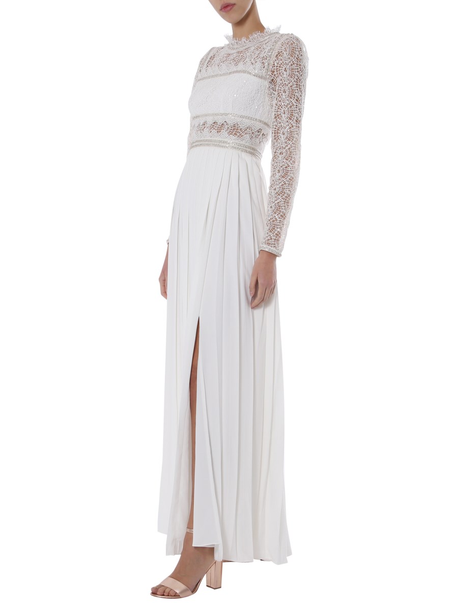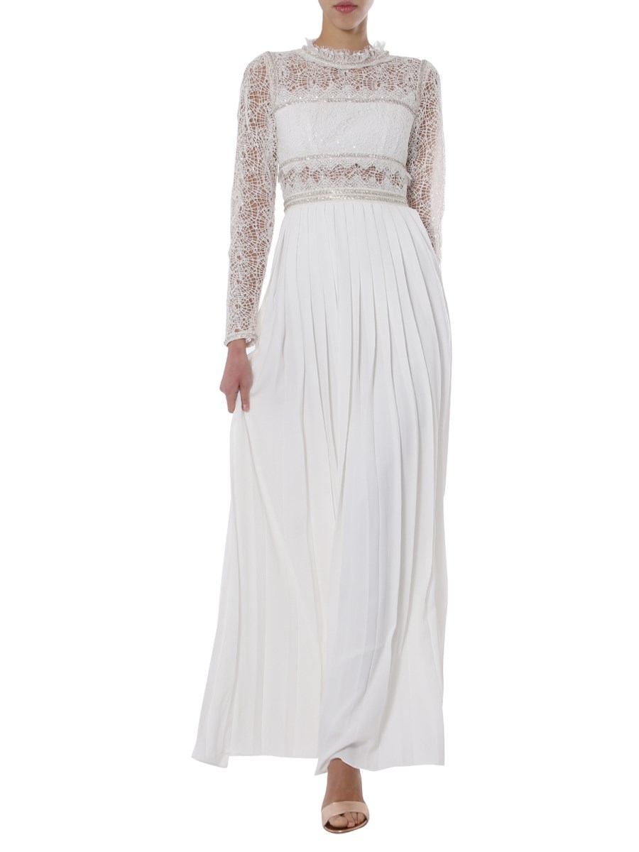 Hit the party or take a ramp walk in this flowing long dress from Self-Portrait. An embroidered crew neck and lace ruches adorn this maxi dress. The sequin application further dazzles up this glamorous dress and make it a flattering addition to your collection. Style it with accented jewellery and heels for an effortless charm.