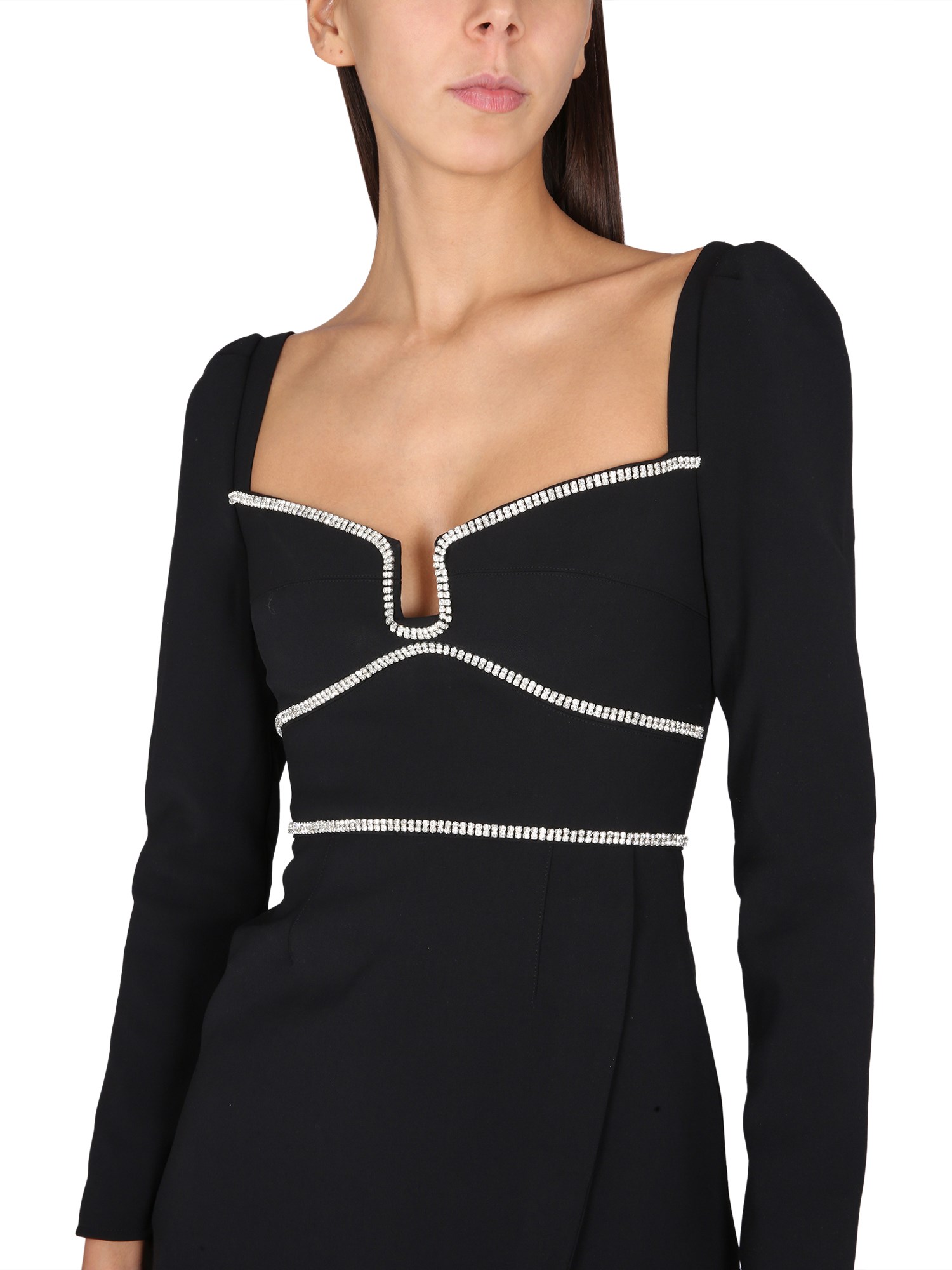 A sophisticated black crepe mini dress from Self-Portrait with a sweetheart neckline is perfect for a night out. The dress is accented with rhinestone detail, making it shine and sparkle. The rhinestones add an elegant touch, and the crepe fabric will look great with any outfit.