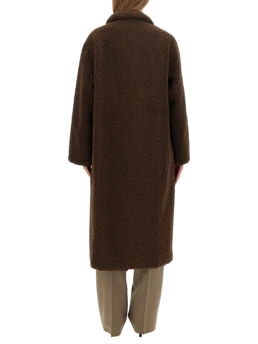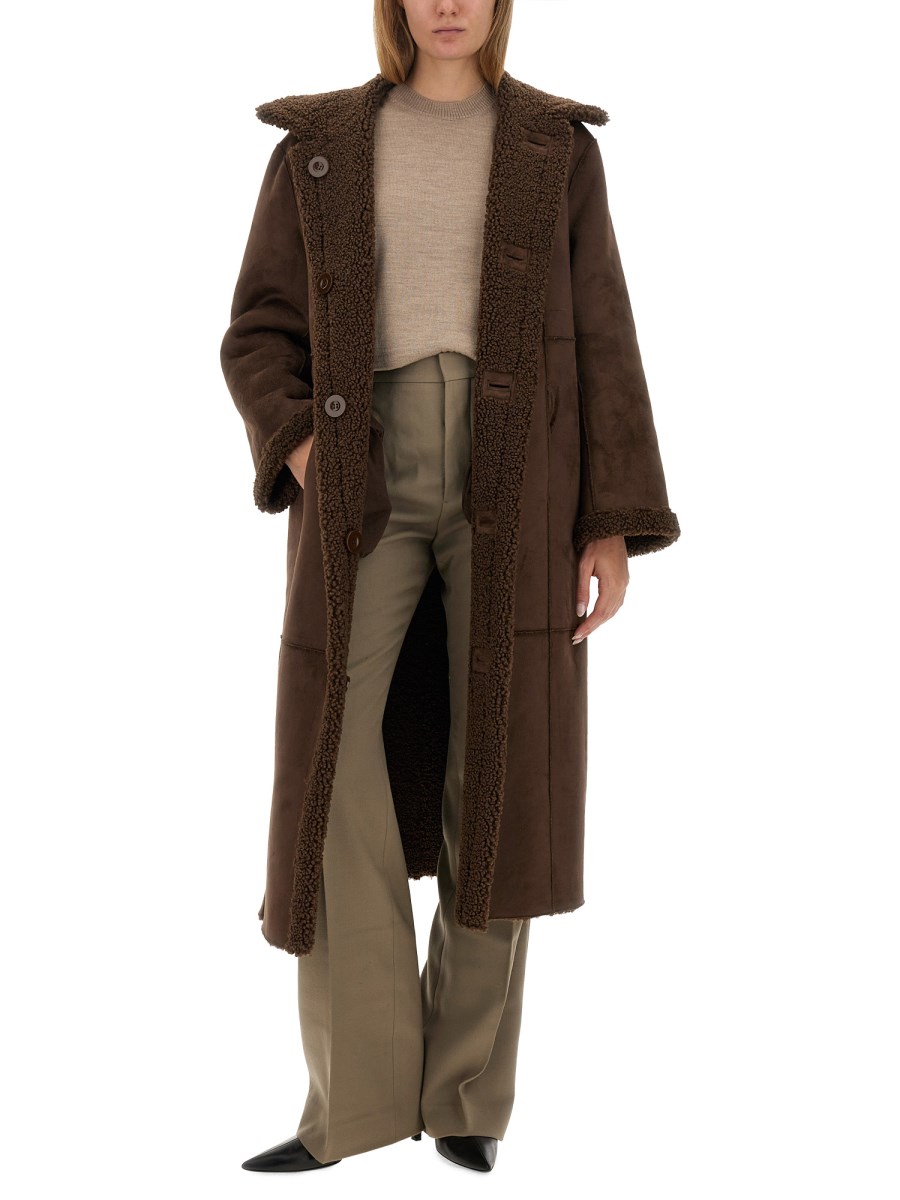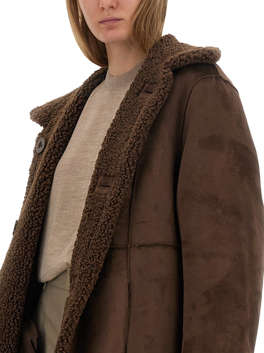 Kenca is a reversible button-down coat tailored in faux shearling. Details include raw cut edges and front buttoning.