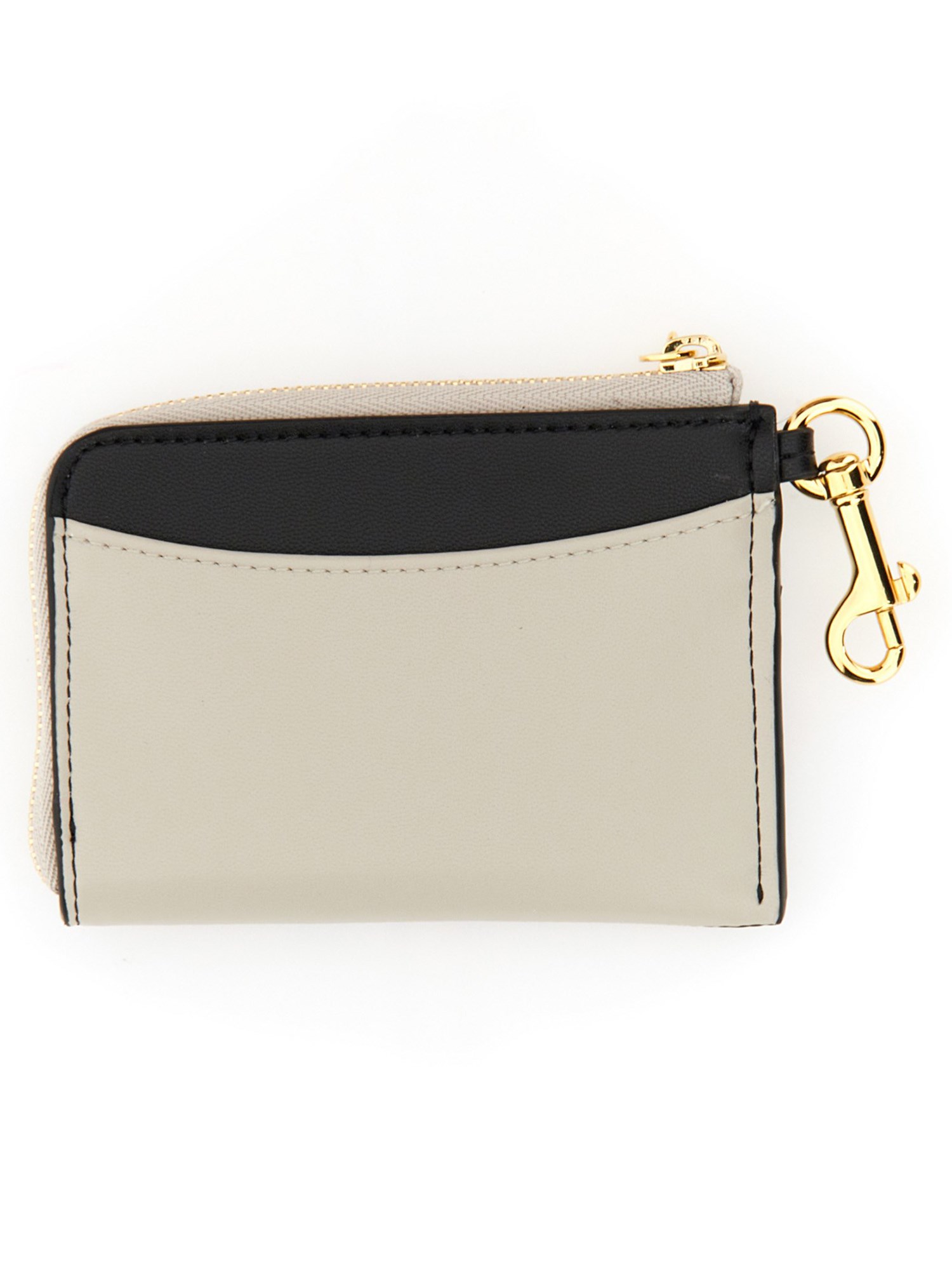 Stella McCartney's high-quality pocketbook is an essential fashion item. The exterior is made of silvery high-quality leather, and it closes with a hook-and-loop fastener, so you can get to your cards quickly and easily. Brown fabric lines the interior, and there are several slots for cards and cash in addition to a zipper closure.