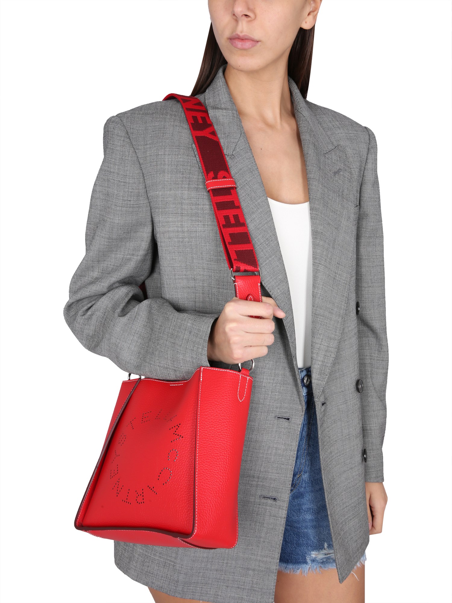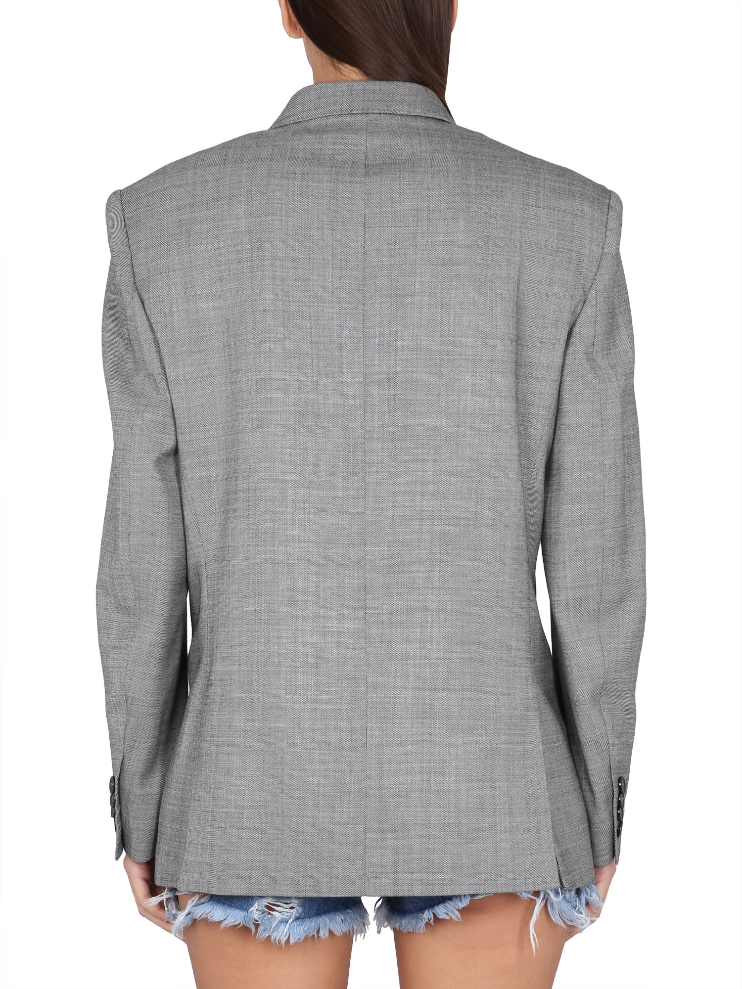 The oversized suiting is taken to a fresh horizon with this double-breasted blazer from Stella McCartney. Crafted from responsibly sourced wool in a tonal grisaille check weave, the jacket has a tuxedo lapel, waterfall cuffs, and a jetted pocket. Wear it with body jewellery, a white tee, and matching suit trousers.
