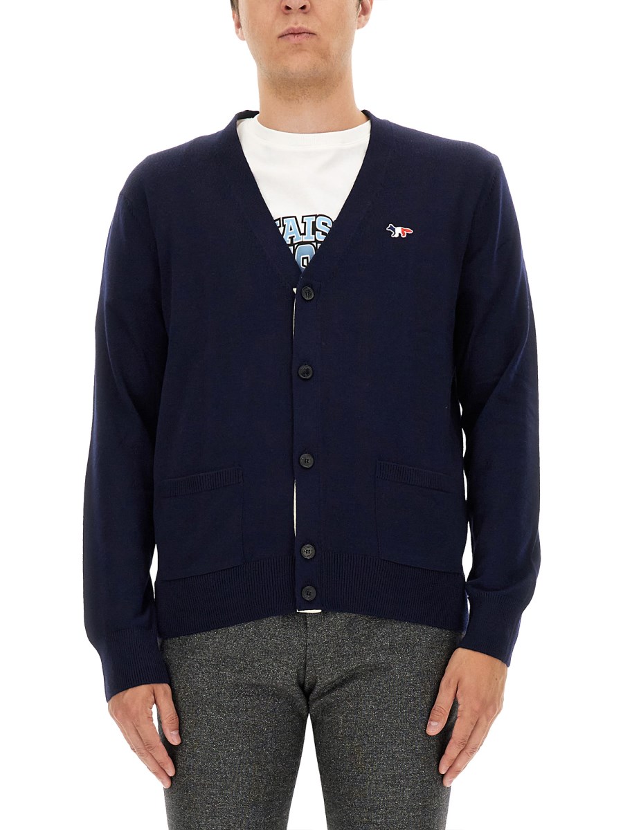 - V-NECK- FRONT BUTTON CLOSURE- TRICOLOR FOX PATCH APPLIED TO CHEST- 100% MERINO WOOL- MODEL IS 190 CM TALL AND WEARS SIZE L