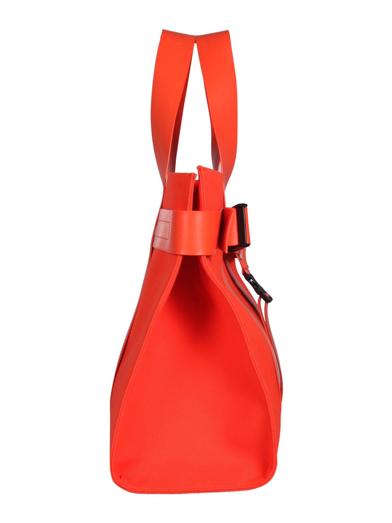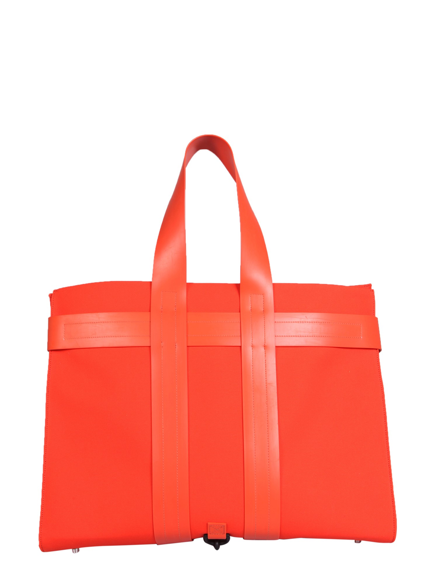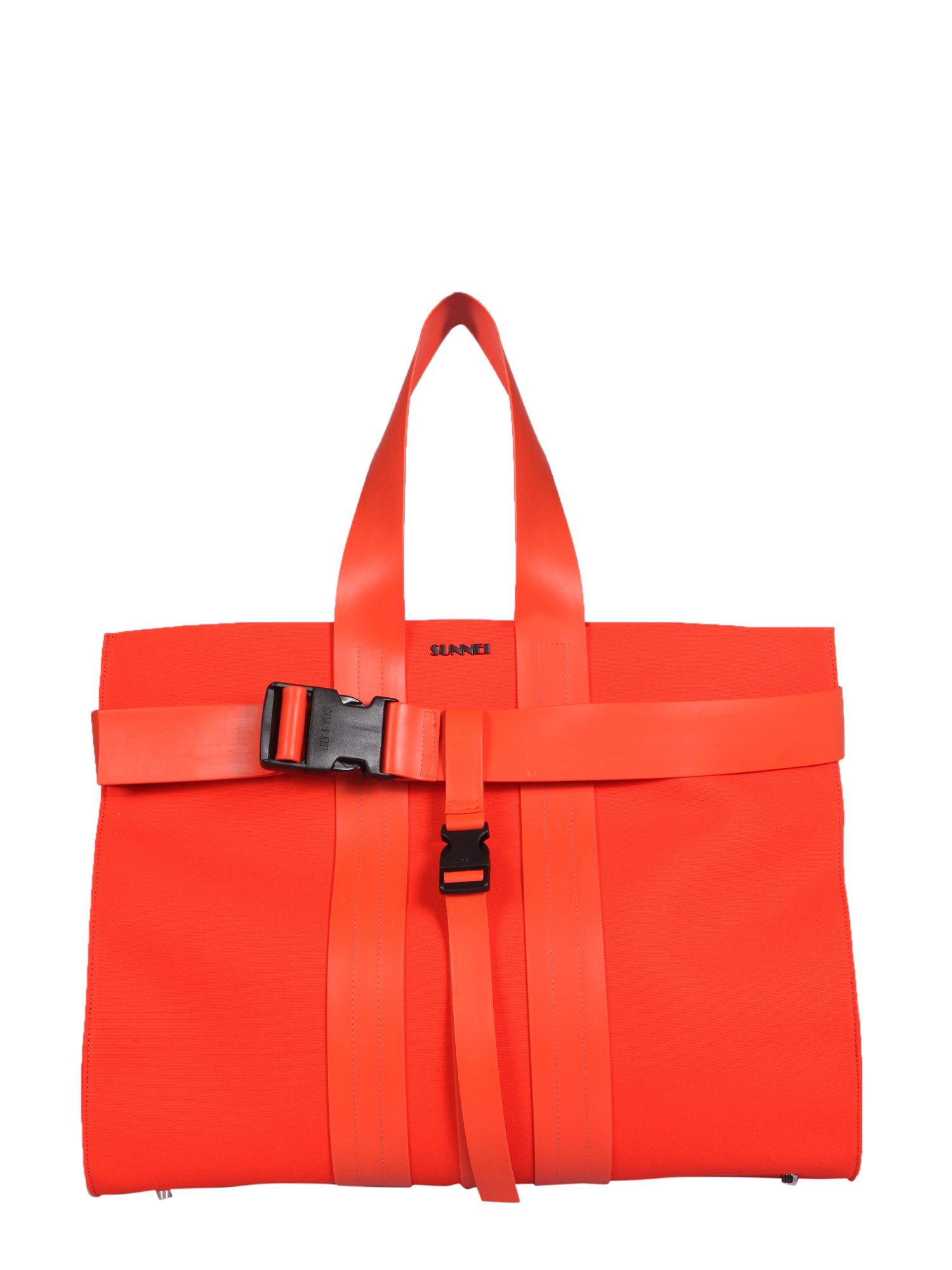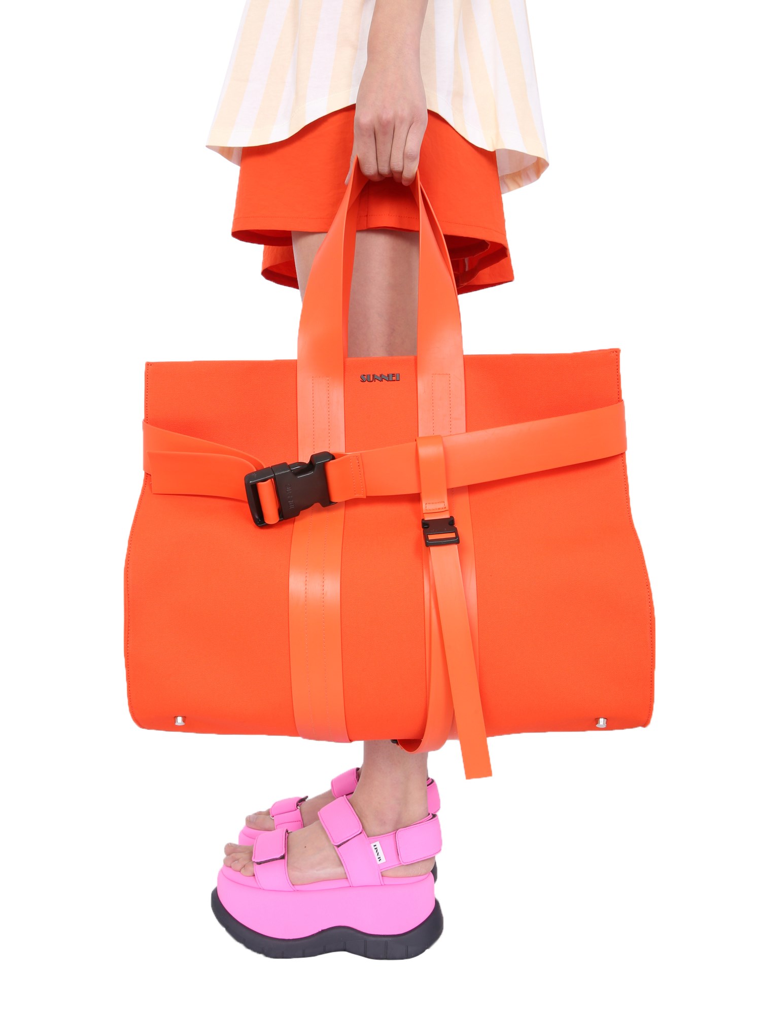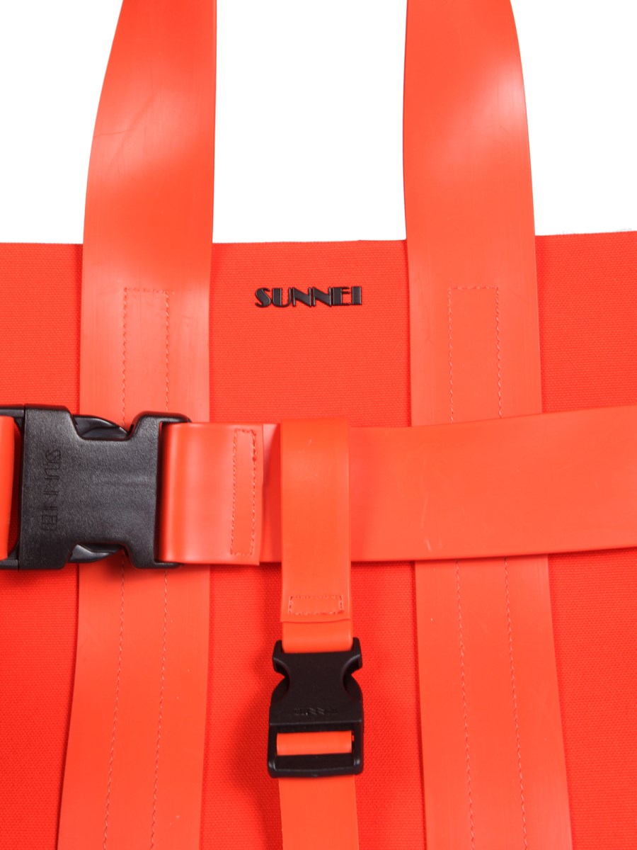 Impress everyone with your elite accessory choice by carrying the Parallelepiped Messenger bag from Sunnei. The cotton construction bag has a double rubber handle, zip closure, metallic feet at the base, and a lined inner with two flat pockets. It is adorned with the embossed logo on the front and a rubber belt with a buckle.