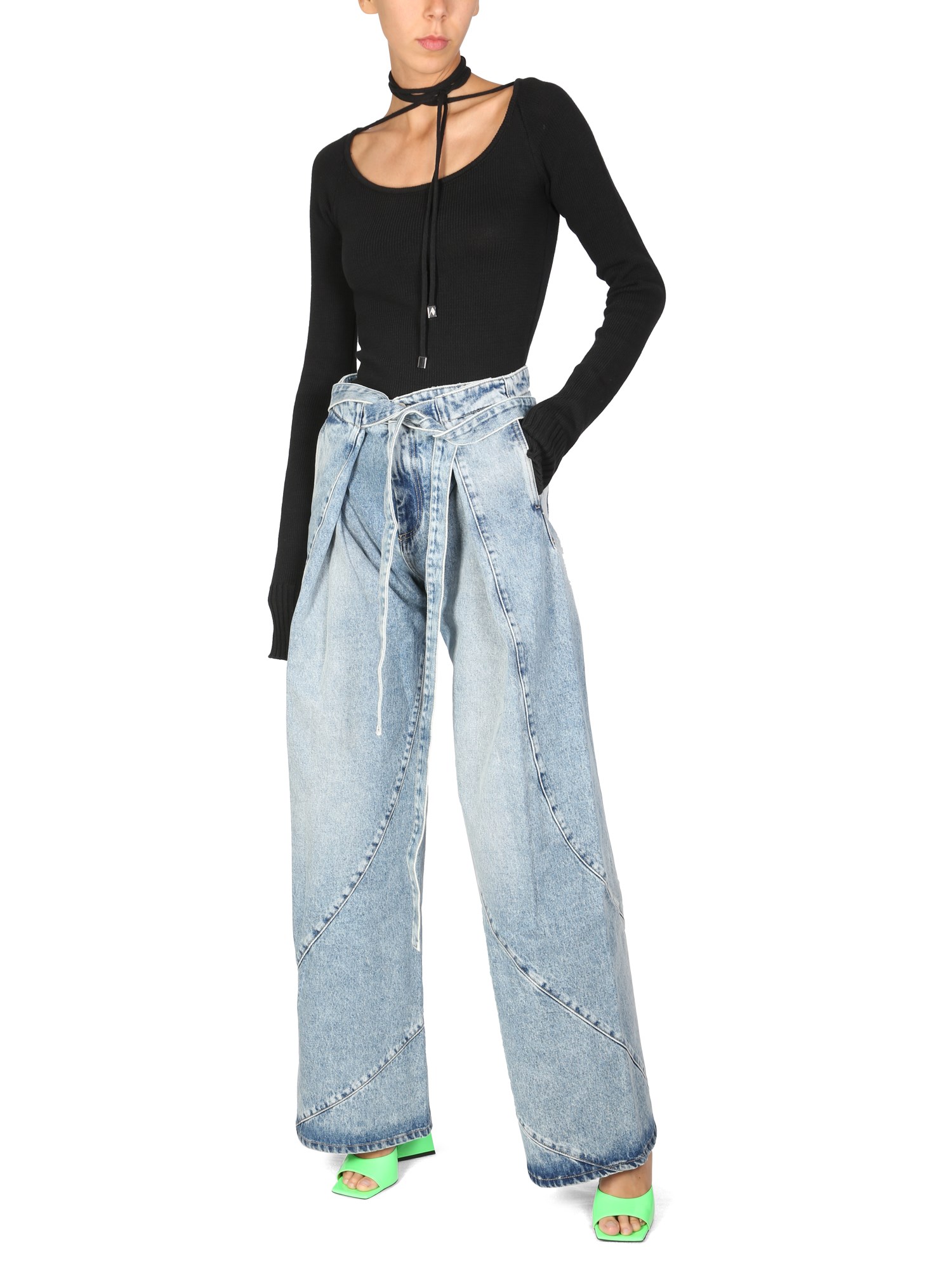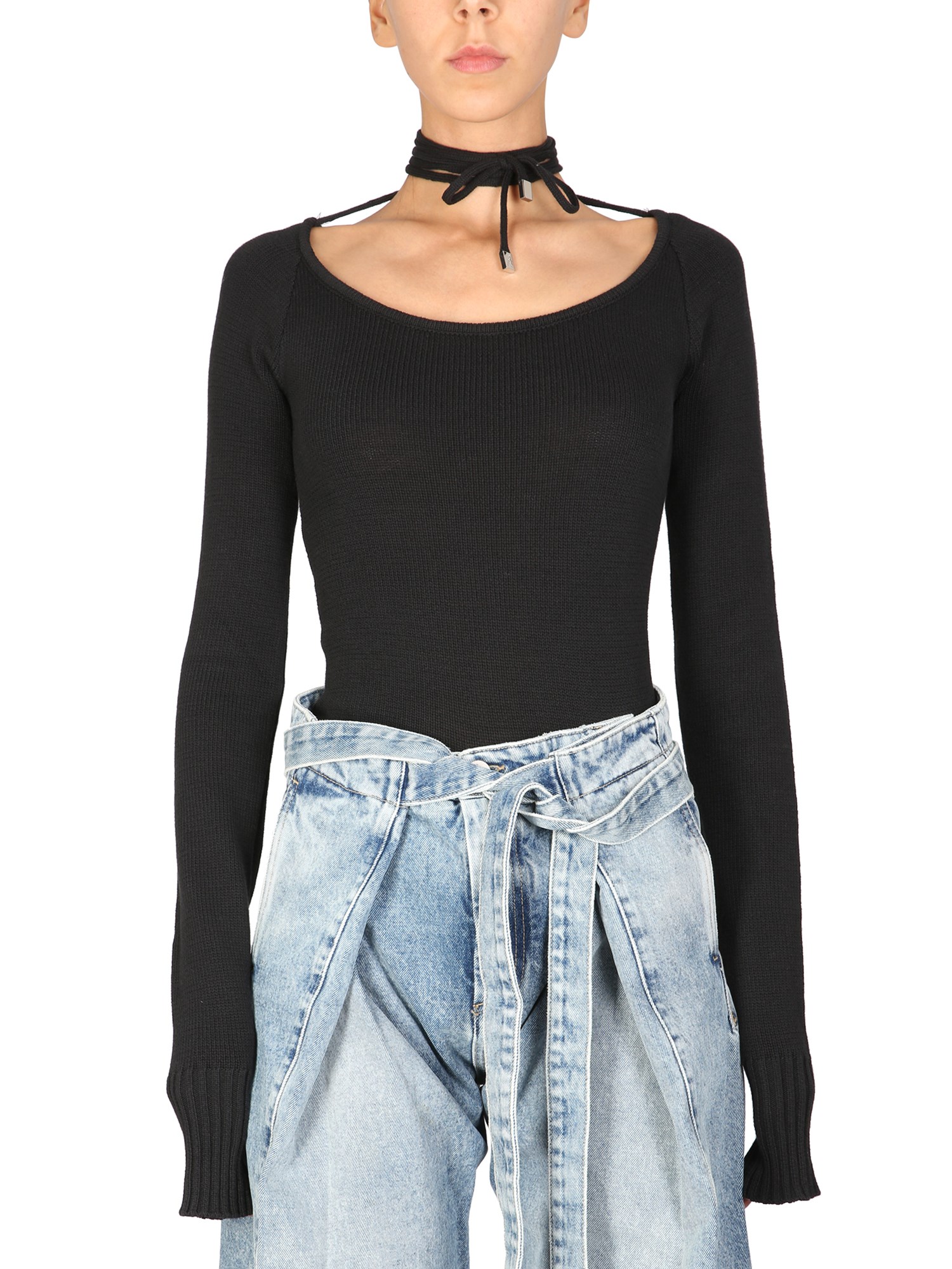 The "Heather" sweater from The Attico is a lightweight pullover crafted from cotton-blend material. It is a long sleeve, fitted silhouette sweater that can be worn with jeans or leggings. The sweater features a boat neckline with self-tie detailing and metal logo details on the front.