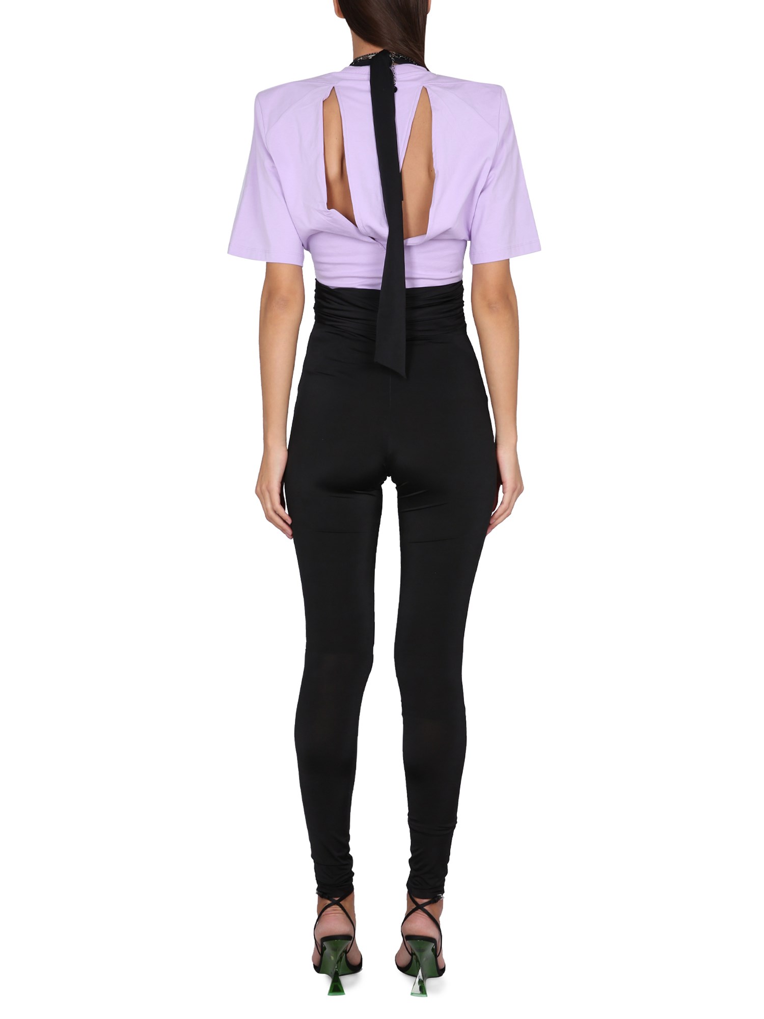 ''Ruby'' long pants in black second-skin jersey with metal chains, logo metal plate, front drapes and sash around the neck.