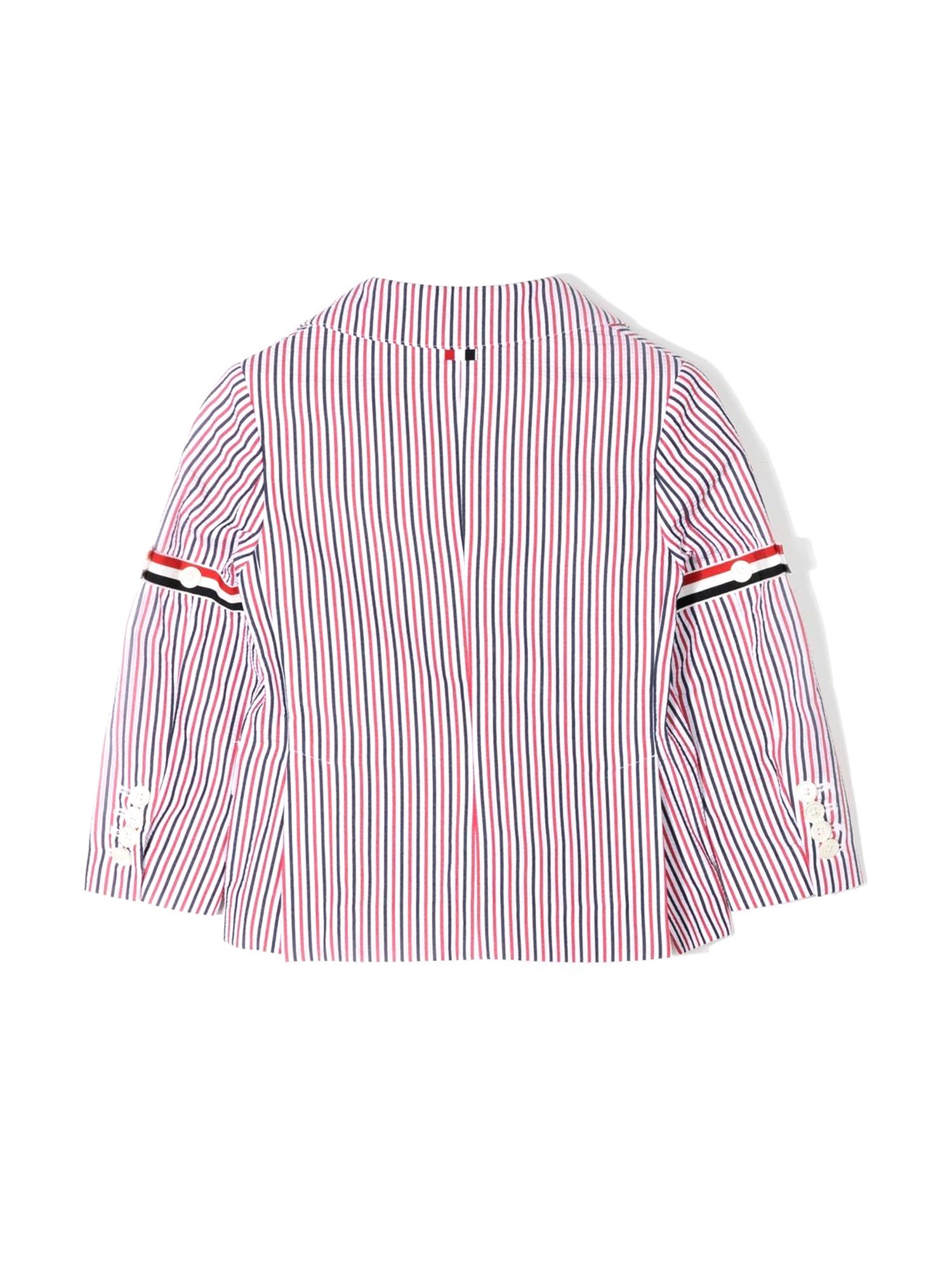 The new-season shot coat from the house of Thom Browne is made of a lightweight and stretchy material that will keep you warm and comfortable, even in the most humid weather. It has a collared neckline, long sleeves, and buttoned closure on the front. The coat has an all-over striped pattern and the sleeves are adorned with multi-colour stripes.