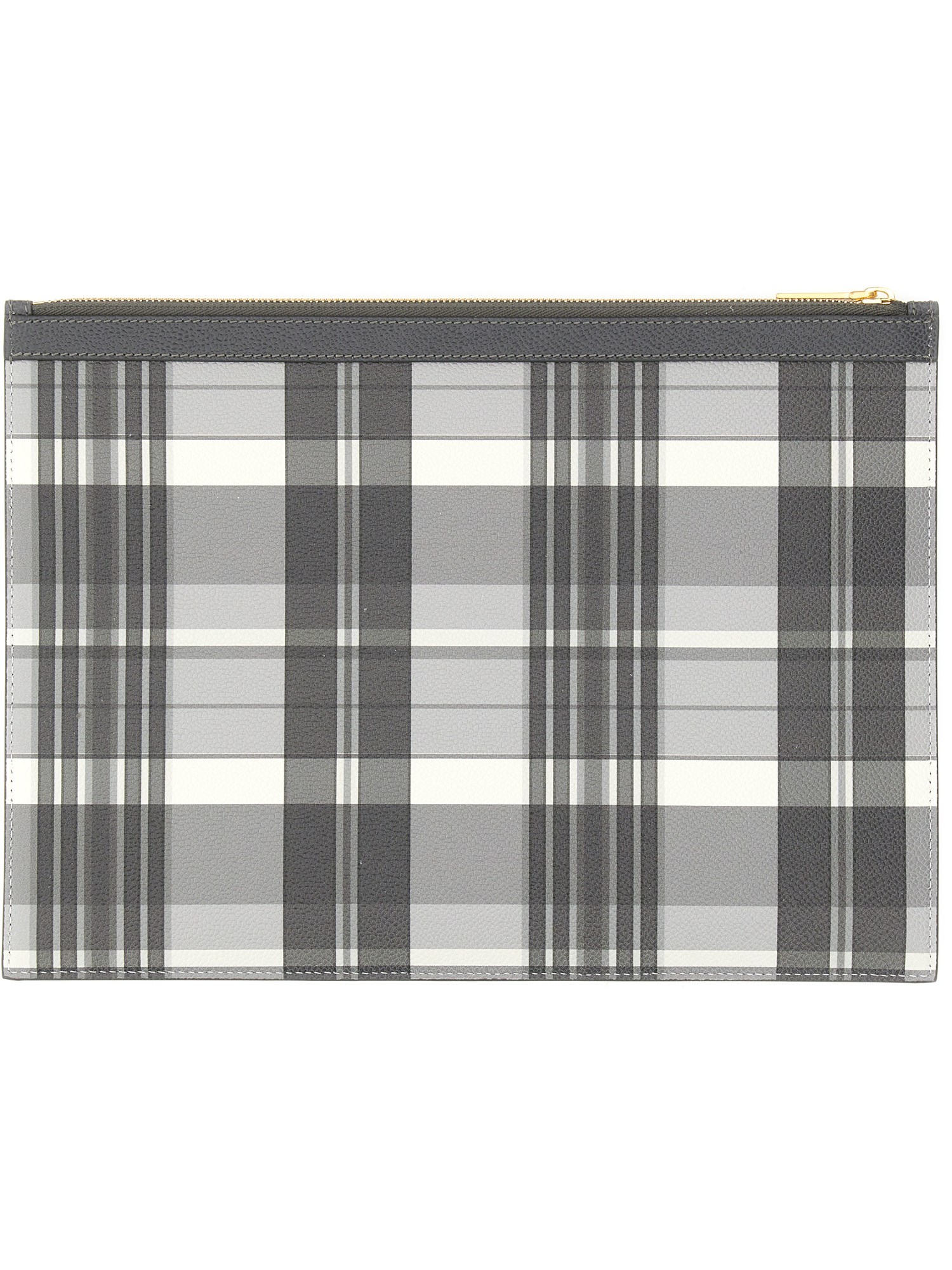 The Zip closure front logo 4-bar detail plaid pattern calfskin leather document holder from Thom Browne is a must have for any business professional. It is designed to hold multiple documents in an organized fashion. This briefcase has an adjustable shoulder strap for easy carrying.