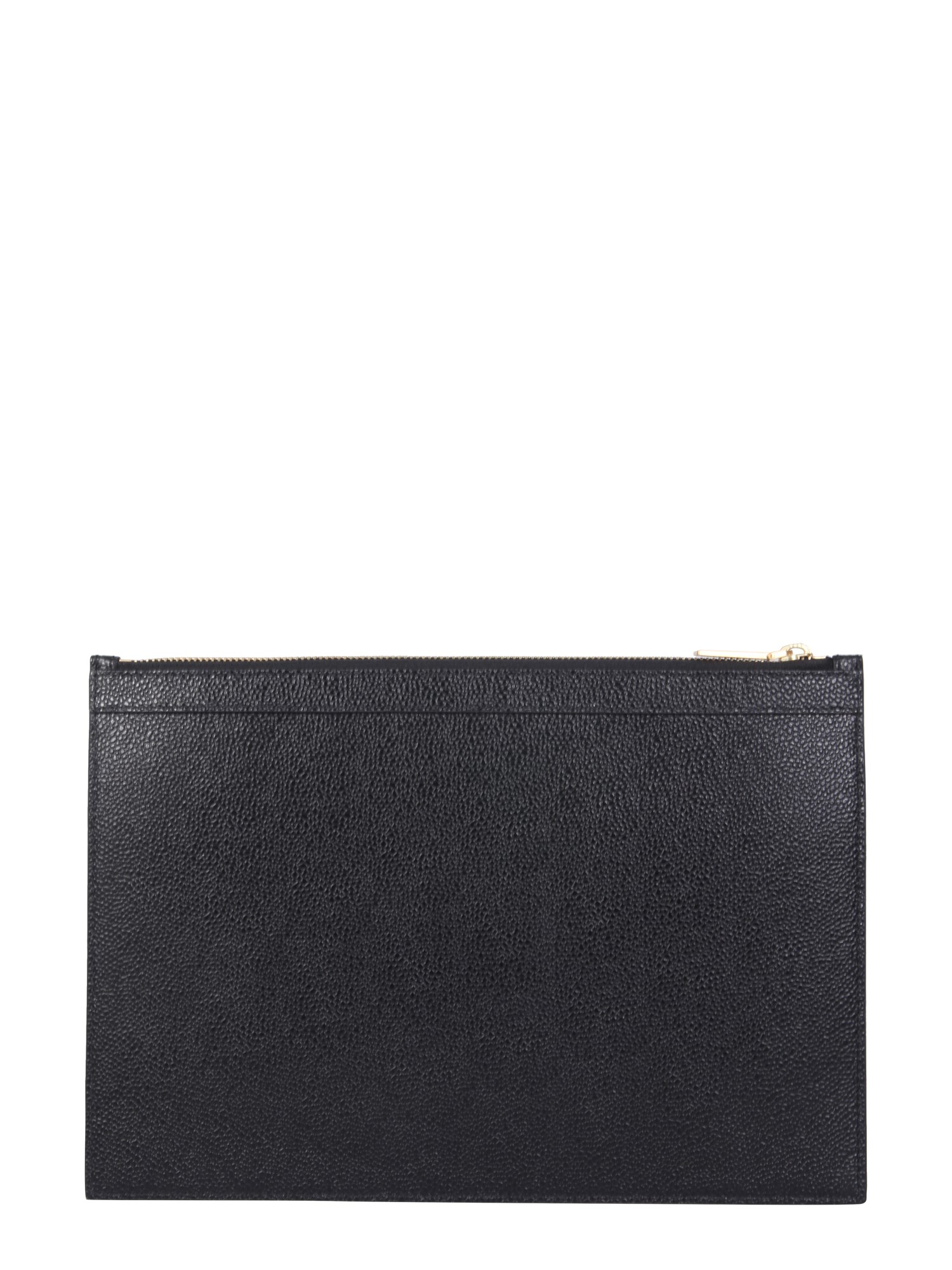 Pep up your style quotient with this stunning Thom Browne Granulated Clutch. Featuring a zip closure and metal zipper to provide a secure fit, it comes with the attractive logo print detailing and the iconic striped printed in the paint on the front to jazz up your appearance. Made of 100% leather, it is designed with an inner lining and gold-finished metal accessories.