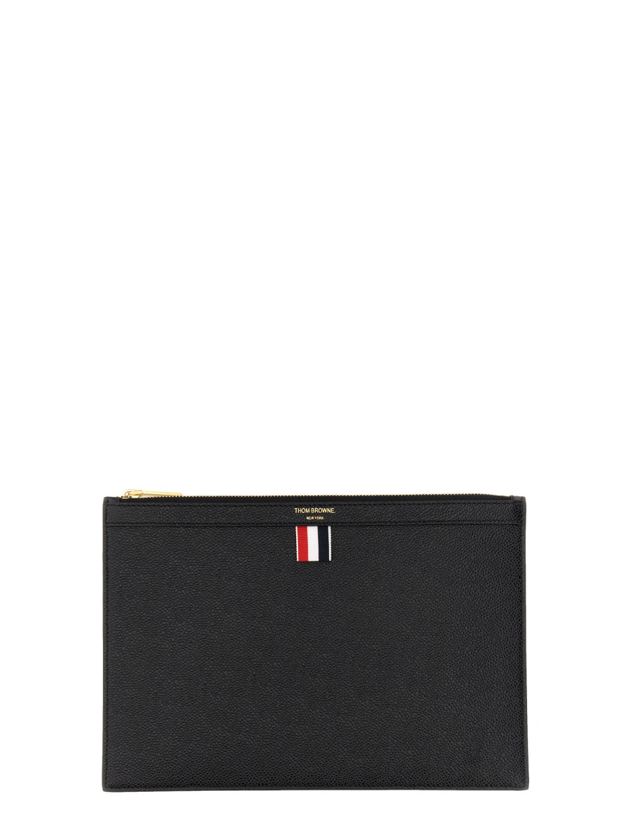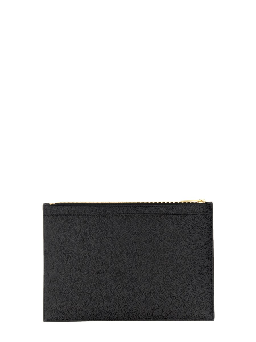 A small tablet holder from Thom Browne is a practical and portable accessory for travellers. The zipper closure allows for quick and easy access to your belongings, while the striped canvas lining provides protection against the elements. This is a small bag that is great for holding smaller items.