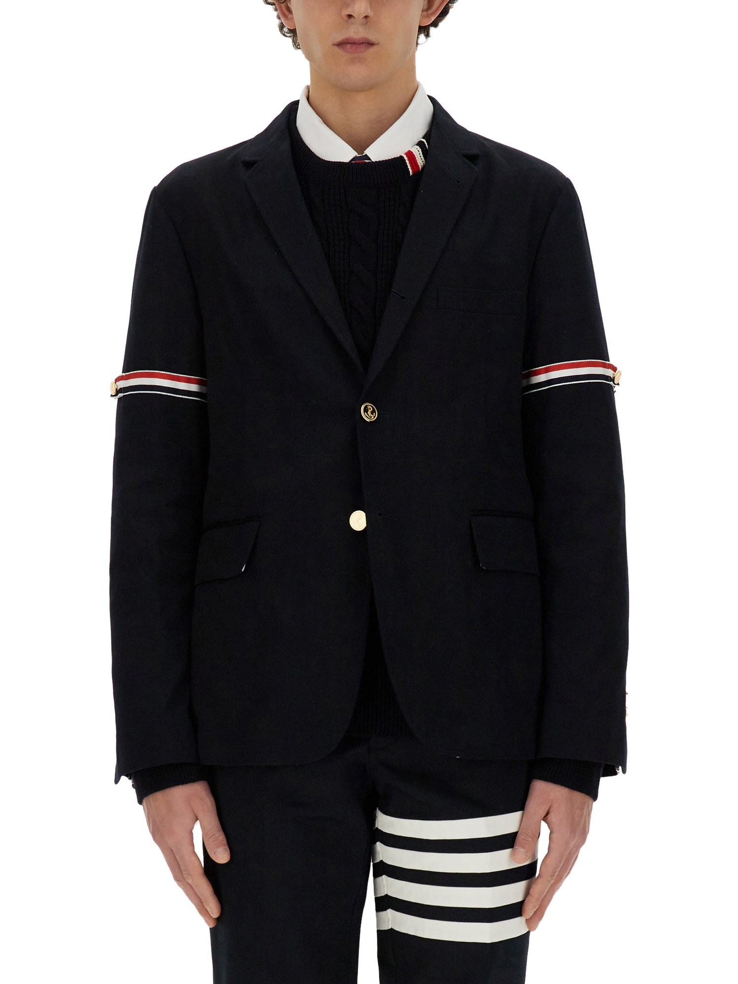 This jacket from Thom Browne combines timeless design with superior comfort. Made from high-quality cotton fabric, this jacket offers impeccable durability and breathability, keeping you comfortable throughout the day. The single-breasted style provides a sophisticated and streamlined look, allowing you to effortlessly elevate your outfits with a touch of elegance.