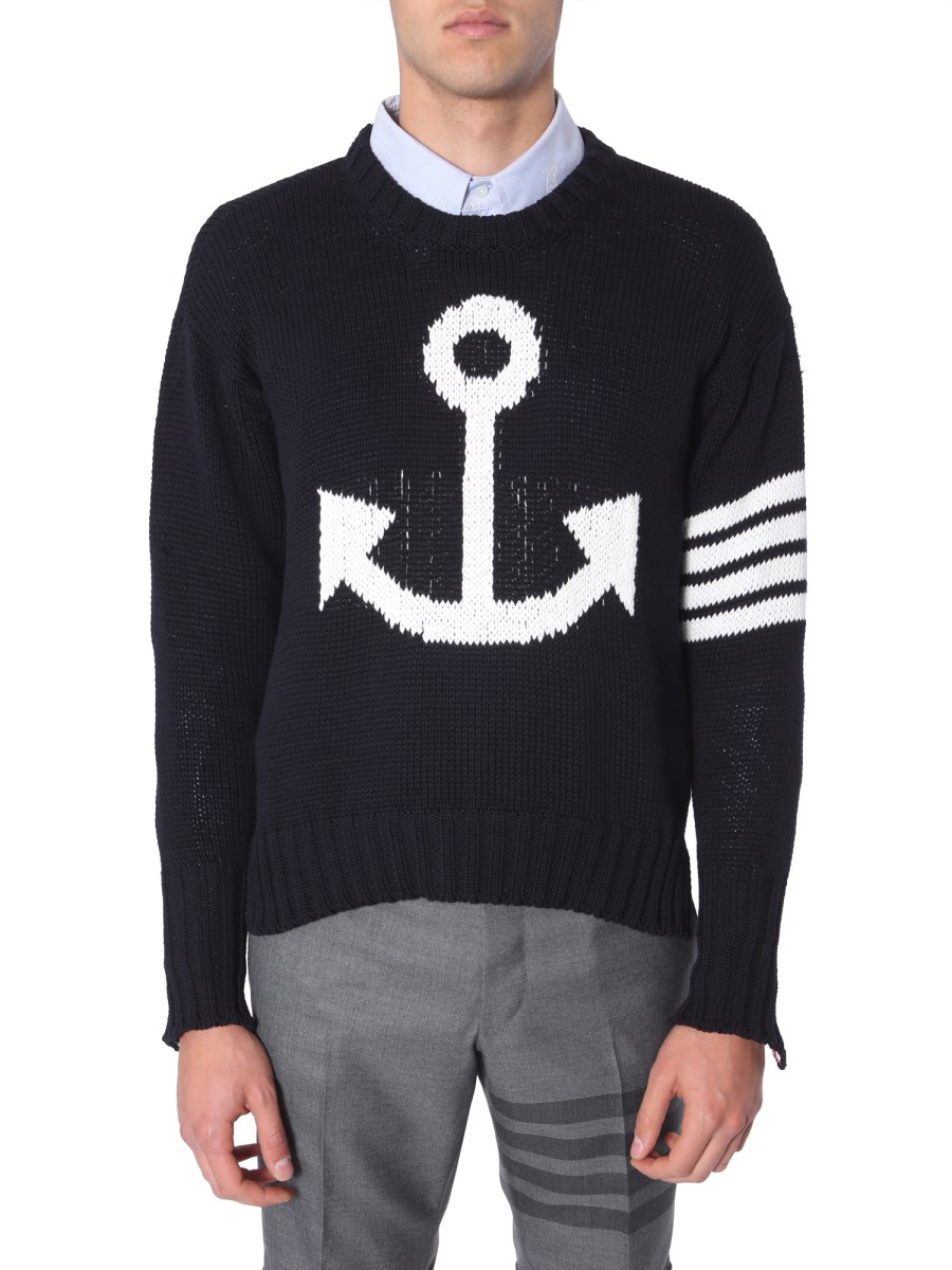 Opt for this sweater with jacquard anchor from the Thom Browne collection to make a statement on days when the temperature drops. The regular fitted sweater is fashioned with premium quality cotton for breathability and comfort. Pair it with jeans and boots to make a statement on your casual day out.