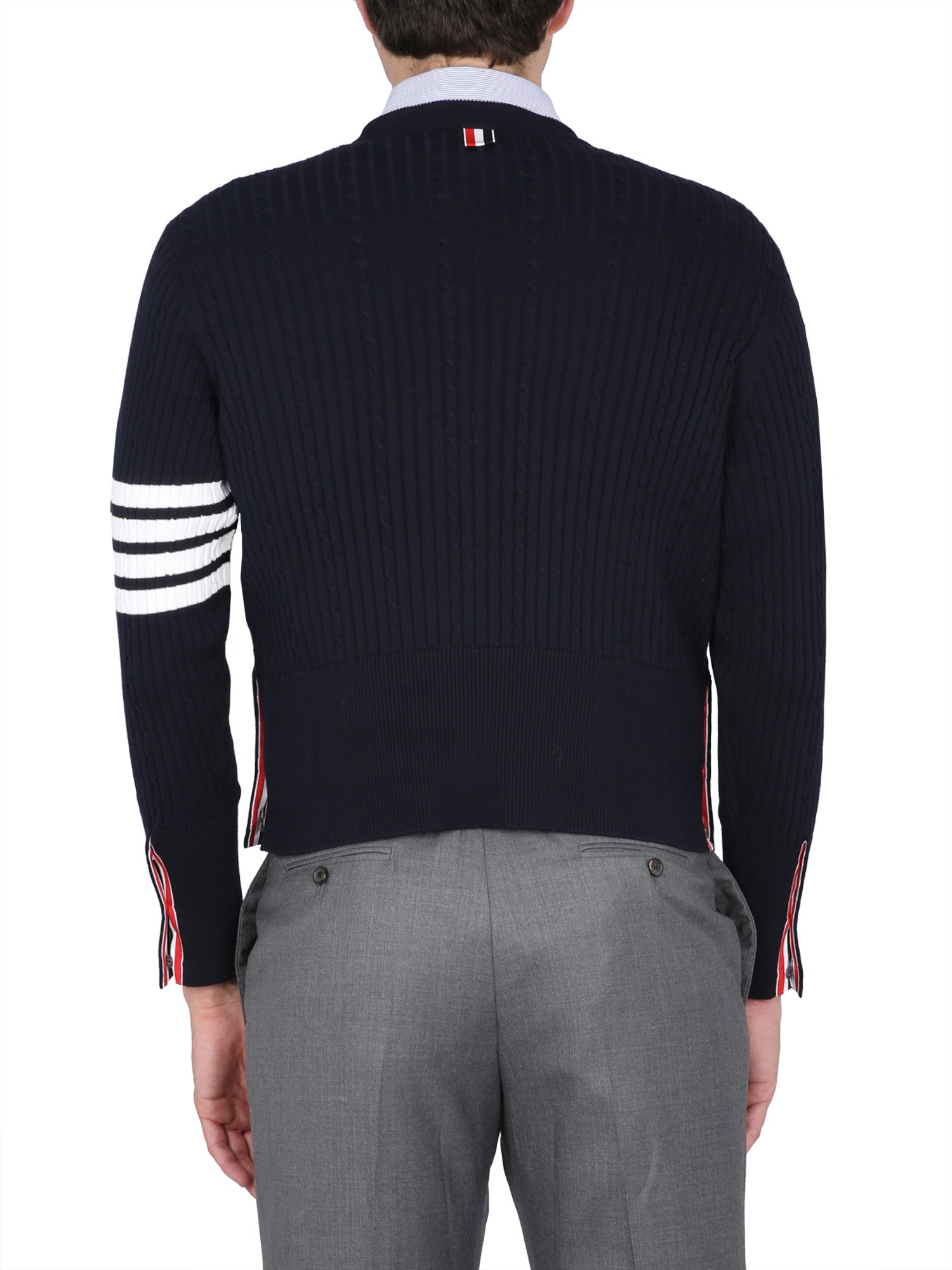 This 4bar stripe jersey is a great piece from Thom Browne to wear with jeans and boots. It features a crew neckline with long sleeves. This comfortable cotton pullover is perfect for the coming spring weather. It features a 4bar stripe on sleeve and two side slits on the bottom with buttons.