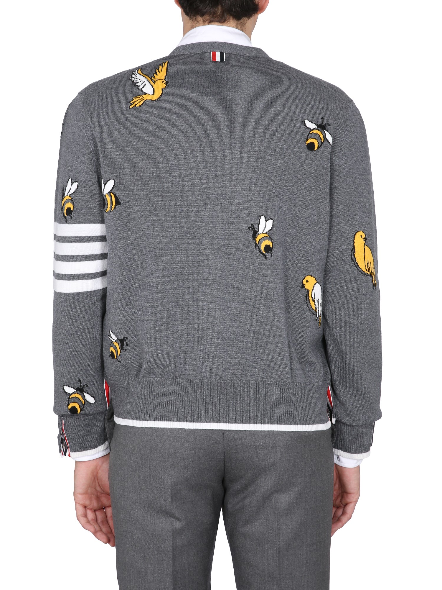 Soft, cosy, and fashion-forward, this stylish cardigan from Thom Browne is perfect for the cold winter months. The bold and beautifully textured pattern of this wool cardigan has a striking look. It is fully lined with a soft shearling and is a perfect addition to your winter wardrobe.
