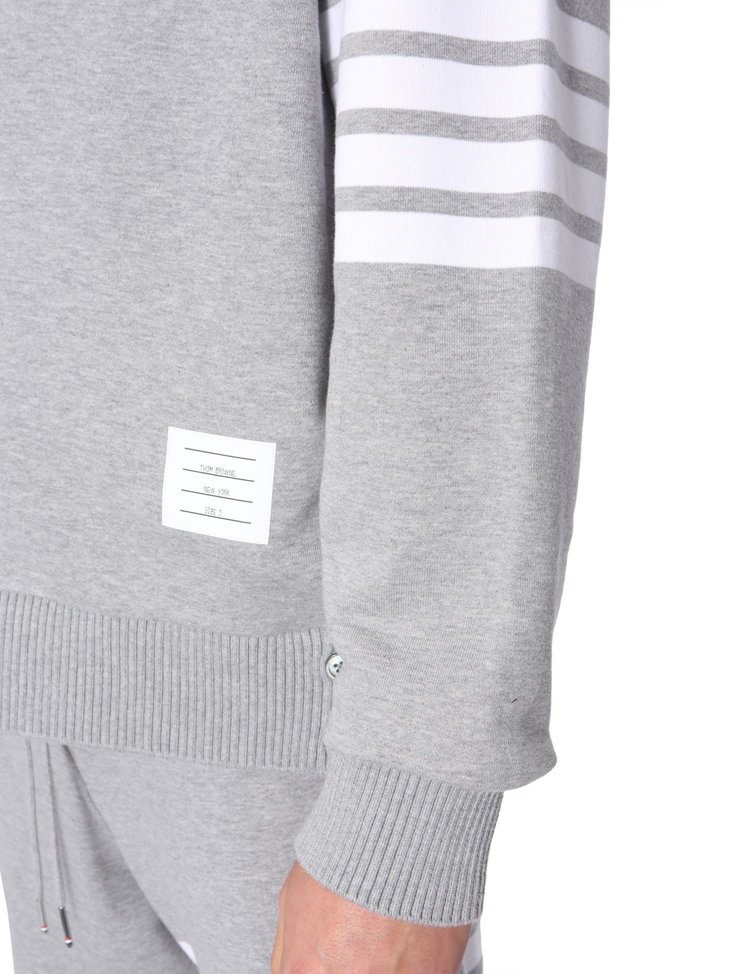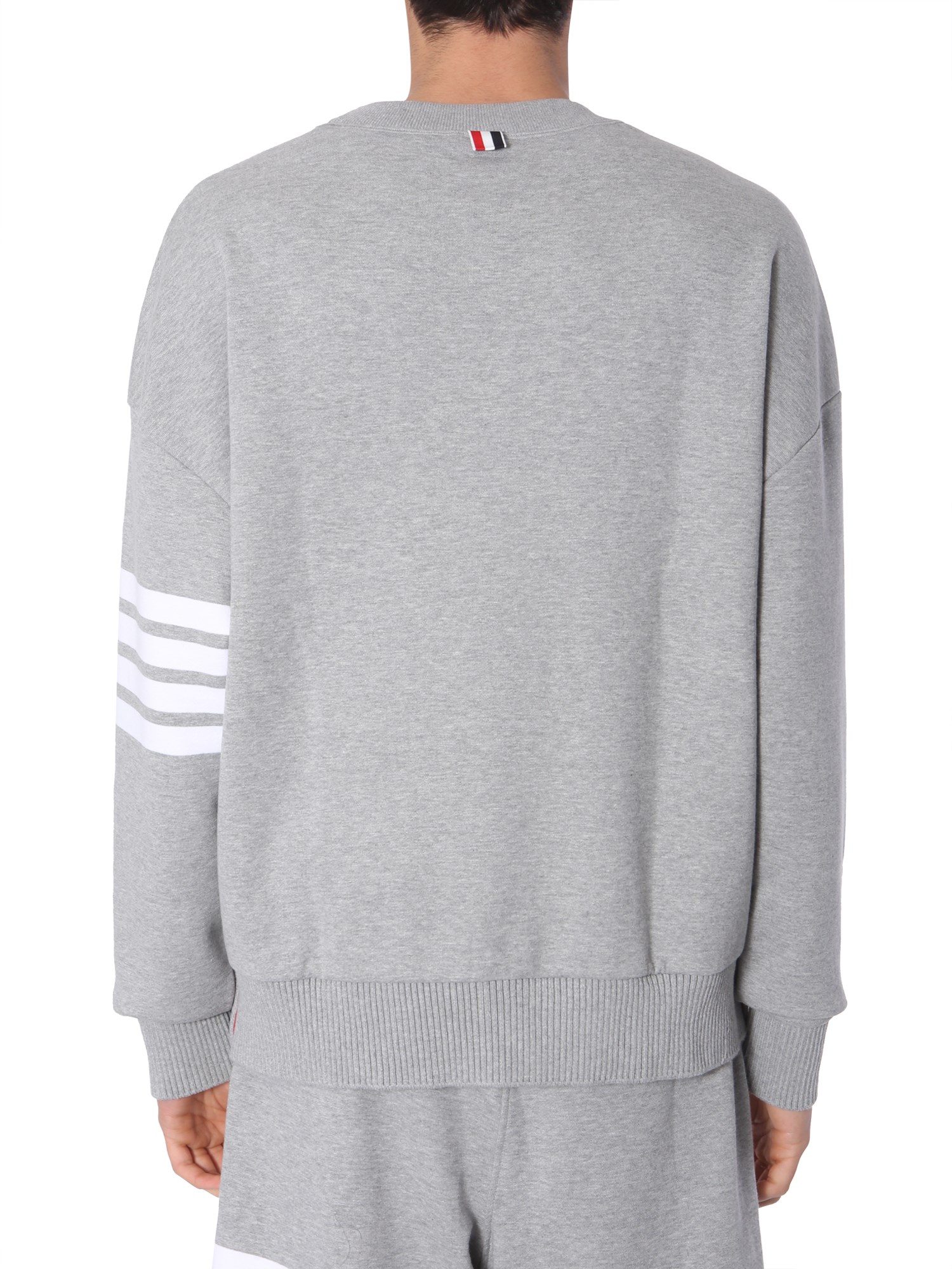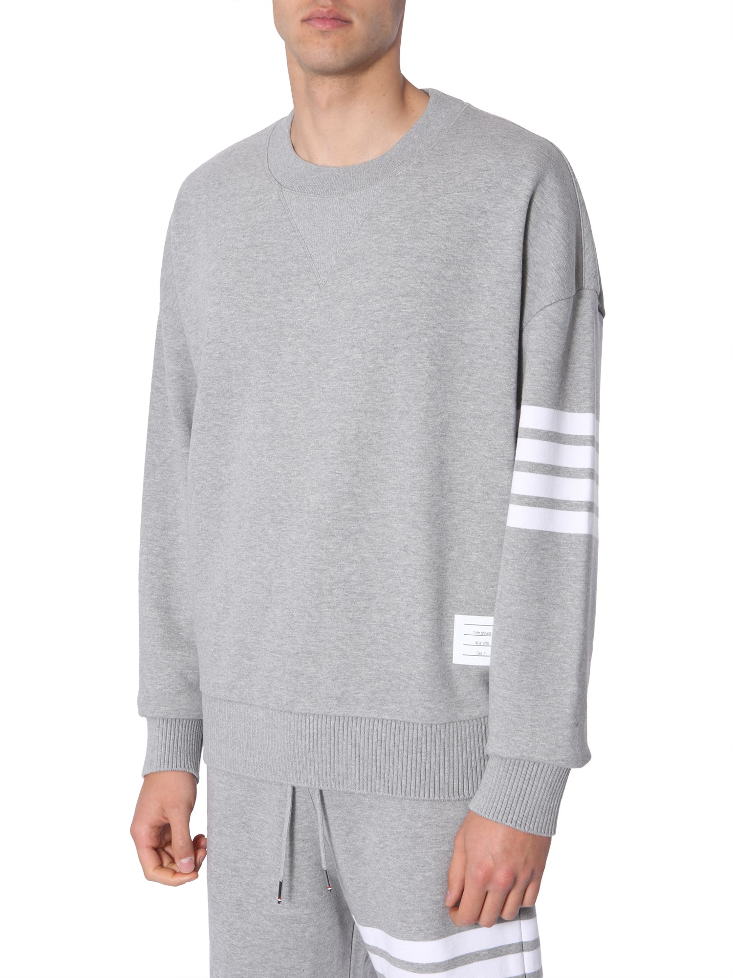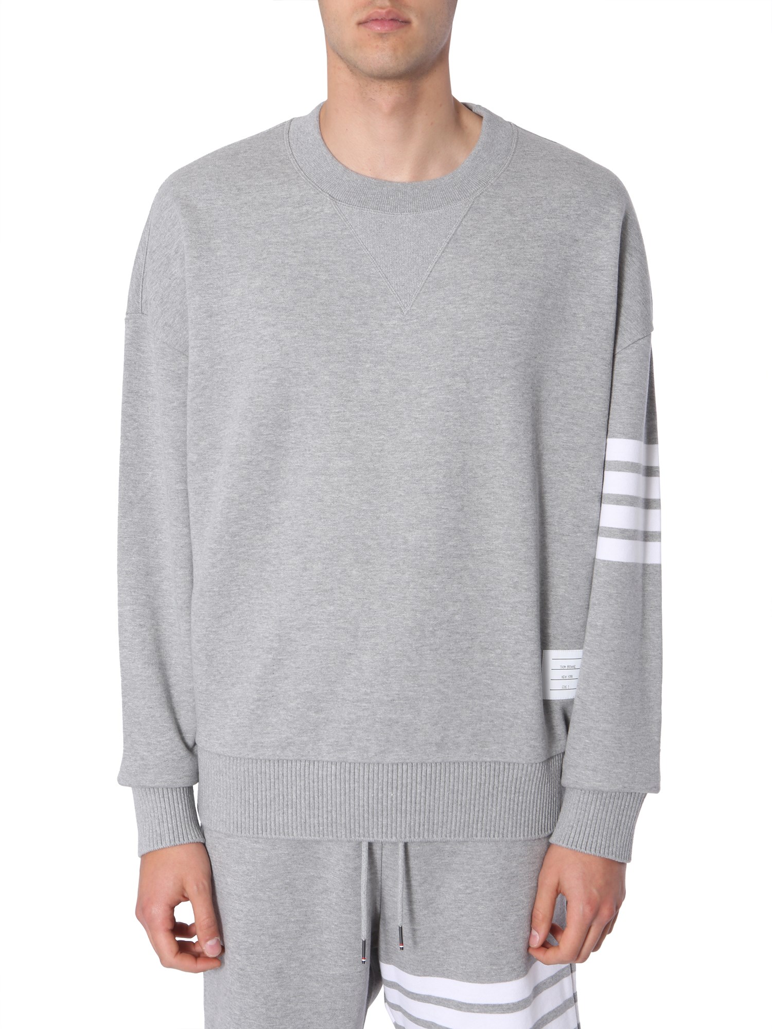 Upgrade your winter clothing with this crew neck sweatshirt from Thom Browne. The sweatshirt is designed in order to provide utmost comfort while maintaining your style quotient. This sweatshirt provides an oversized fit for a trendy and cool look. Pair it with grey trousers and sports shoes and you’re all set to enter your gym in style.