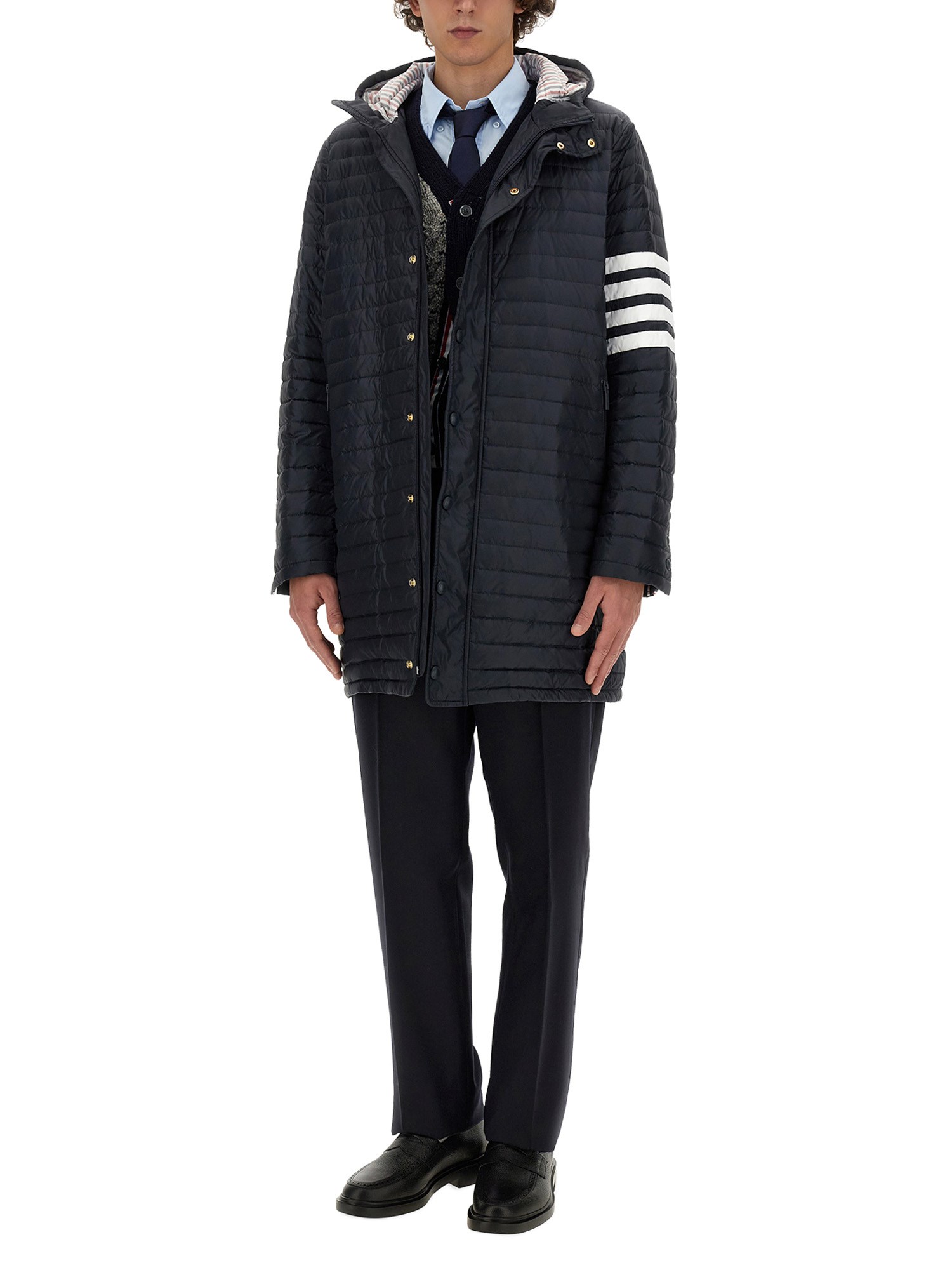 Beat the cold in style with the Thom Browne Hooded Tailoring Down Jacket. Whether you're running errands or heading out for a night on the town, this jacket will keep you looking chic and feeling cozy all day long.