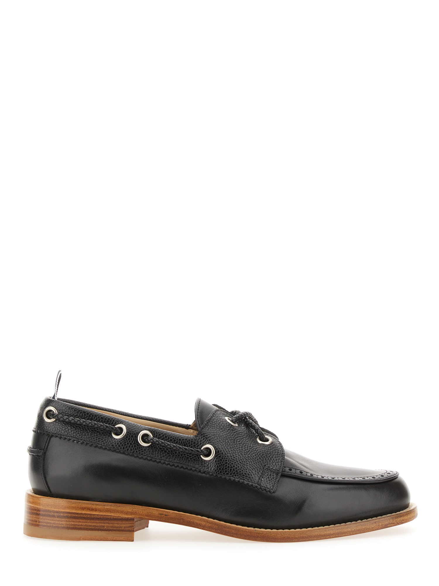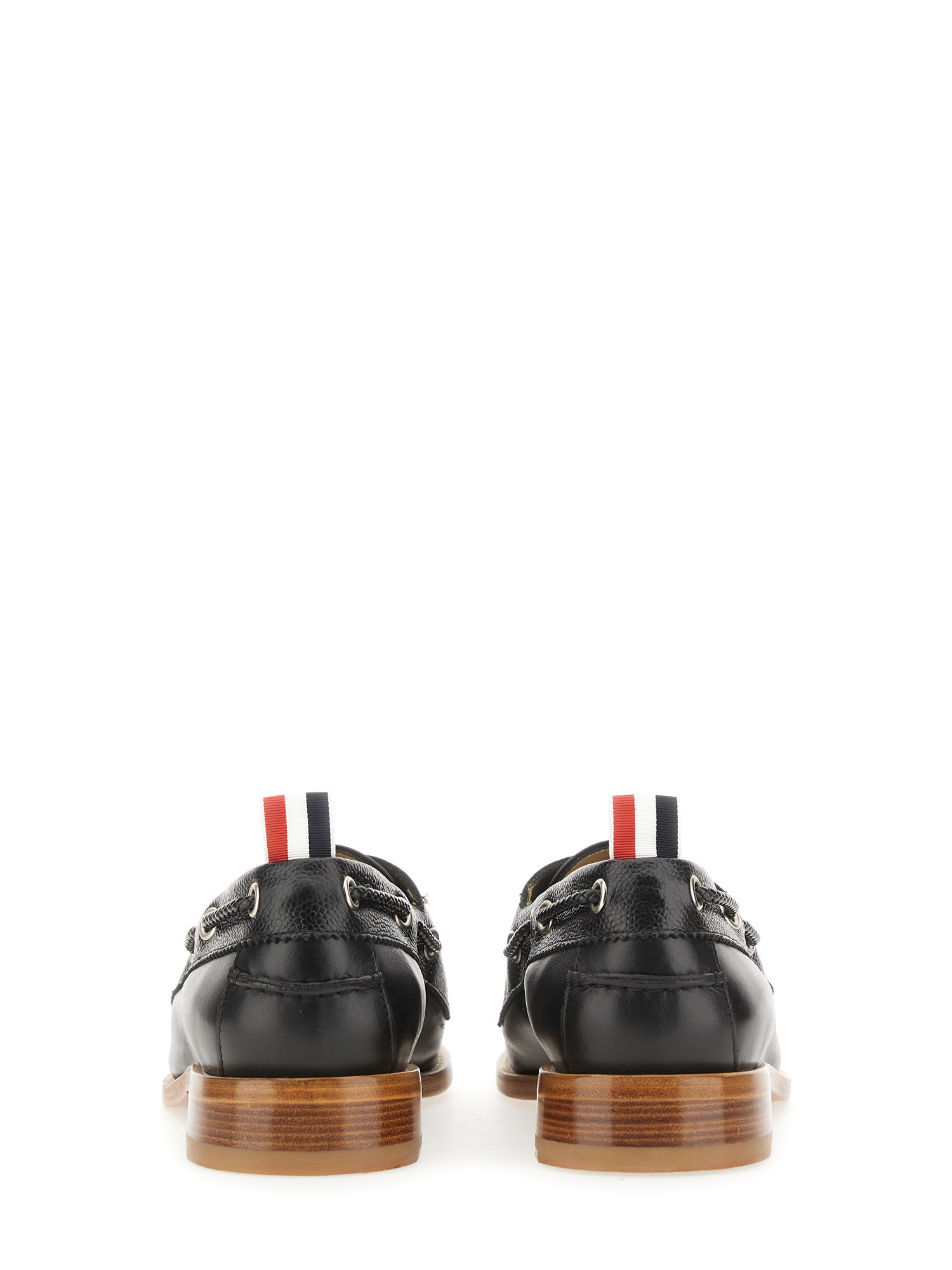 This brown leather moccasin from Thom Browne has a comfortable, durable, and stylish sole, a thick and soft leather upper, and a striped grosgrain ring. The lime perforated toe is a great detail that will make these shoes a go-to style. They are designed to be sleek and versatile for a look that will never go out of style.