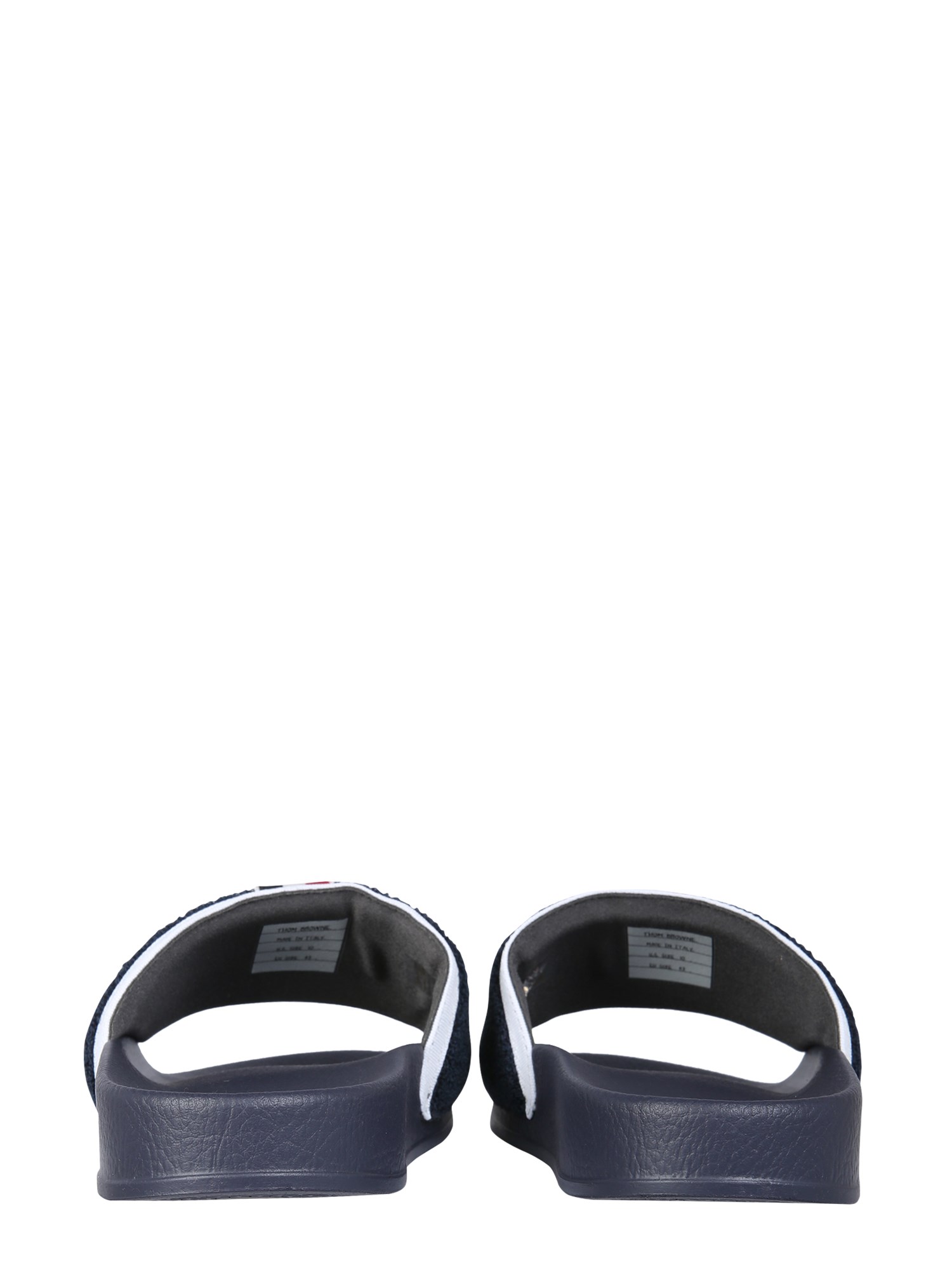 Escape the office to your next destination with these charming Thom Browne sandals. These slides are perfect for a day at the beach, or a day out in the city. These slides are made of 70% cotton and 30% rubber and are a great way to make a statement. The perfect pair of sandals for spring and summer.