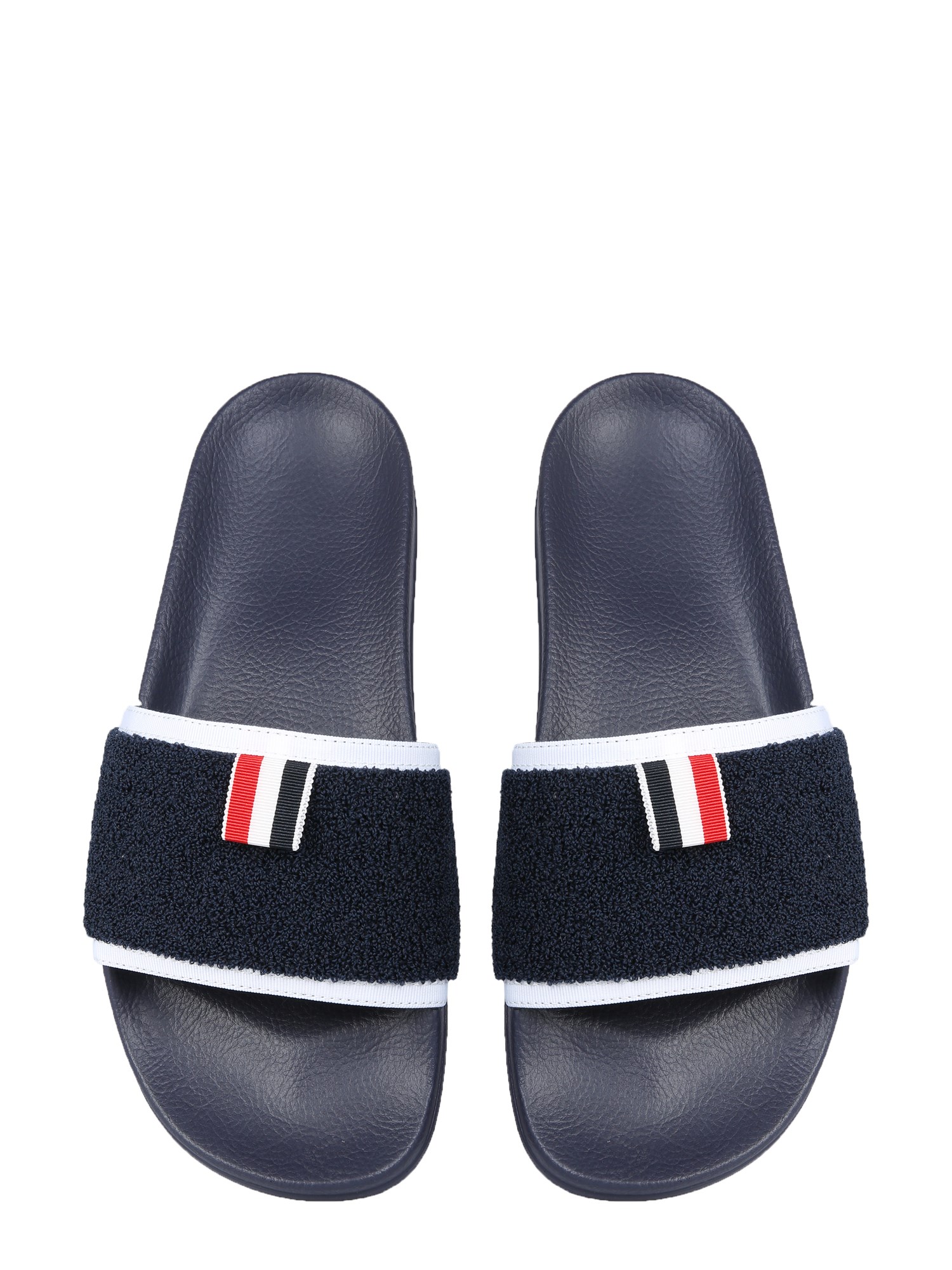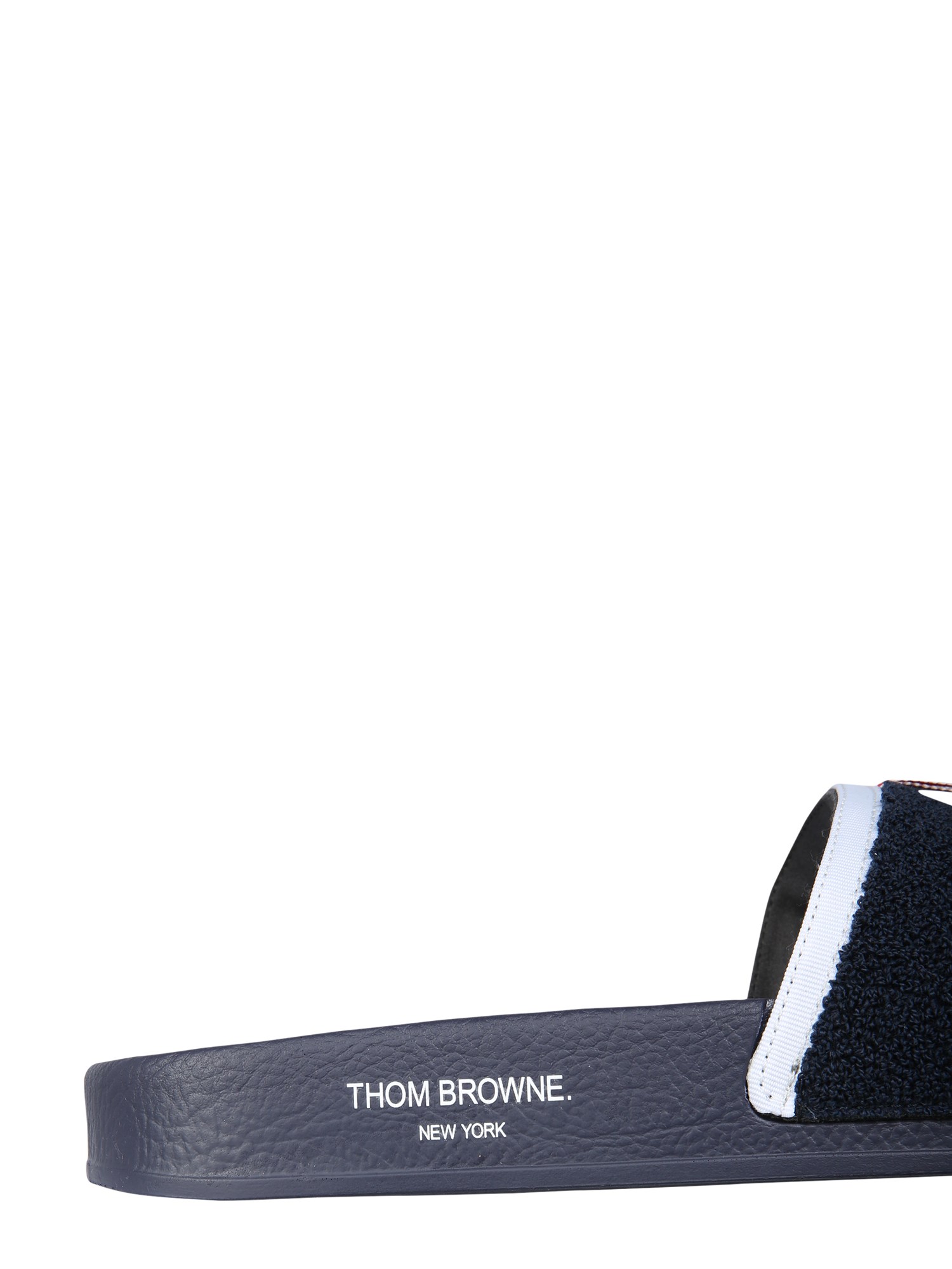 Escape the office to your next destination with these charming Thom Browne sandals. These slides are perfect for a day at the beach, or a day out in the city. These slides are made of 70% cotton and 30% rubber and are a great way to make a statement. The perfect pair of sandals for spring and summer.