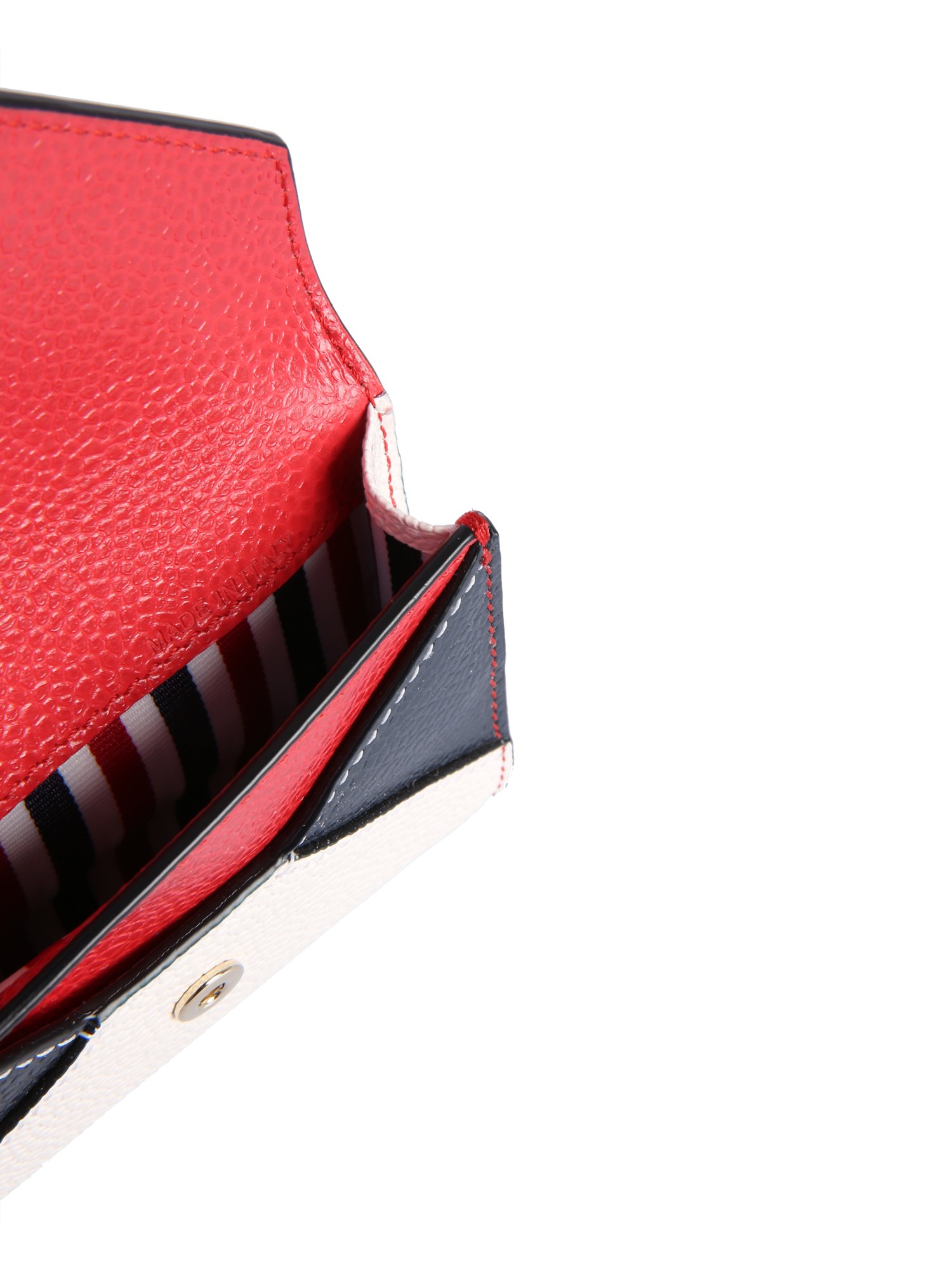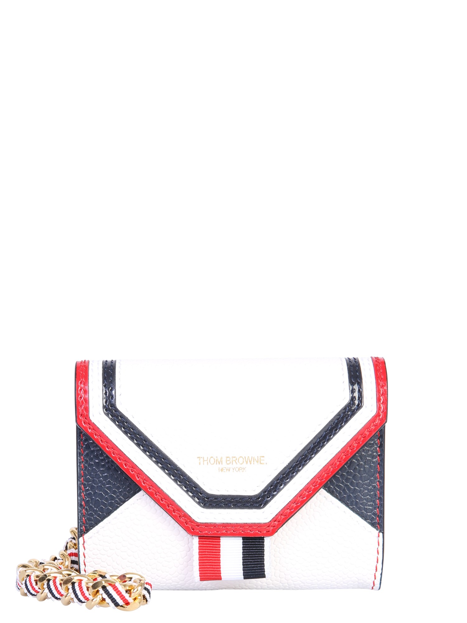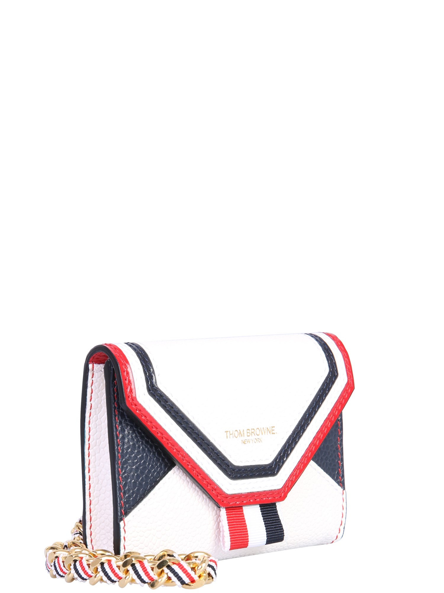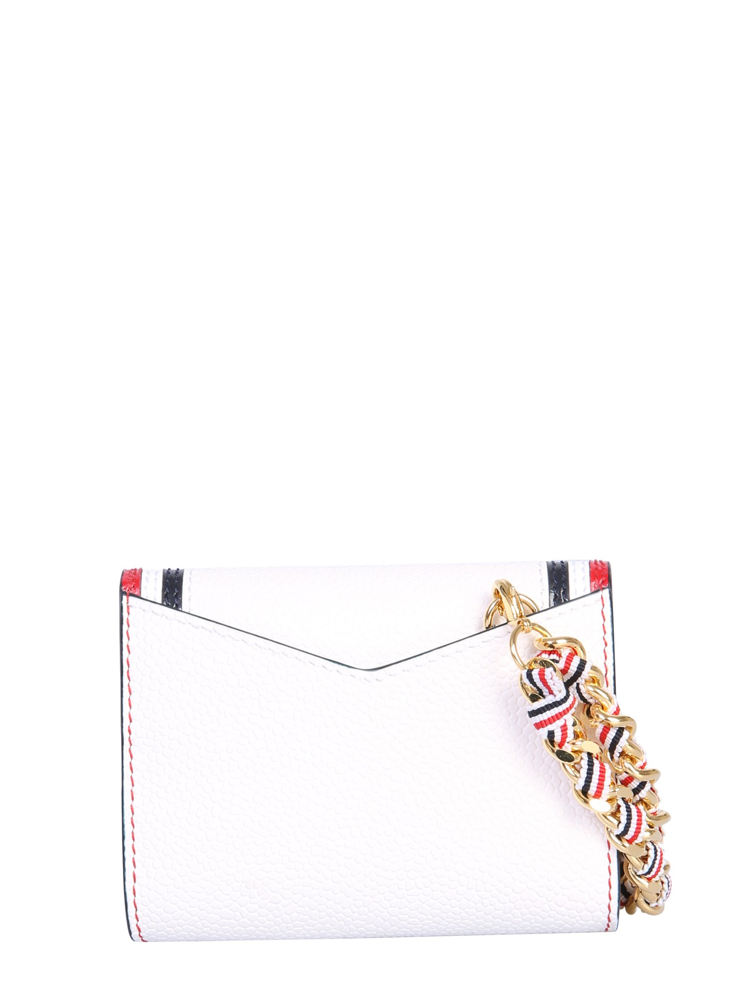 The wallet with logo by Thom Browne has a stylish design that also fulfils all practicality needs. The leather card holder is designed with two card slots. Made from genuine leather, it has textured surface decorated with a tricolour tag. It can be easily carried with the fancy chain shoulder strap.