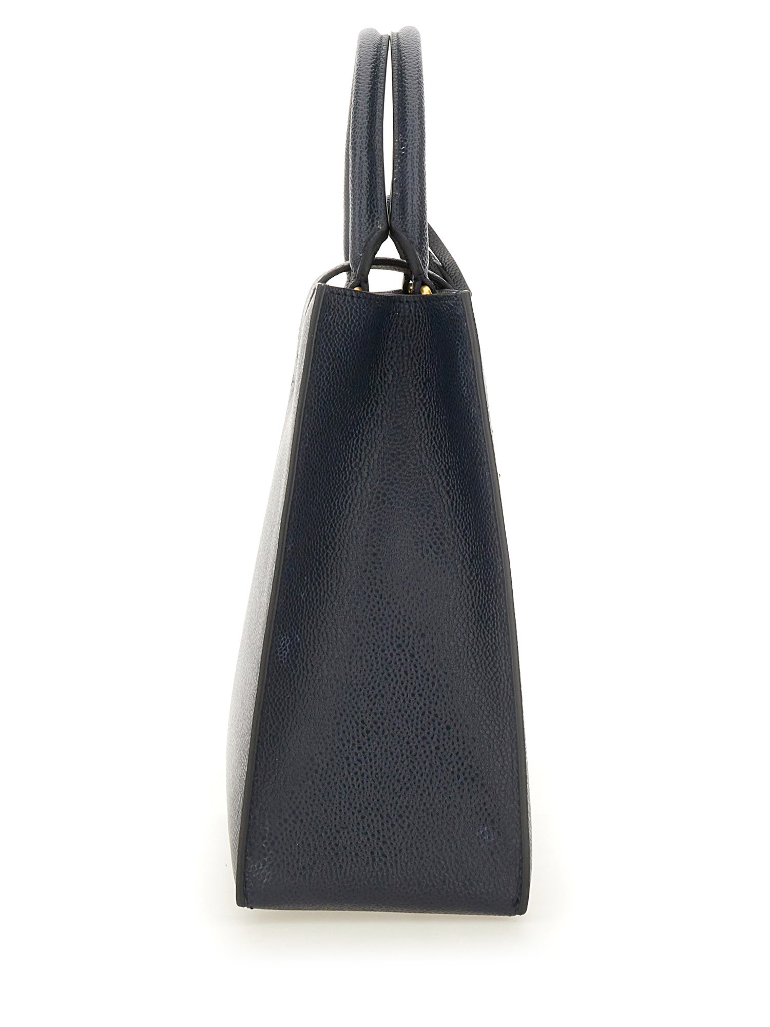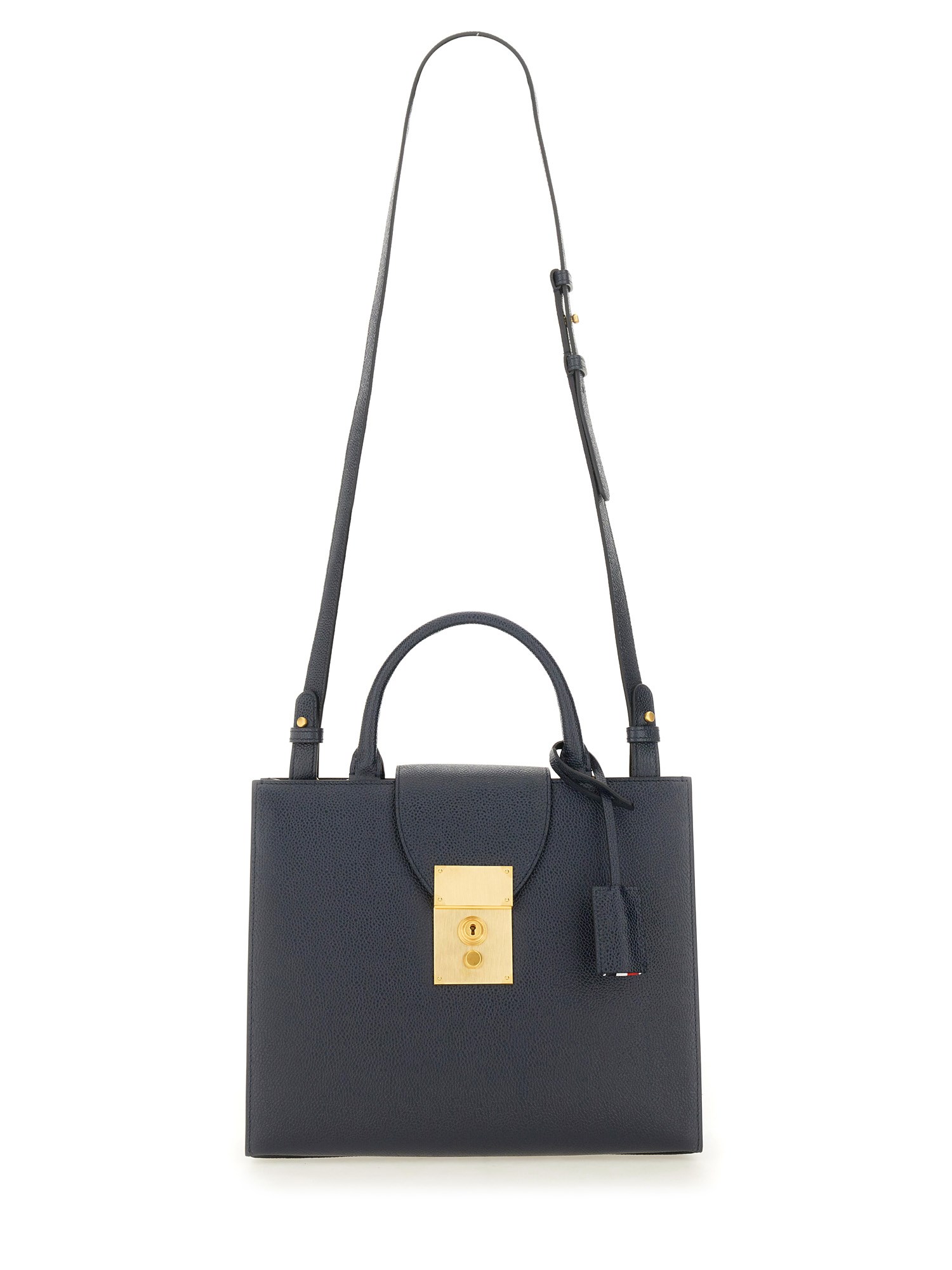 Introducing the MR. THOM Small Leather Bag from Thom Browne, crafted from luxurious pebble grain leather. This versatile bag features a convenient crossbody strap for hands-free wear, as well as dual grab handles for easy carrying. Stay stylish and organized on the go with this sleek and timeless accessory.