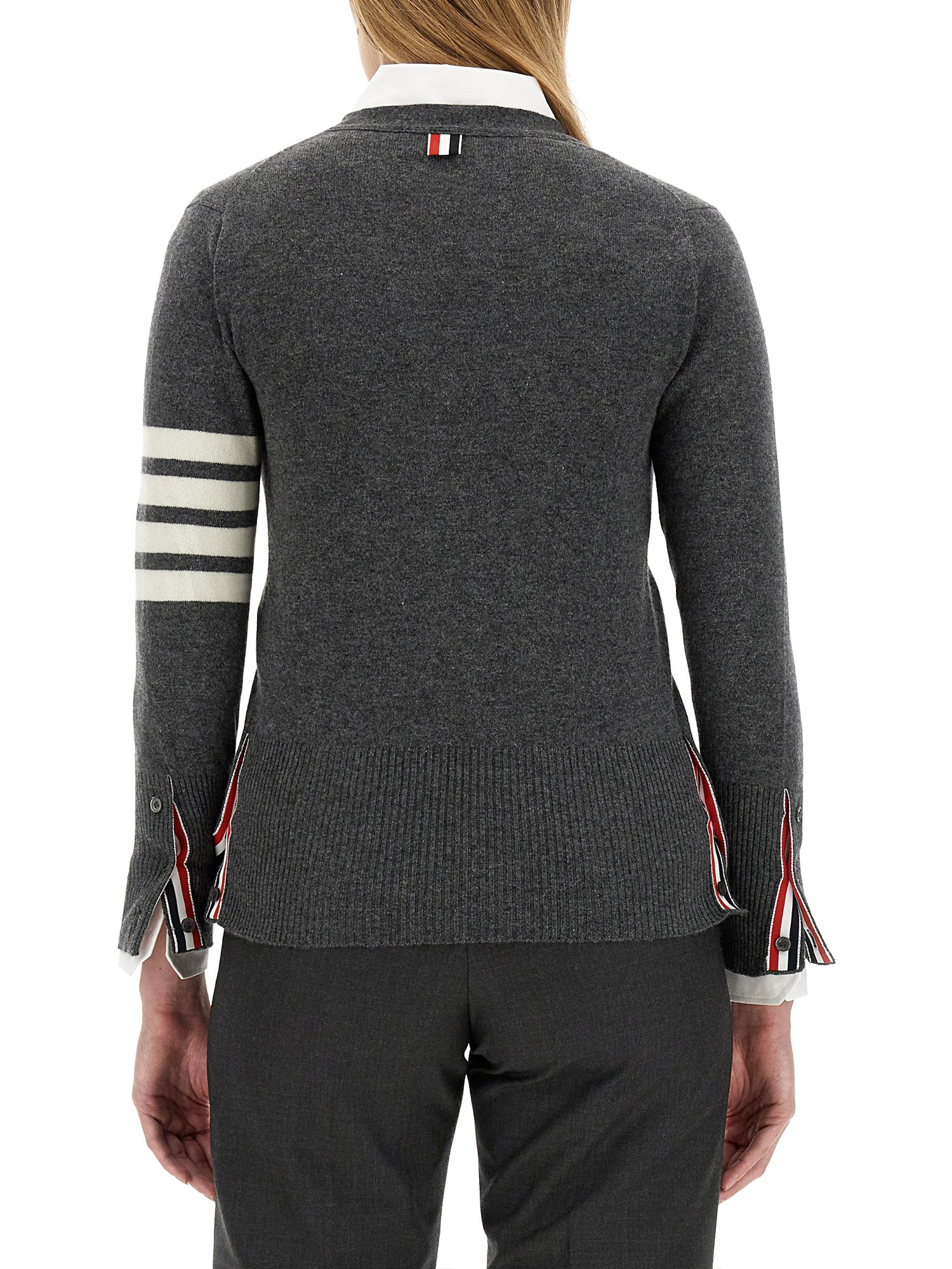 This V-neck grey classic cashmere cardigan from Thom Browne is a timeless addition to any wardrobe. Made from luxurious cashmere, it offers both comfort and style. The V-neck design adds a touch of elegance, while the grey colour makes it versatile and easy to pair with any outfit. Whether you're dressing up for a formal occasion or keeping it casual, this cardigan is a must-have for any fashion-conscious individual. Stay cosy and chic with this classic cashmere cardigan.