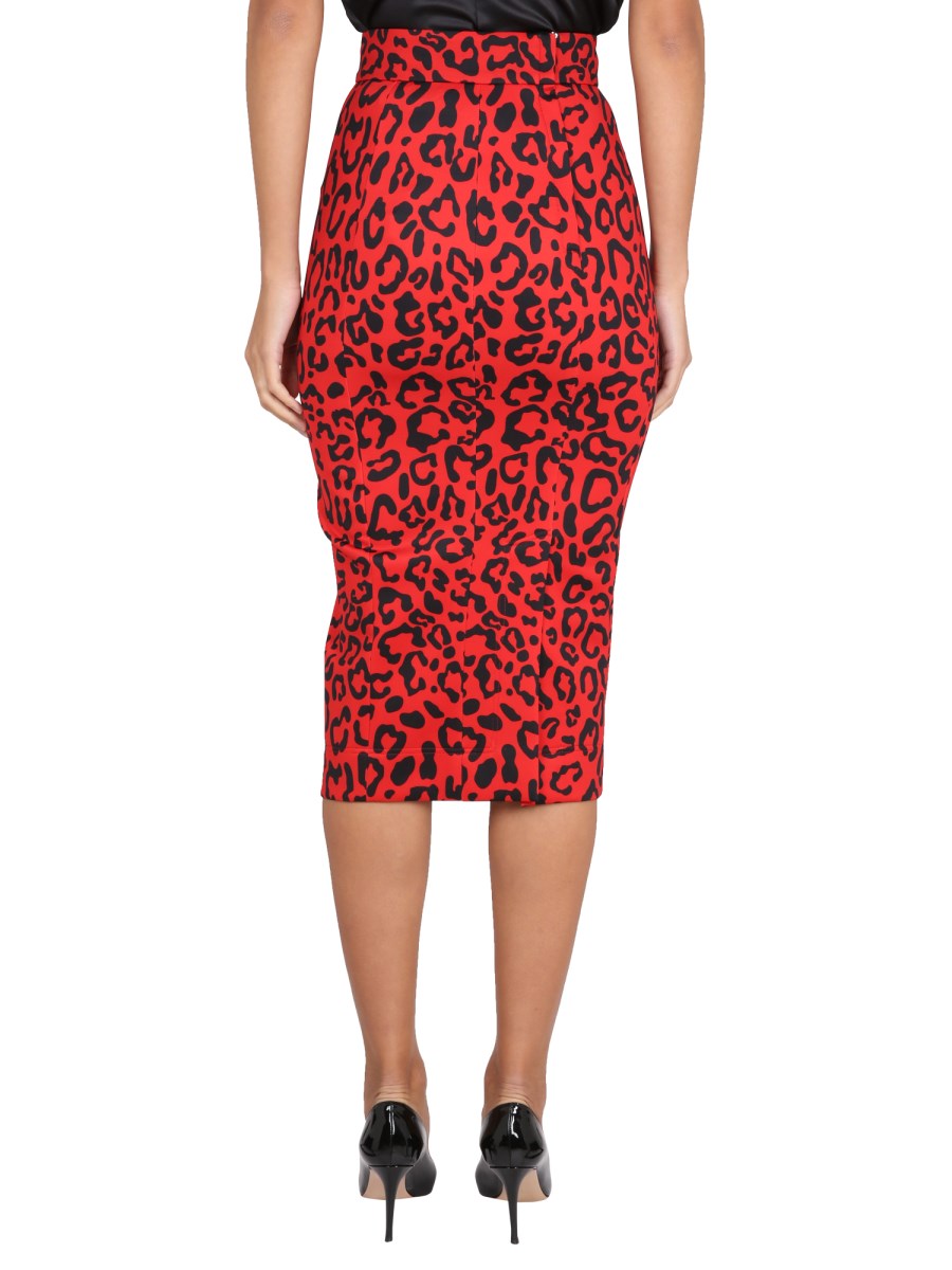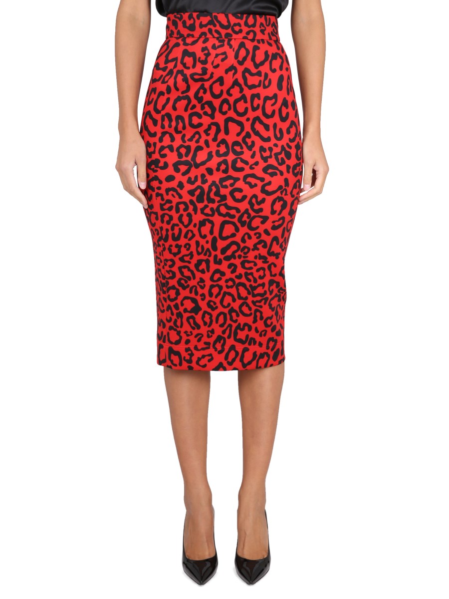 This high waist skirt from Dolce & Gabbana features a back zipper, hook-eye closure, and all over leopard print. It is made of a polyester blend with a stretch knit jersey fabric. This skirt is perfect for the office or any casual occasion. This skirt is also made with a straight hem.