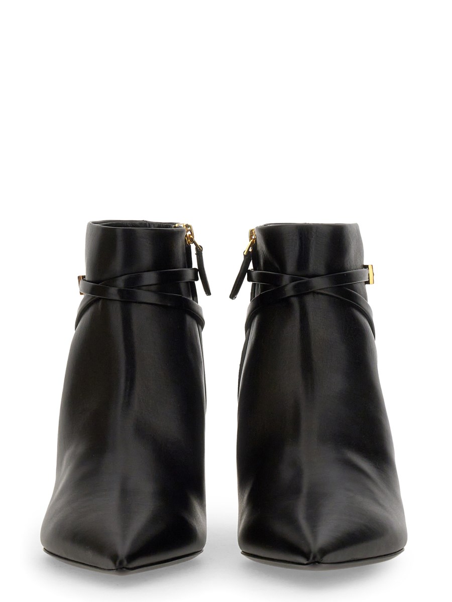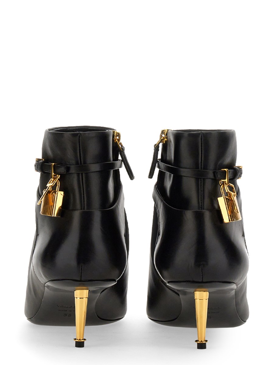 This handmade Padlock boot from Tom Ford is designed to be worn on your foot. The brown leather upper padlock boot is crafted with a smooth, clean finish and a slim, modern silhouette. The heel is slightly raised and the foot is padded to provide comfort and support.