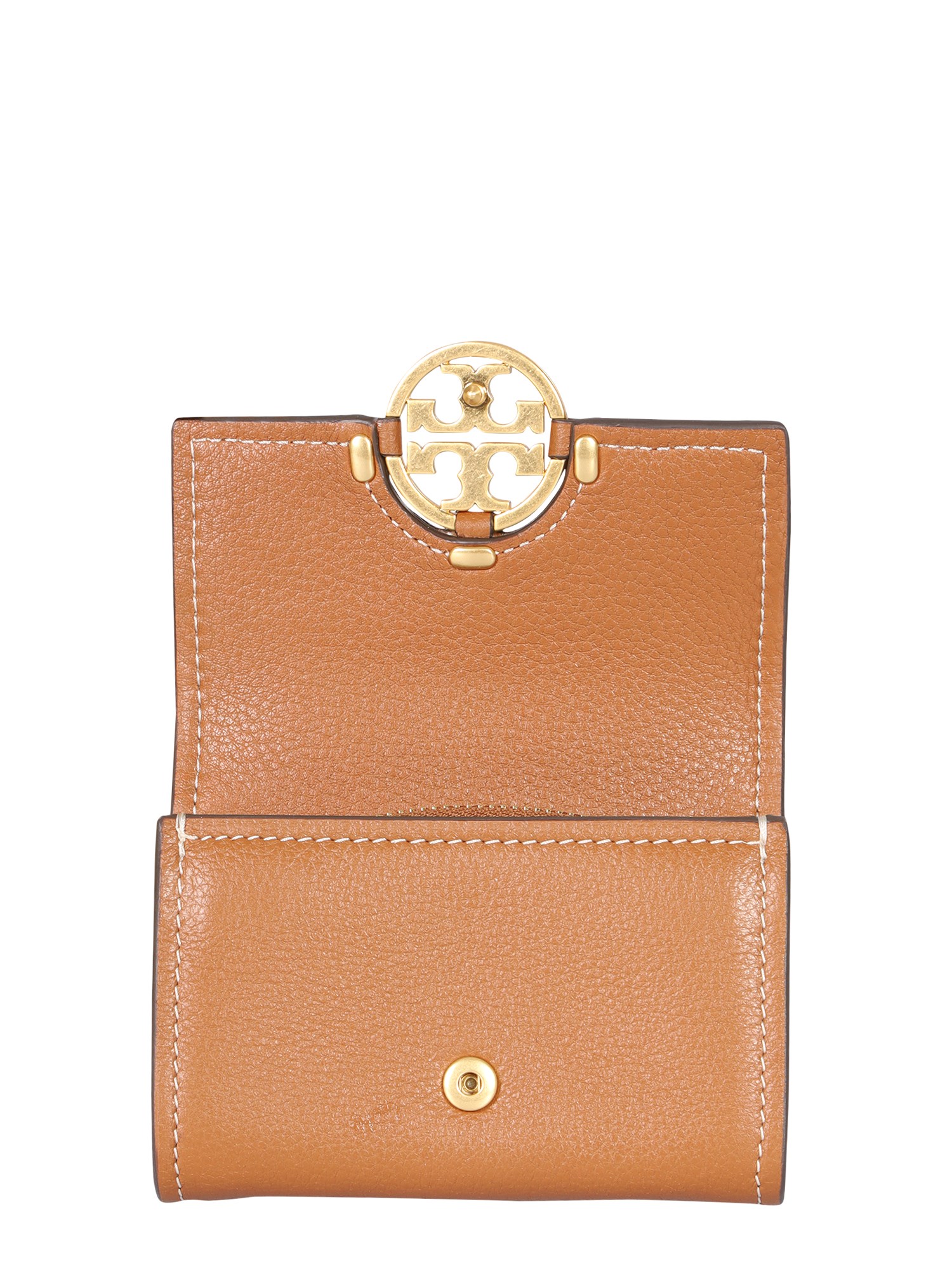 Made of full-grain leather, the Miller mini wallet from the house of Tory Burch is a small and practical wallet for carrying your most important cards and cash. It has three card slots and a zippered pocket with a snap button closure. The leather wallet has an iconic logo on the front.