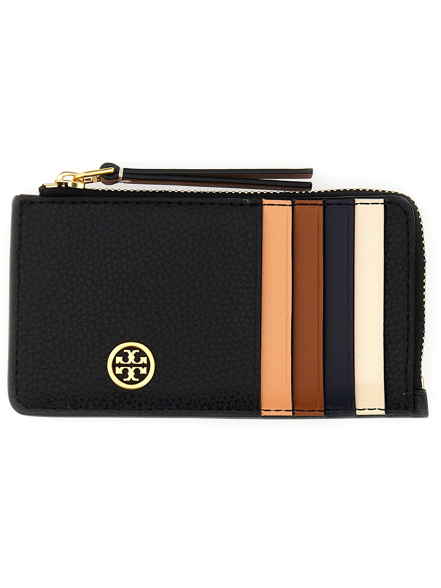 This compact yet functional card holder from Tory Burch is designed with convenience and style in mind. Secured with a durable zipper closure, your cards and cash will always be safe and protected. Featuring multiple card slots, this card holder has ample space to store all your essential cards, such as credit cards, IDs, and even business cards.