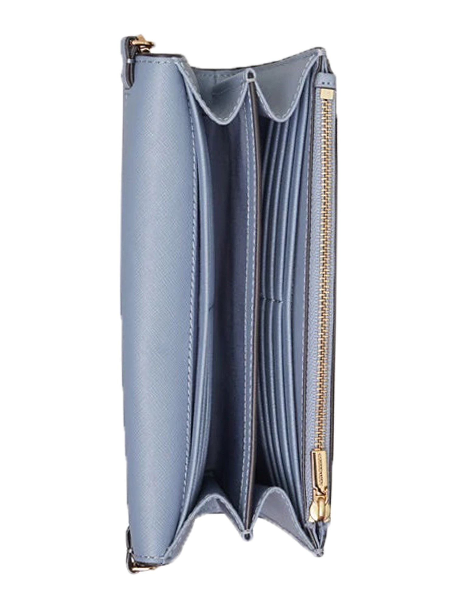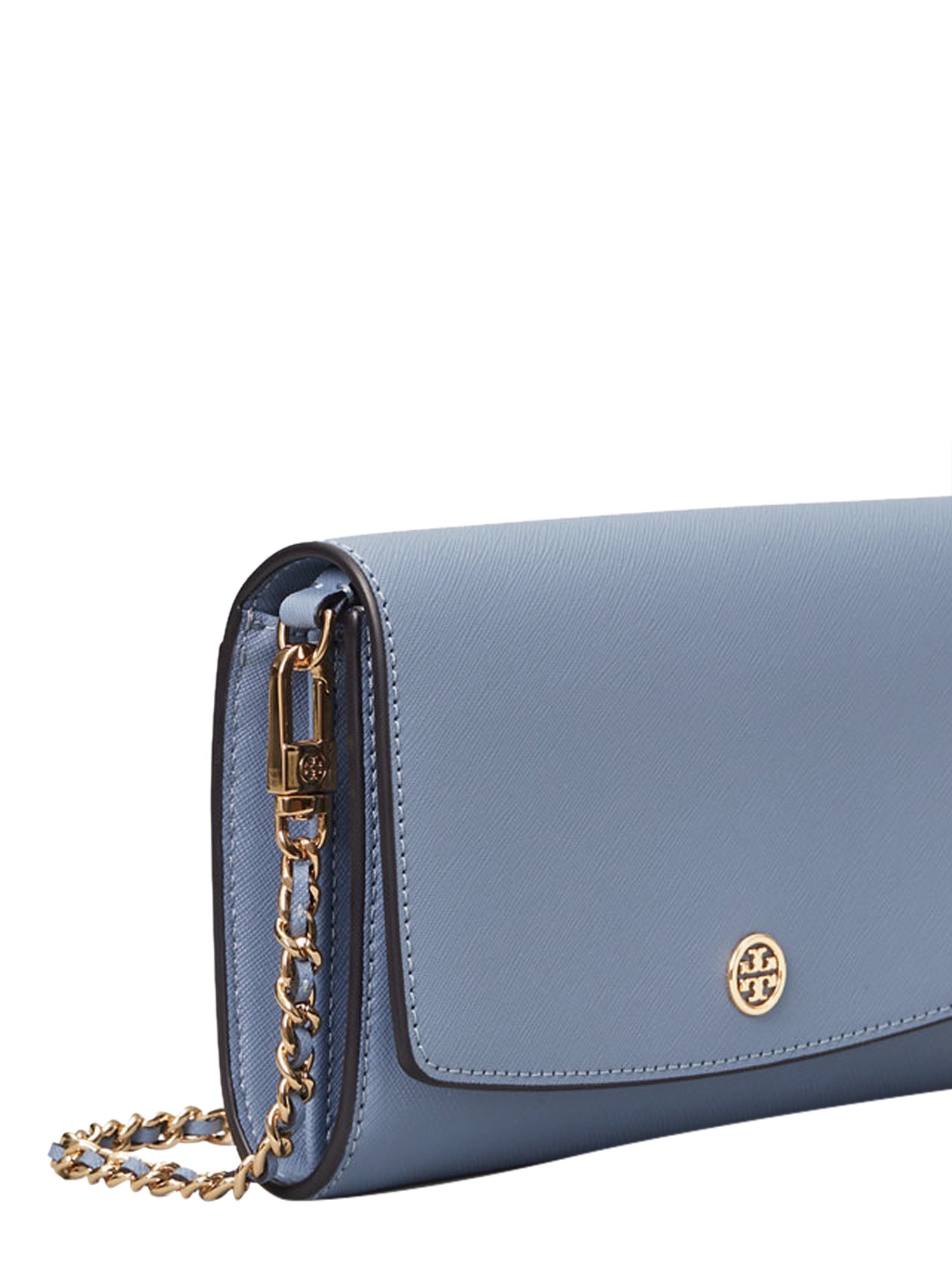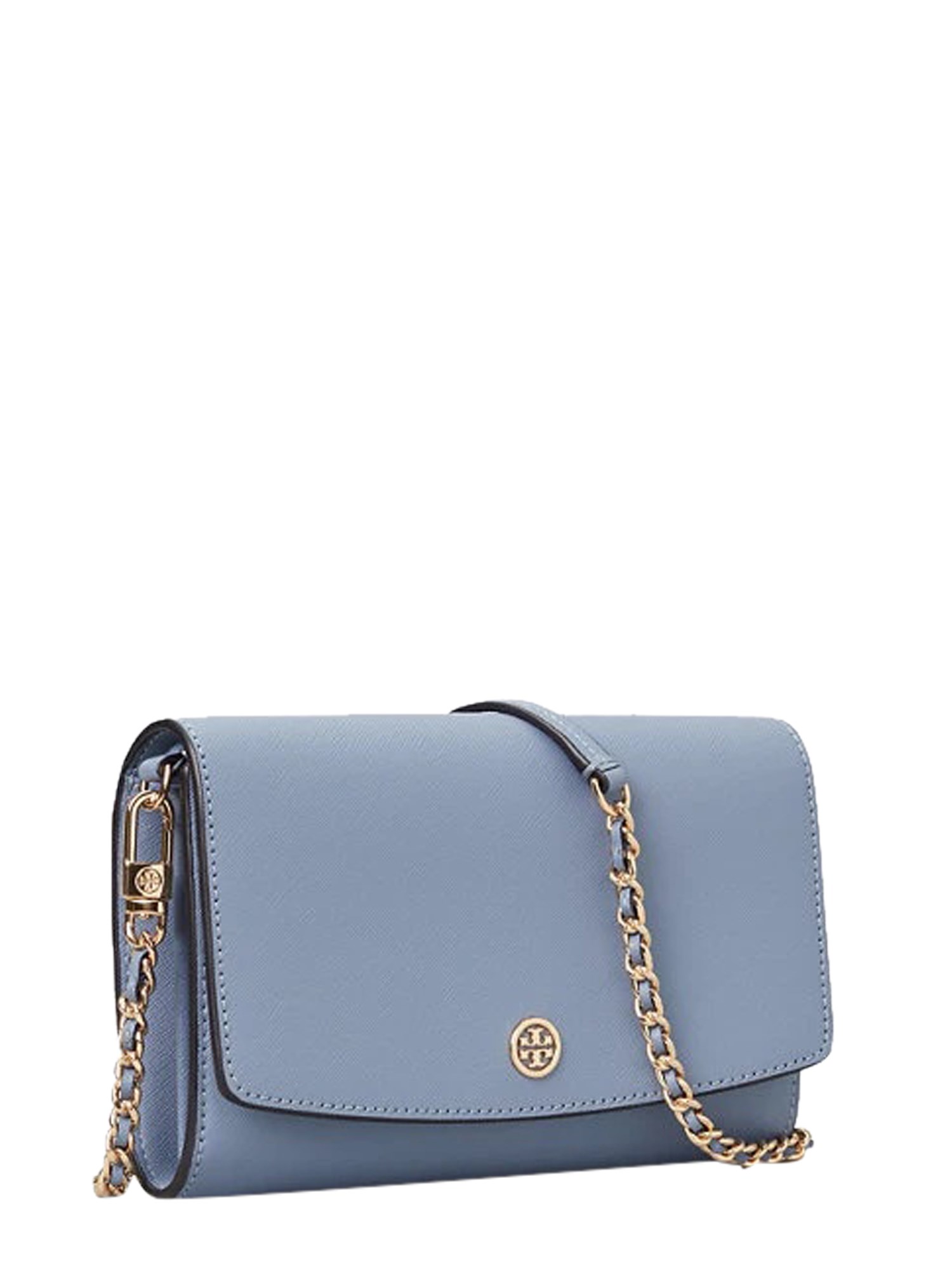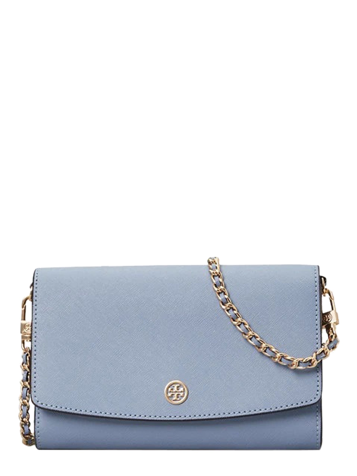 This mini Robinson Saffiano Leather Crossbody bag from Tory Burch is a must-have in your accessory collection. It has a detachable chain shoulder strap accompanied by matching leather inserts. The lined inner has twenty card compartments, two pockets and one zip pocket, all secured with automatic button closure. This bag also has an outer pocket for extra storage.
