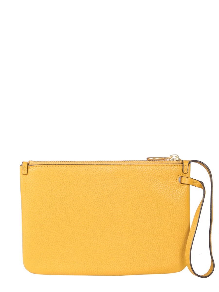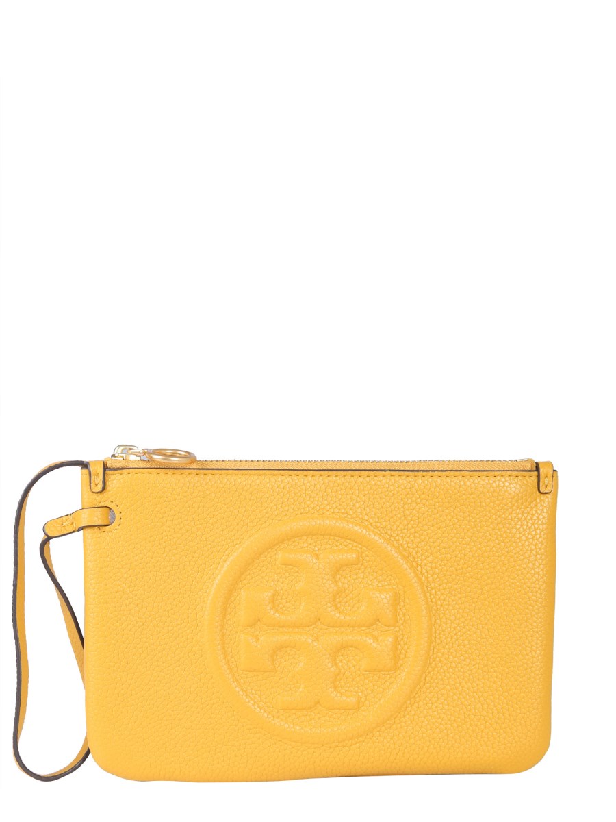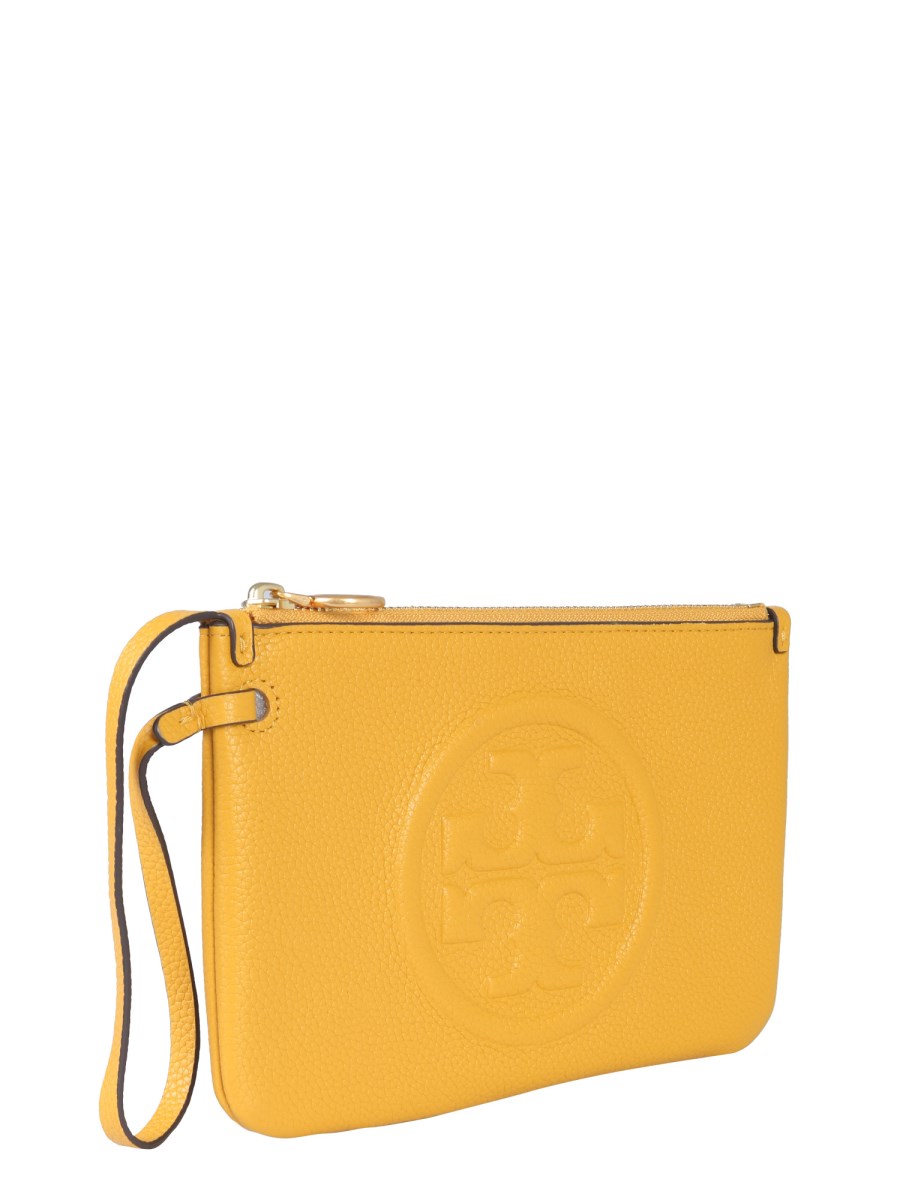 Carry your essentials in style by using this perry bombe clutch from Tory Burch. The clutch is made from lightweight leather that provides a soft and smooth surface. It features a zip closure and a leather tag to carry it easily. The embossed logo detailing on the front lend it a finishing touch.