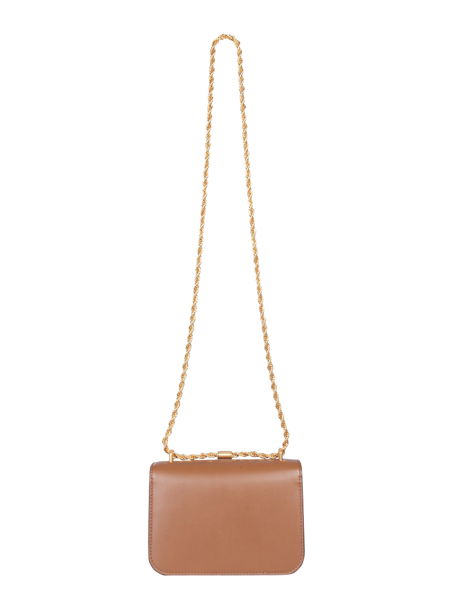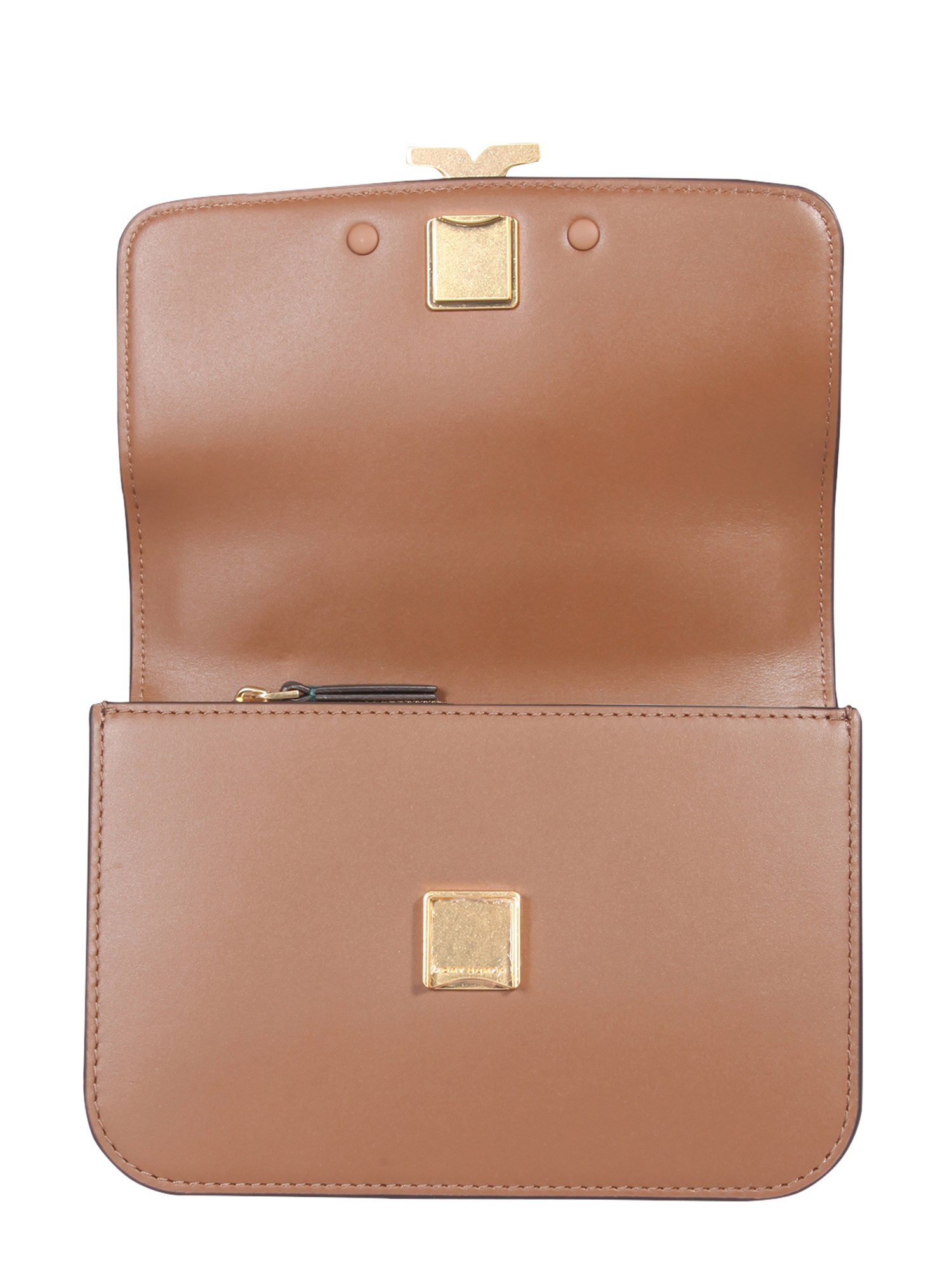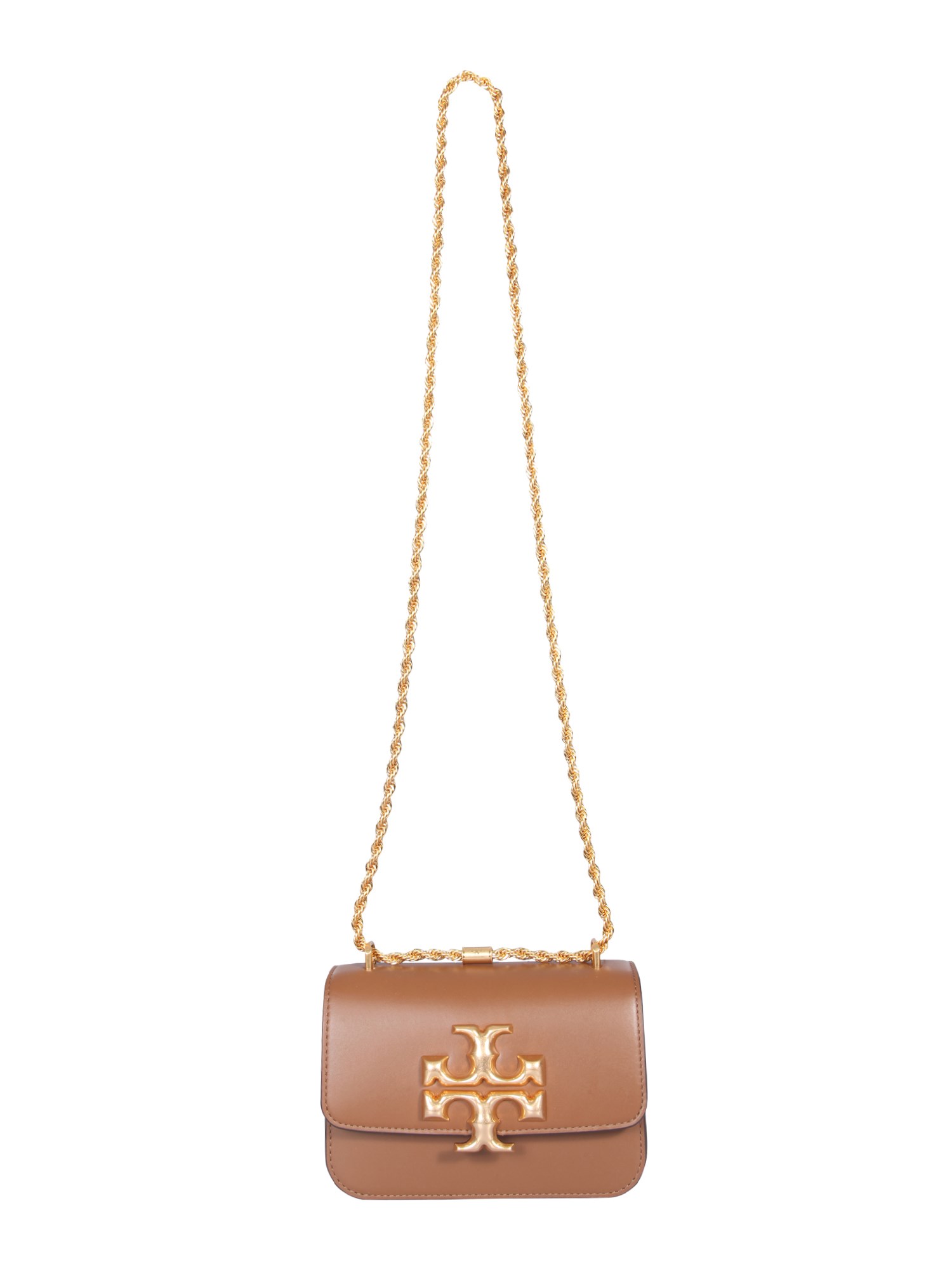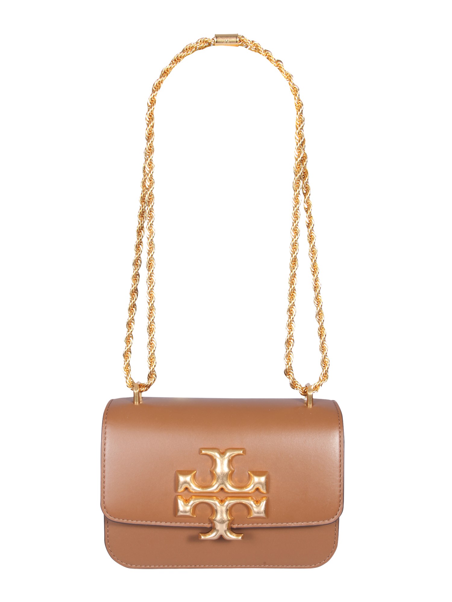 This is a small brown bag from Tory Burch that has been made of calf leather. The front snap closure makes it easy to close, while the iconic logo gives it a sense of style. Made from calf leather and has a small interior pocket for your essentials. The calf leather is a popular choice for handbags because it is supple, durable, and easy to maintain.